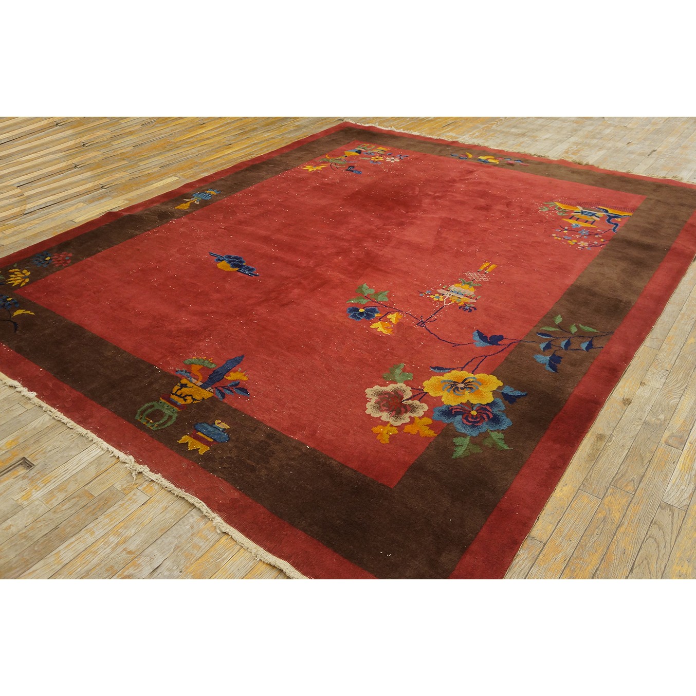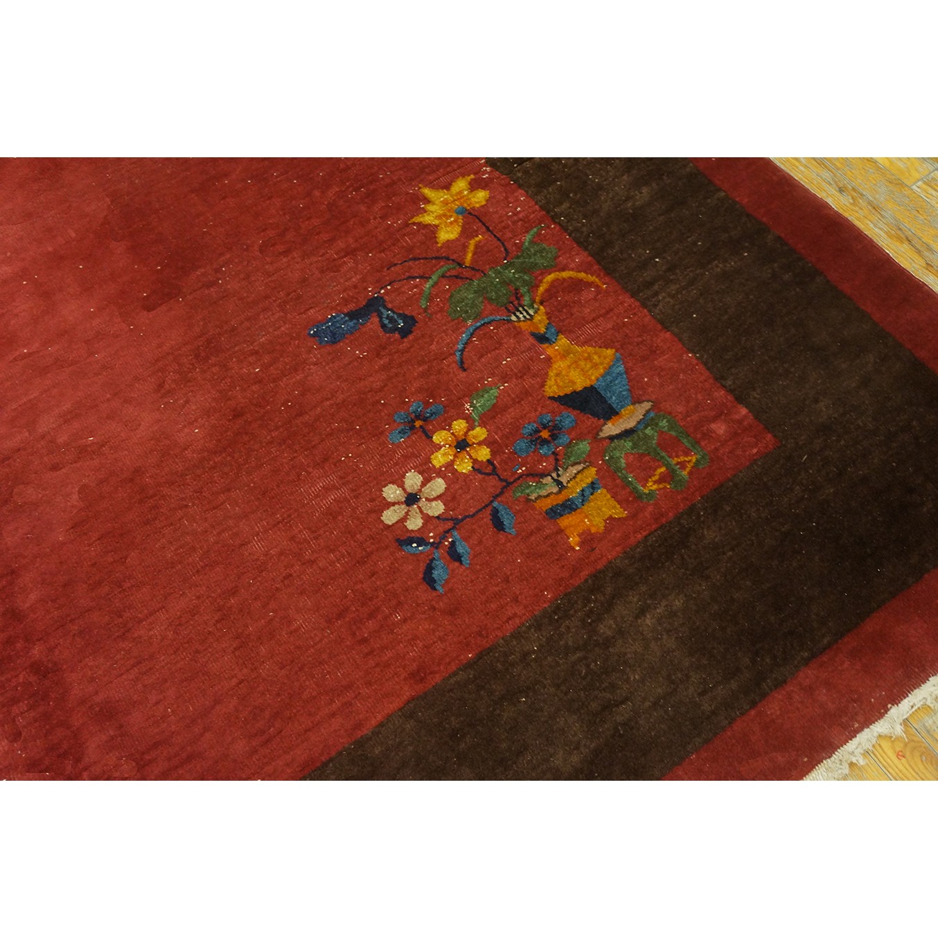 DescriptionChineseCarpets made in China proper. See entries Ningshia, Peking, Art Deco. Chinese - Art DecoAs the name implies, pieces woven between the wars for the Western market by mostly American owned firms especially Nichols and Fette, in thick heavy weaves using strong colors, asymmetric patterns and downplaying the Chinese-ness of the carpet. Nichols rugs are more strong toned than the pastel Fette. Most were woven in the coastal port city of Tientsin. Other lesser known workshops were also active. Some pieces are ultra-geometric and haute-Deco moderne in character: these are very rare. More frequent are pieces with bits of Chinese ornament: vases or other precious objects, paeonies, vines, fences, etc. Most common is the 9 x 12 size, in colors never found in mainstream Chinese rugs: backgrounds in black, mauve, purple, hot pink, orange, olive, employing the best synthetic chrome dyes of the period. Prices are still reasonable and carpets in top condition are available. | |