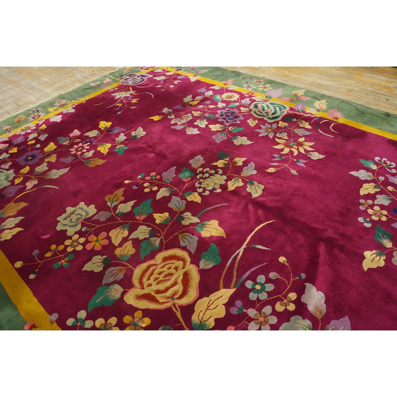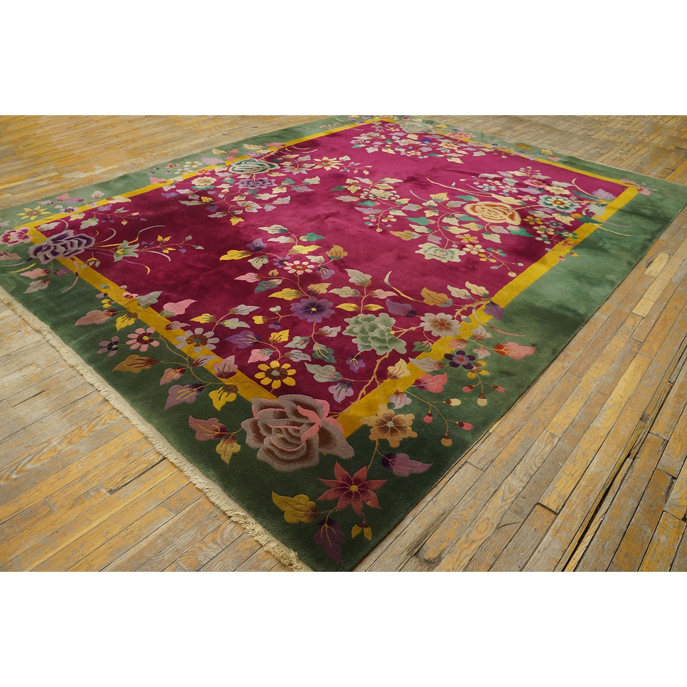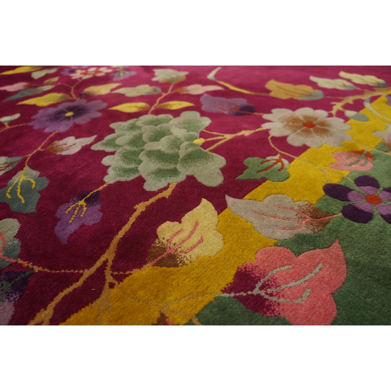 DescriptionChineseCarpets made in China proper. See entries Ningshia, Peking, Art Deco. Chinese - Art DecoAs the name implies, pieces woven between the wars for the Western market by mostly American owned firms especially Nichols and Fette, in thick heavy weaves using strong colors, asymmetric patterns and downplaying the Chinese-ness of the carpet. Nichols rugs are more strong toned than the pastel Fette. Most were woven in the coastal port city of Tientsin. Other lesser known workshops were also active. Some pieces are ultra-geometric and haute-Deco moderne in character: these are very rare. More frequent are pieces with bits of Chinese ornament: vases or other precious objects, paeonies, vines, fences, etc. Most common is the 9 x 12 size, in colors never found in mainstream Chinese rugs: backgrounds in black, mauve, purple, hot pink, orange, olive, employing the best synthetic chrome dyes of the period. Prices are still reasonable and carpets in top condition are available. | |