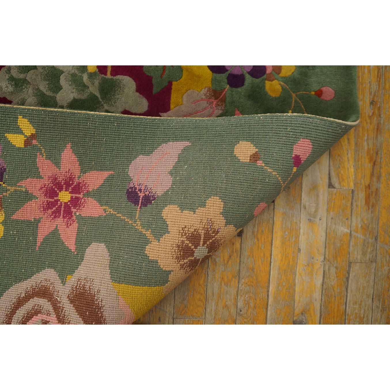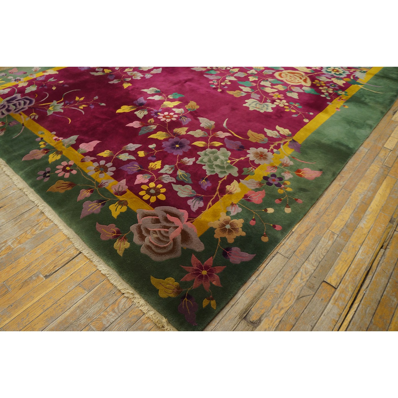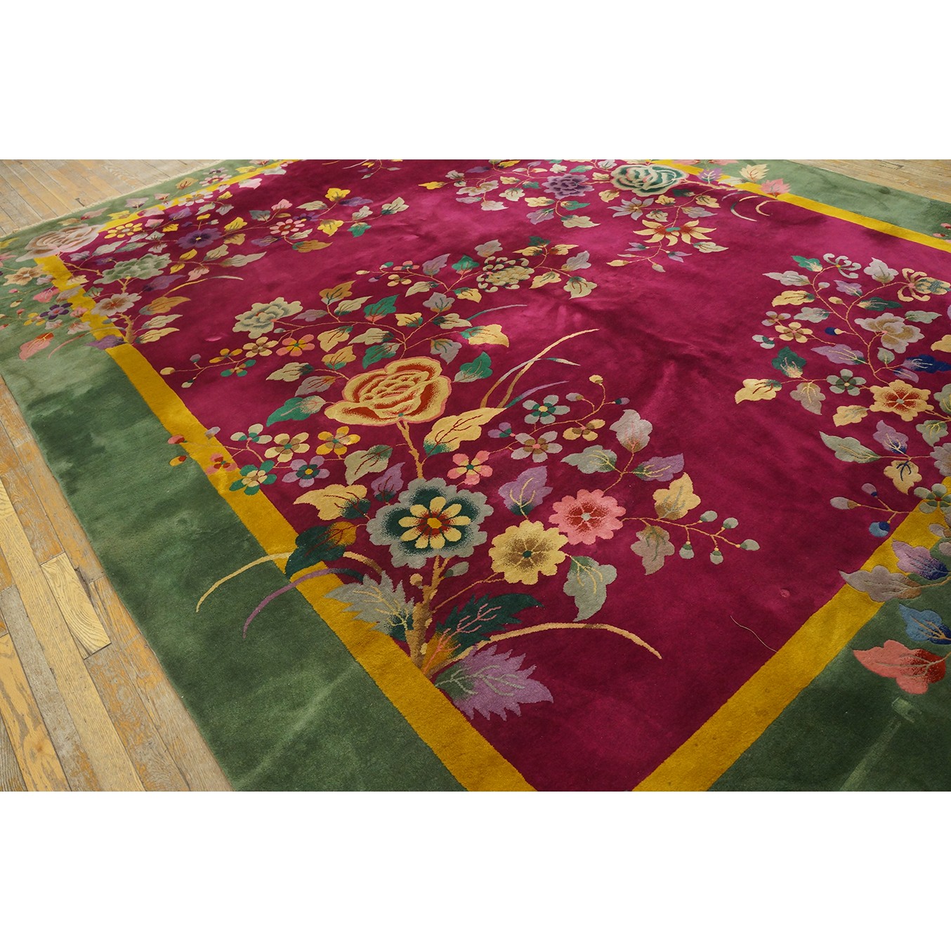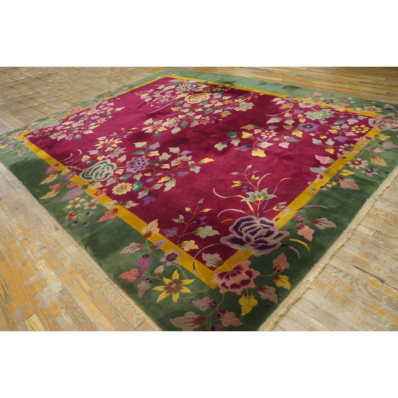 DescriptionChineseCarpets made in China proper. See entries Ningshia, Peking, Art Deco. Chinese - Art DecoAs the name implies, pieces woven between the wars for the Western market by mostly American owned firms especially Nichols and Fette, in thick heavy weaves using strong colors, asymmetric patterns and downplaying the Chinese-ness of the carpet. Nichols rugs are more strong toned than the pastel Fette. Most were woven in the coastal port city of Tientsin. Other lesser known workshops were also active. Some pieces are ultra-geometric and haute-Deco moderne in character: these are very rare. More frequent are pieces with bits of Chinese ornament: vases or other precious objects, paeonies, vines, fences, etc. Most common is the 9 x 12 size, in colors never found in mainstream Chinese rugs: backgrounds in black, mauve, purple, hot pink, orange, olive, employing the best synthetic chrome dyes of the period. Prices are still reasonable and carpets in top condition are available. | |