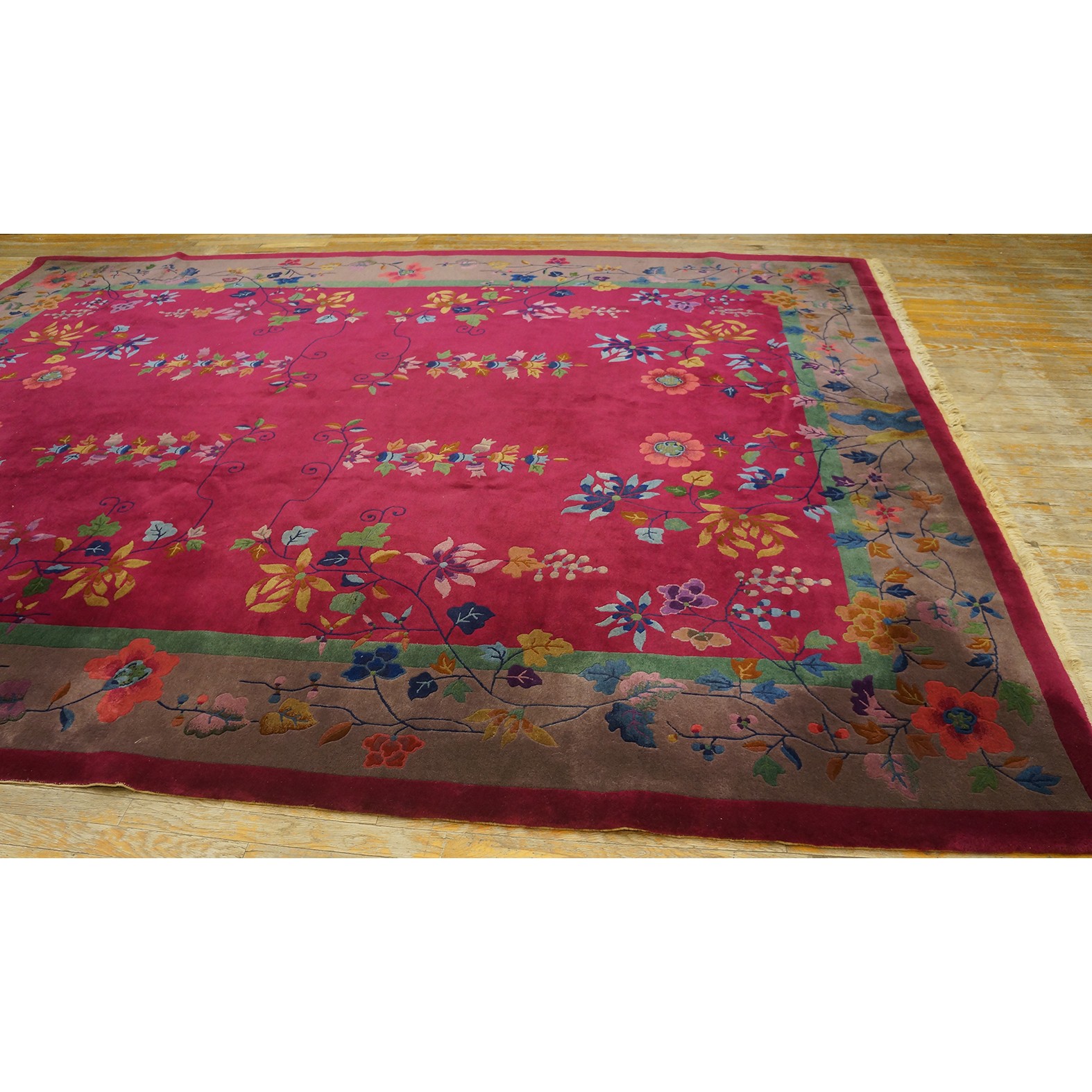 DescriptionChineseCarpets made in China proper. See entries Ningshia, Peking, Art Deco. Chinese - Art DecoAs the name implies, pieces woven between the wars for the Western market by mostly American owned firms especially Nichols and Fette, in thick heavy weaves using strong colors, asymmetric patterns and downplaying the Chinese-ness of the carpet. Nichols rugs are more strong toned than the pastel Fette. Most were woven in the coastal port city of Tientsin. Other lesser known workshops were also active. Some pieces are ultra-geometric and haute-Deco moderne in character: these are very rare. More frequent are pieces with bits of Chinese ornament: vases or other precious objects, paeonies, vines, fences, etc. Most common is the 9 x 12 size, in colors never found in mainstream Chinese rugs: backgrounds in black, mauve, purple, hot pink, orange, olive, employing the best synthetic chrome dyes of the period. Prices are still reasonable and carpets in top condition are available. | |