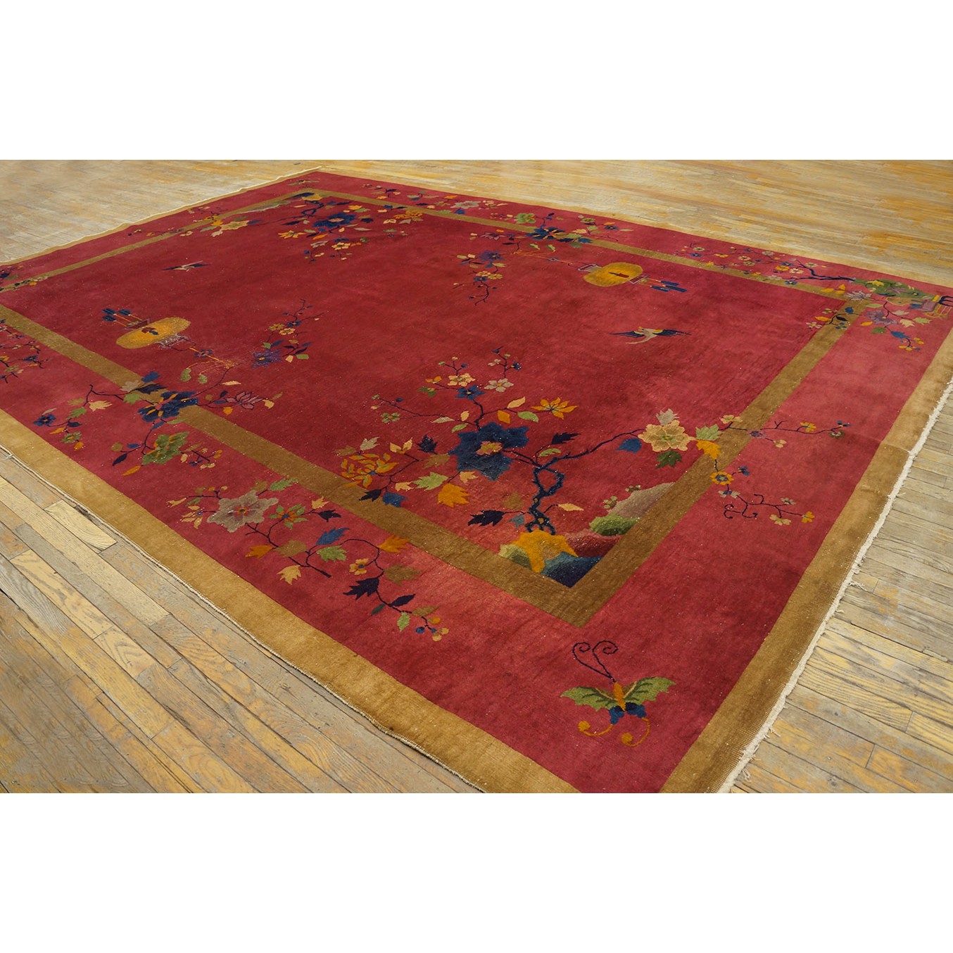 DescriptionChineseCarpets made in China proper. See entries Ningshia, Peking, Art Deco. Chinese - Art DecoAs the name implies, pieces woven between the wars for the Western market by mostly American owned firms especially Nichols and Fette, in thick heavy weaves using strong colors, asymmetric patterns and downplaying the Chinese-ness of the carpet. Nichols rugs are more strong toned than the pastel Fette. Most were woven in the coastal port city of Tientsin. Other lesser known workshops were also active. Some pieces are ultra-geometric and haute-Deco moderne in character: these are very rare. More frequent are pieces with bits of Chinese ornament: vases or other precious objects, paeonies, vines, fences, etc. Most common is the 9 x 12 size, in colors never found in mainstream Chinese rugs: backgrounds in black, mauve, purple, hot pink, orange, olive, employing the best synthetic chrome dyes of the period. Prices are still reasonable and carpets in top condition are available. | |