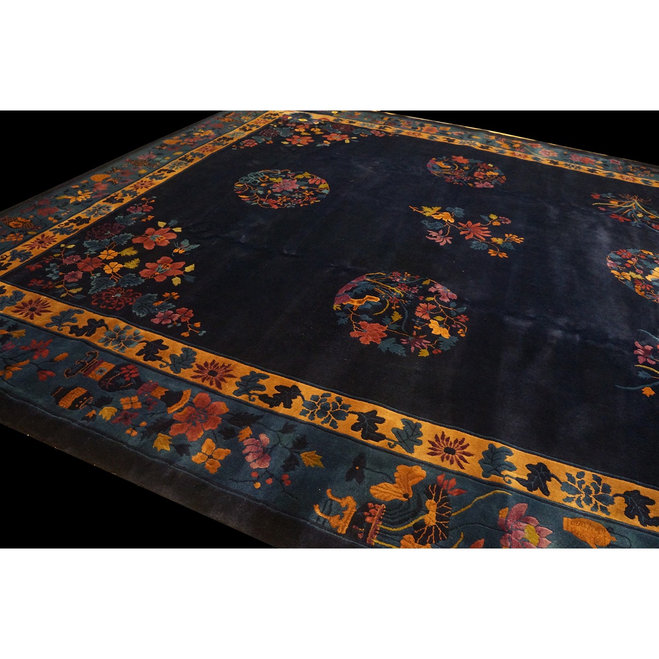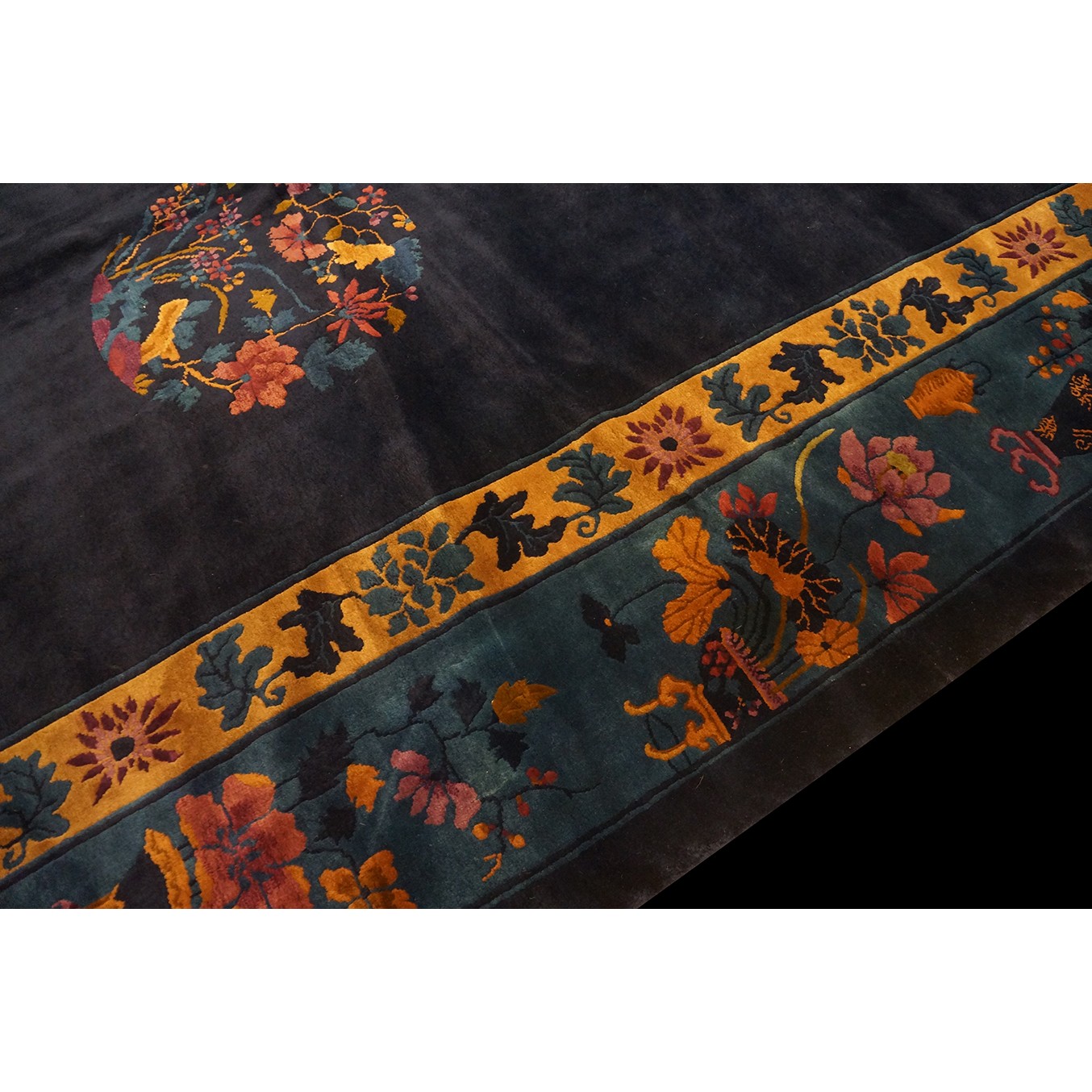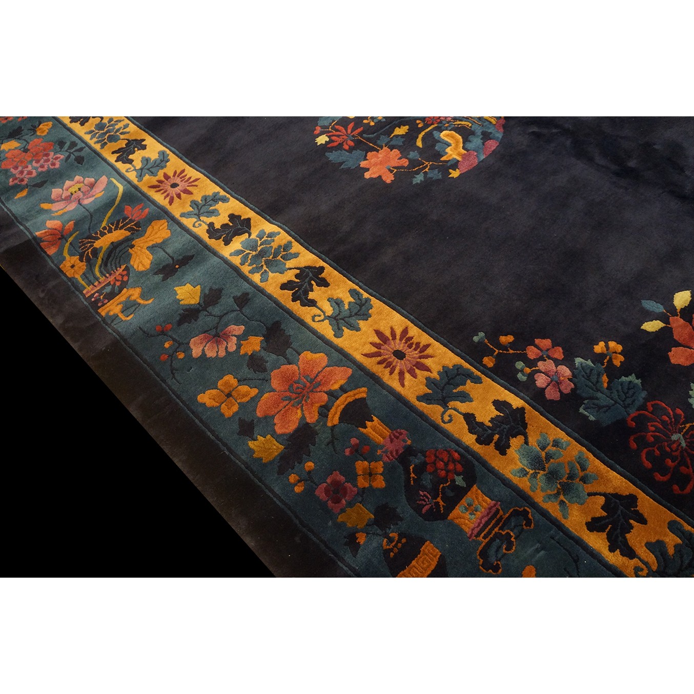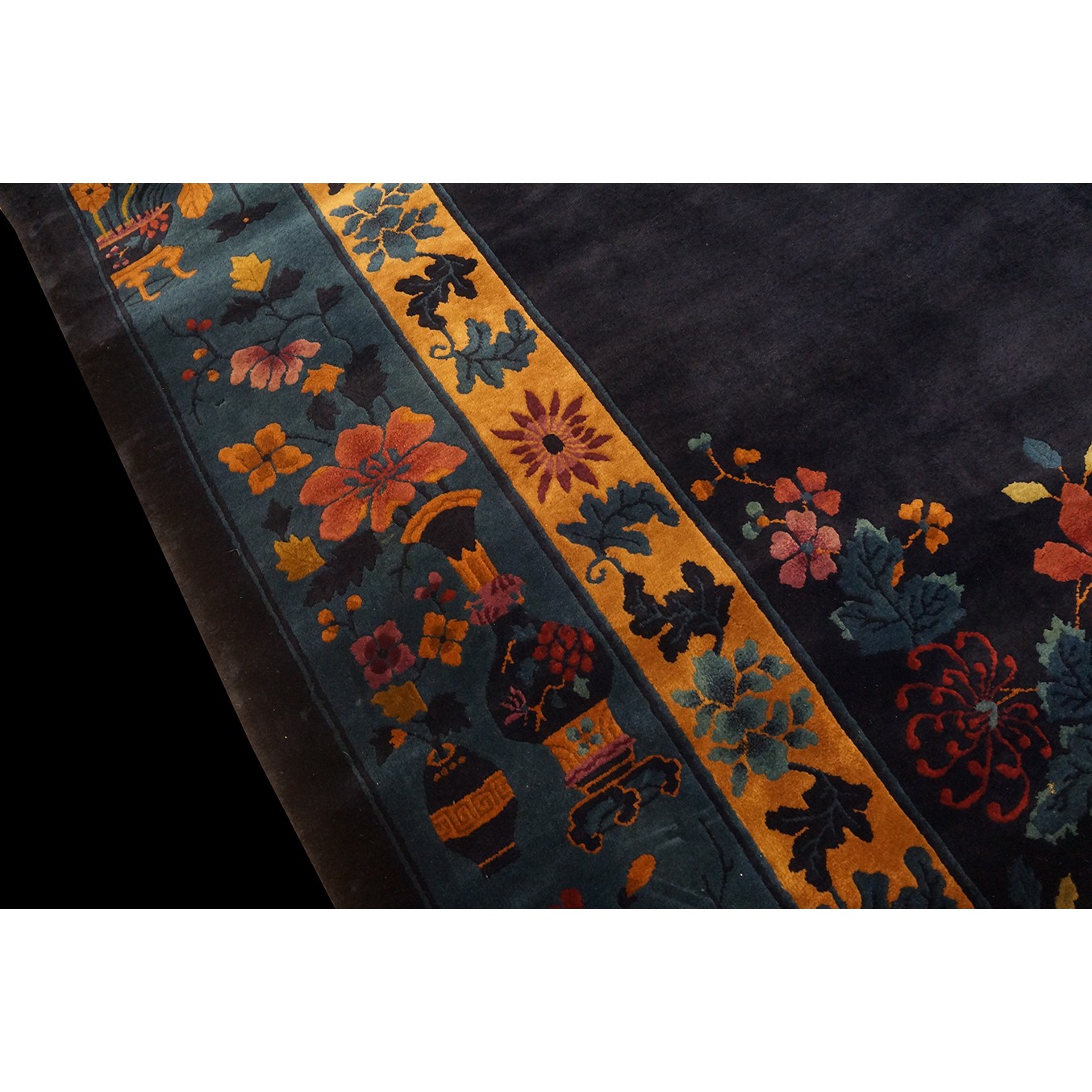 DescriptionChineseCarpets made in China proper. See entries Ningshia, Peking, Art Deco. Chinese - Art DecoAs the name implies, pieces woven between the wars for the Western market by mostly American owned firms especially Nichols and Fette, in thick heavy weaves using strong colors, asymmetric patterns and downplaying the Chinese-ness of the carpet. Nichols rugs are more strong toned than the pastel Fette. Most were woven in the coastal port city of Tientsin. Other lesser known workshops were also active. Some pieces are ultra-geometric and haute-Deco moderne in character: these are very rare. More frequent are pieces with bits of Chinese ornament: vases or other precious objects, paeonies, vines, fences, etc. Most common is the 9 x 12 size, in colors never found in mainstream Chinese rugs: backgrounds in black, mauve, purple, hot pink, orange, olive, employing the best synthetic chrome dyes of the period. Prices are still reasonable and carpets in top condition are available. | |