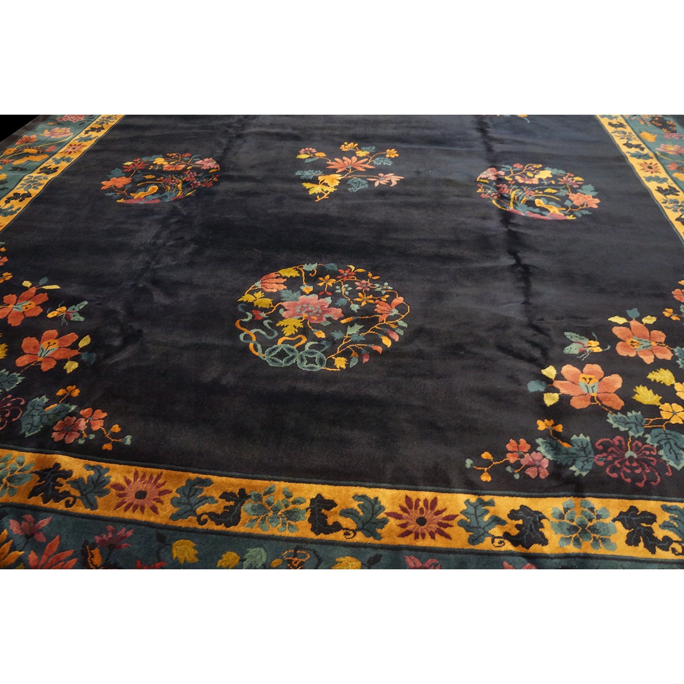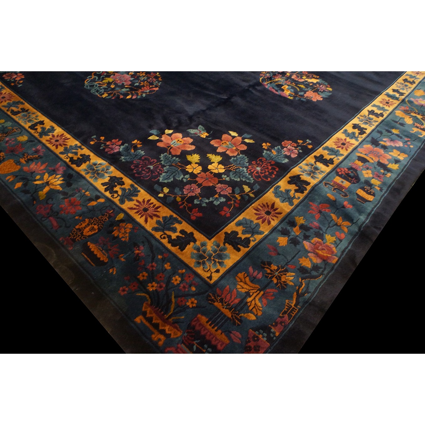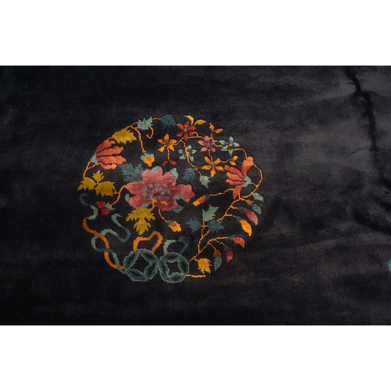 DescriptionChineseCarpets made in China proper. See entries Ningshia, Peking, Art Deco. Chinese - Art DecoAs the name implies, pieces woven between the wars for the Western market by mostly American owned firms especially Nichols and Fette, in thick heavy weaves using strong colors, asymmetric patterns and downplaying the Chinese-ness of the carpet. Nichols rugs are more strong toned than the pastel Fette. Most were woven in the coastal port city of Tientsin. Other lesser known workshops were also active. Some pieces are ultra-geometric and haute-Deco moderne in character: these are very rare. More frequent are pieces with bits of Chinese ornament: vases or other precious objects, paeonies, vines, fences, etc. Most common is the 9 x 12 size, in colors never found in mainstream Chinese rugs: backgrounds in black, mauve, purple, hot pink, orange, olive, employing the best synthetic chrome dyes of the period. Prices are still reasonable and carpets in top condition are available. | |