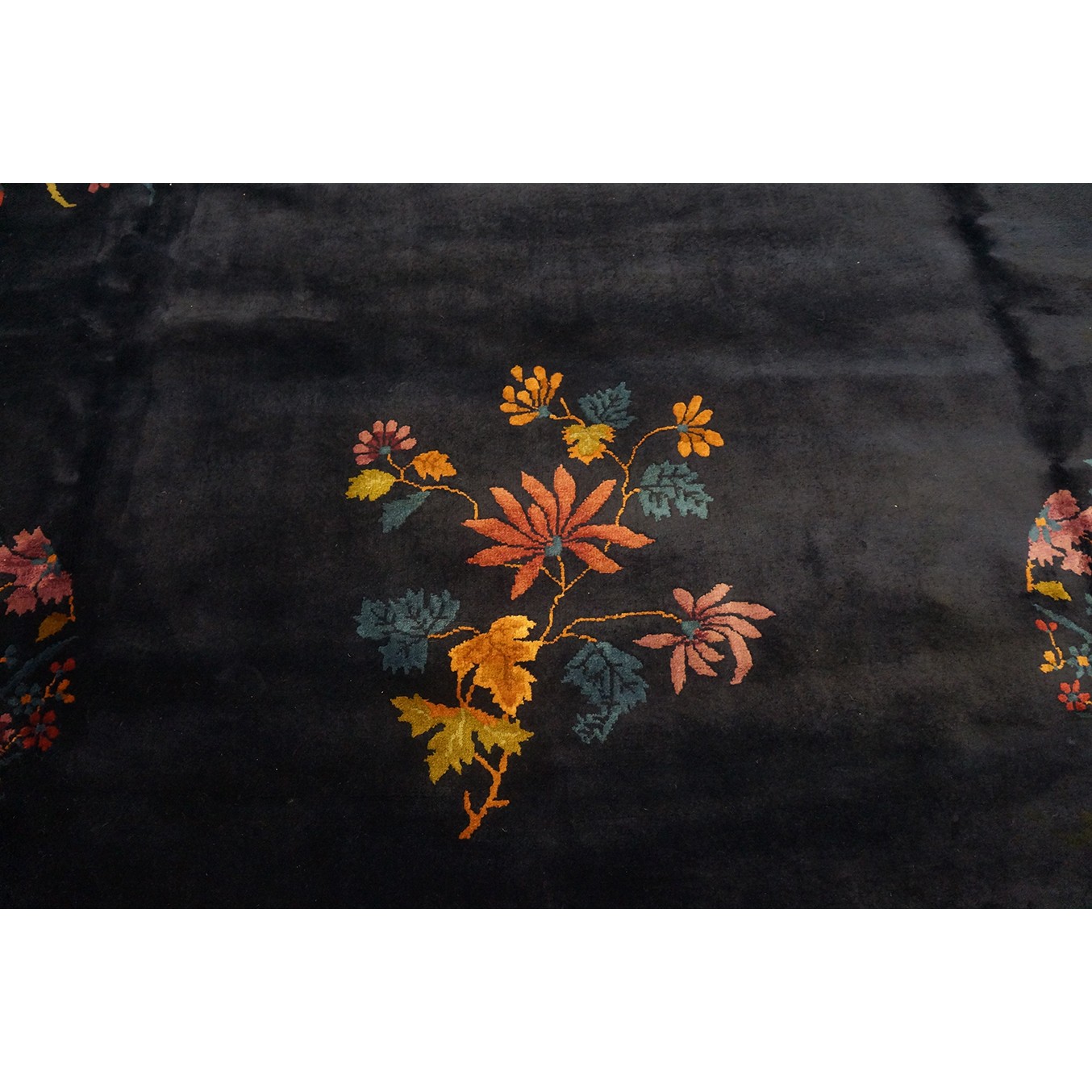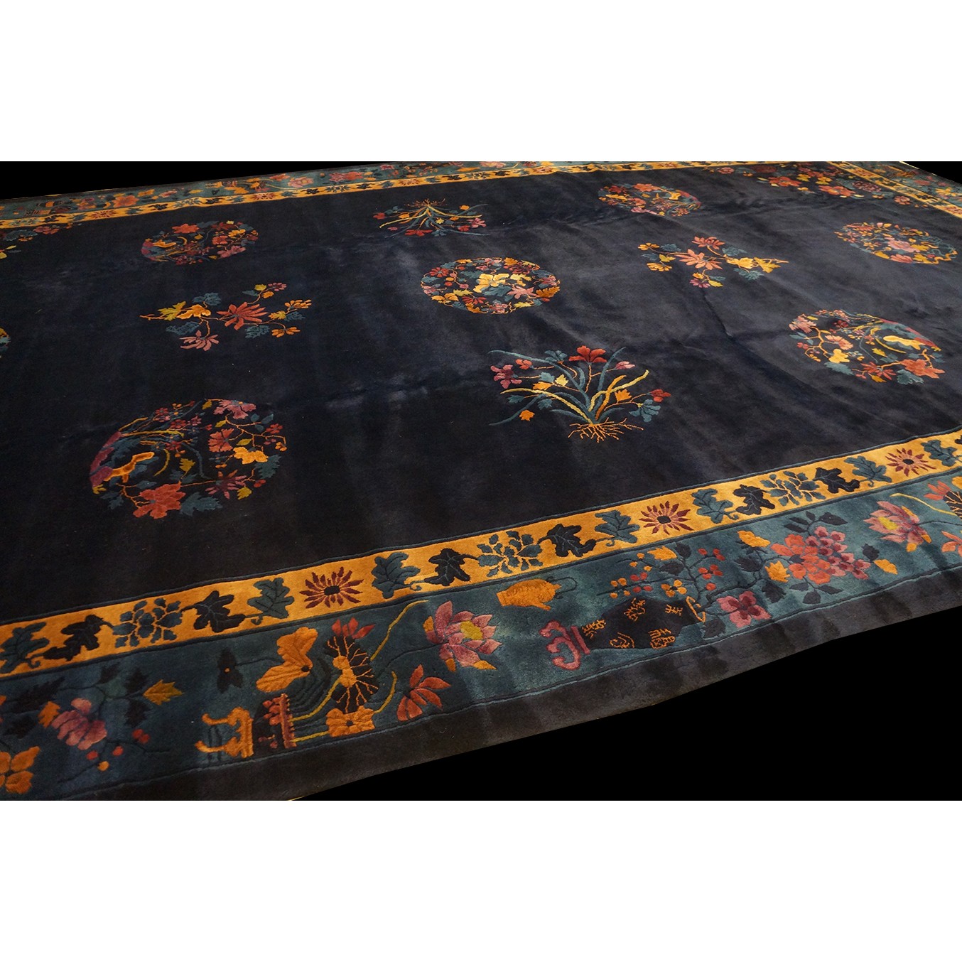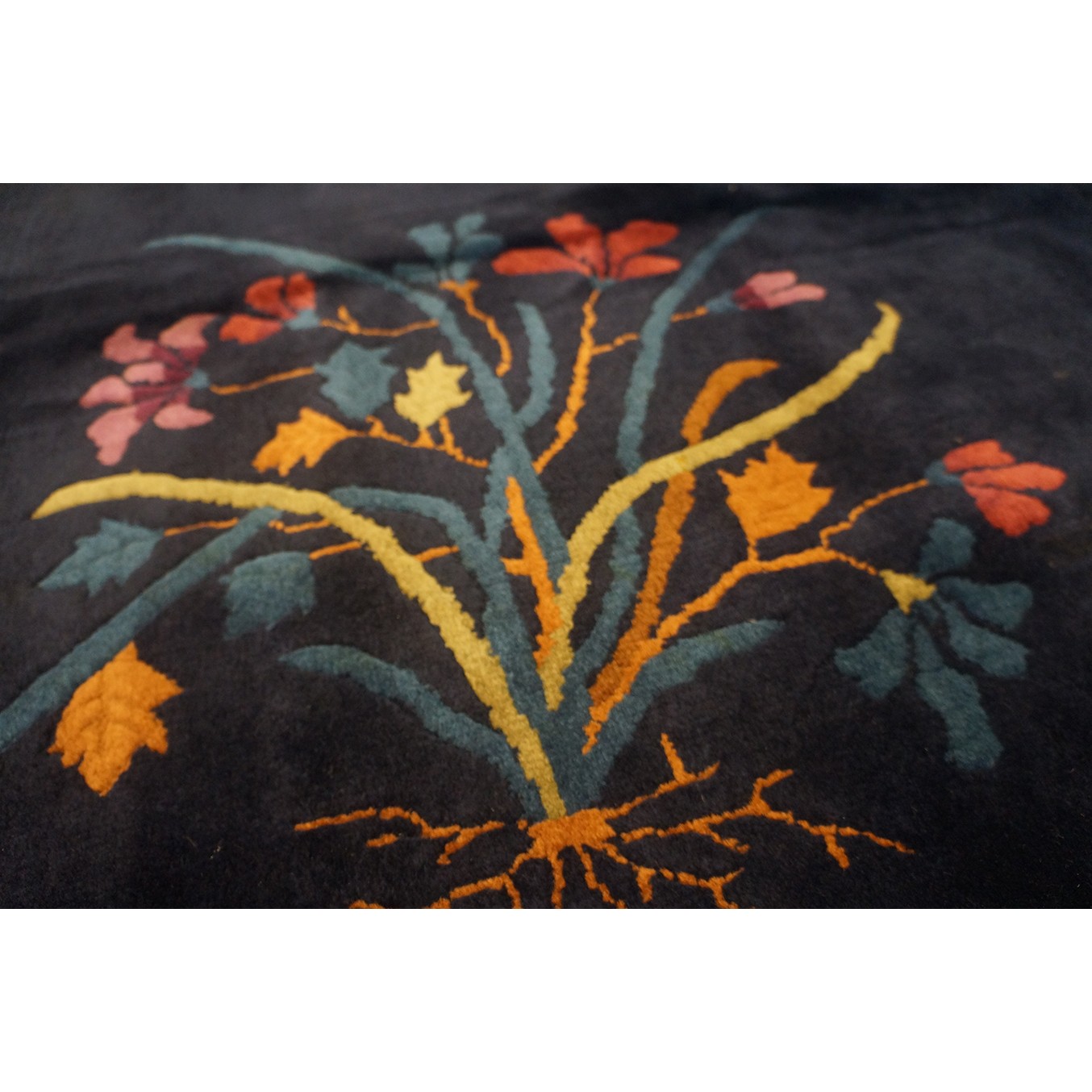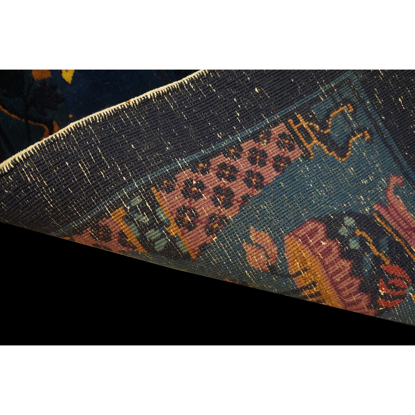 DescriptionChineseCarpets made in China proper. See entries Ningshia, Peking, Art Deco. Chinese - Art DecoAs the name implies, pieces woven between the wars for the Western market by mostly American owned firms especially Nichols and Fette, in thick heavy weaves using strong colors, asymmetric patterns and downplaying the Chinese-ness of the carpet. Nichols rugs are more strong toned than the pastel Fette. Most were woven in the coastal port city of Tientsin. Other lesser known workshops were also active. Some pieces are ultra-geometric and haute-Deco moderne in character: these are very rare. More frequent are pieces with bits of Chinese ornament: vases or other precious objects, paeonies, vines, fences, etc. Most common is the 9 x 12 size, in colors never found in mainstream Chinese rugs: backgrounds in black, mauve, purple, hot pink, orange, olive, employing the best synthetic chrome dyes of the period. Prices are still reasonable and carpets in top condition are available. | |