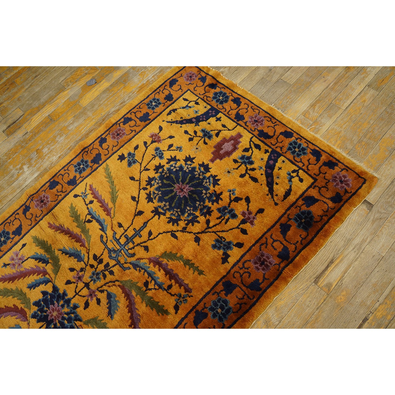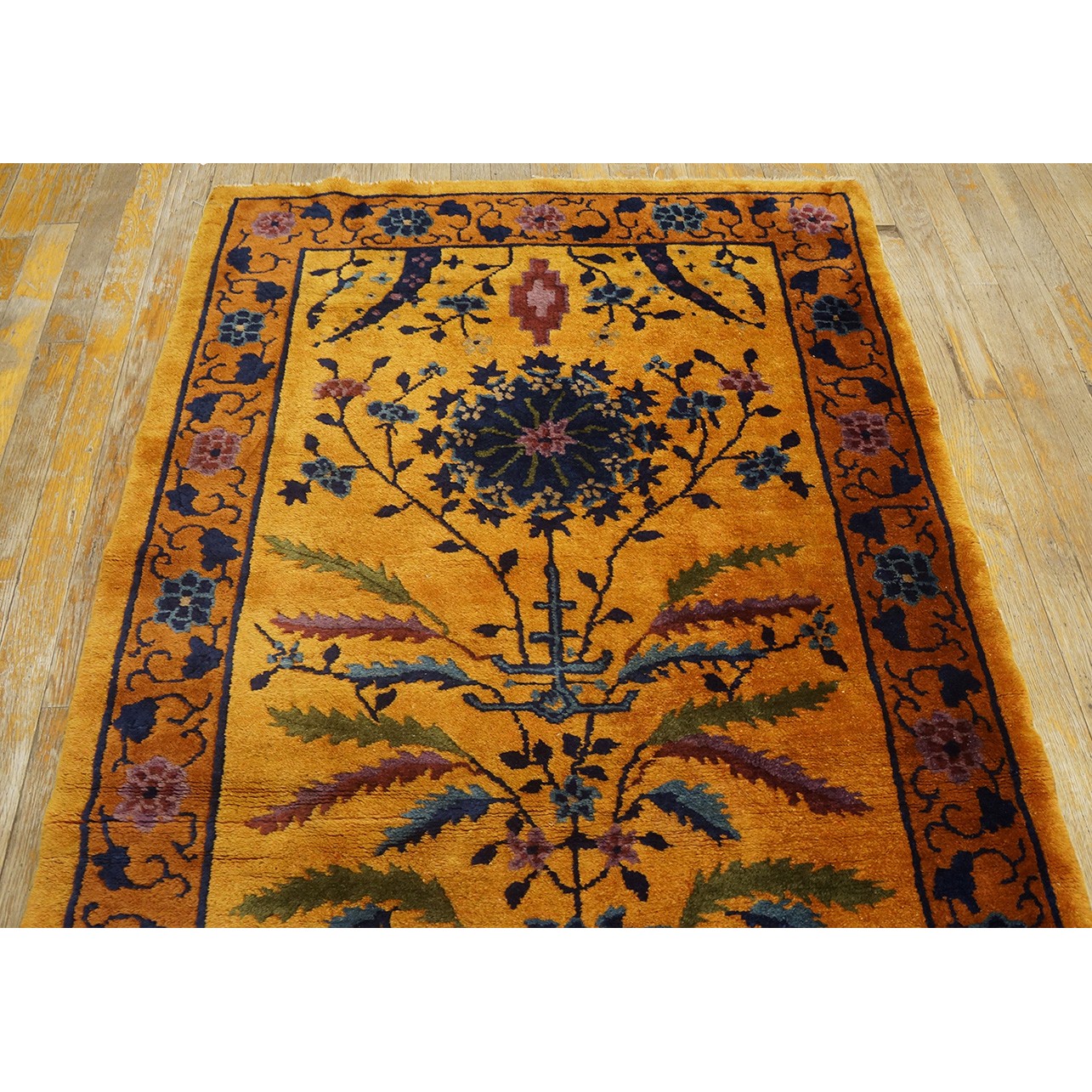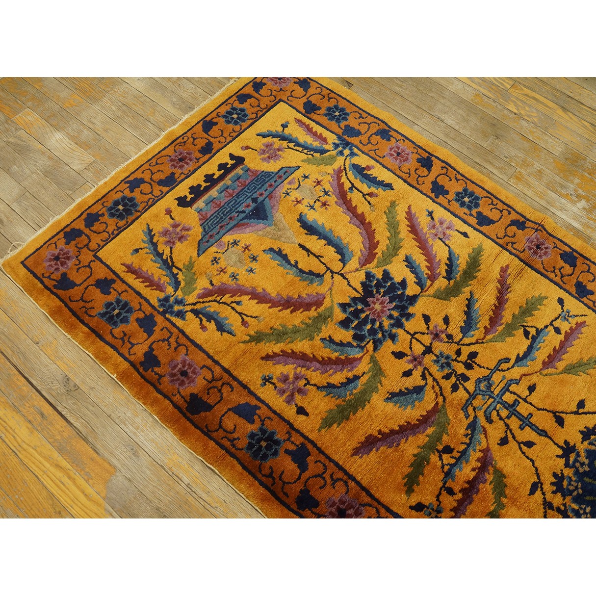 DescriptionChineseCarpets made in China proper. See entries Ningshia, Peking, Art Deco. Chinese - Art DecoAs the name implies, pieces woven between the wars for the Western market by mostly American owned firms especially Nichols and Fette, in thick heavy weaves using strong colors, asymmetric patterns and downplaying the Chinese-ness of the carpet. Nichols rugs are more strong toned than the pastel Fette. Most were woven in the coastal port city of Tientsin. Other lesser known workshops were also active. Some pieces are ultra-geometric and haute-Deco moderne in character: these are very rare. More frequent are pieces with bits of Chinese ornament: vases or other precious objects, paeonies, vines, fences, etc. Most common is the 9 x 12 size, in colors never found in mainstream Chinese rugs: backgrounds in black, mauve, purple, hot pink, orange, olive, employing the best synthetic chrome dyes of the period. Prices are still reasonable and carpets in top condition are available. | |