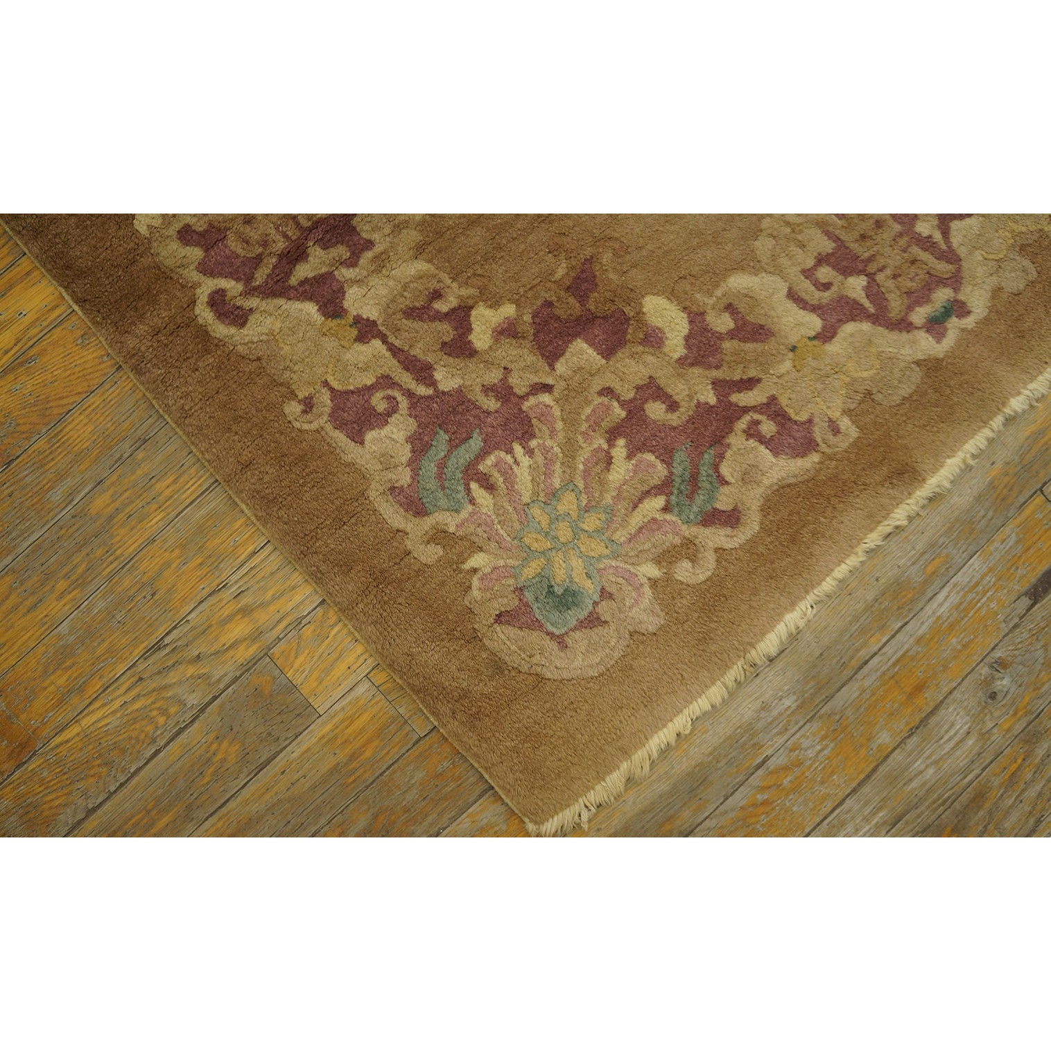DescriptionChineseCarpets made in China proper. See entries Ningshia, Peking, Art Deco. Chinese - Art DecoAs the name implies, pieces woven between the wars for the Western market by mostly American owned firms especially Nichols and Fette, in thick heavy weaves using strong colors, asymmetric patterns and downplaying the Chinese-ness of the carpet. Nichols rugs are more strong toned than the pastel Fette. Most were woven in the coastal port city of Tientsin. Other lesser known workshops were also active. Some pieces are ultra-geometric and haute-Deco moderne in character: these are very rare. More frequent are pieces with bits of Chinese ornament: vases or other precious objects, paeonies, vines, fences, etc. Most common is the 9 x 12 size, in colors never found in mainstream Chinese rugs: backgrounds in black, mauve, purple, hot pink, orange, olive, employing the best synthetic chrome dyes of the period. Prices are still reasonable and carpets in top condition are available. | |