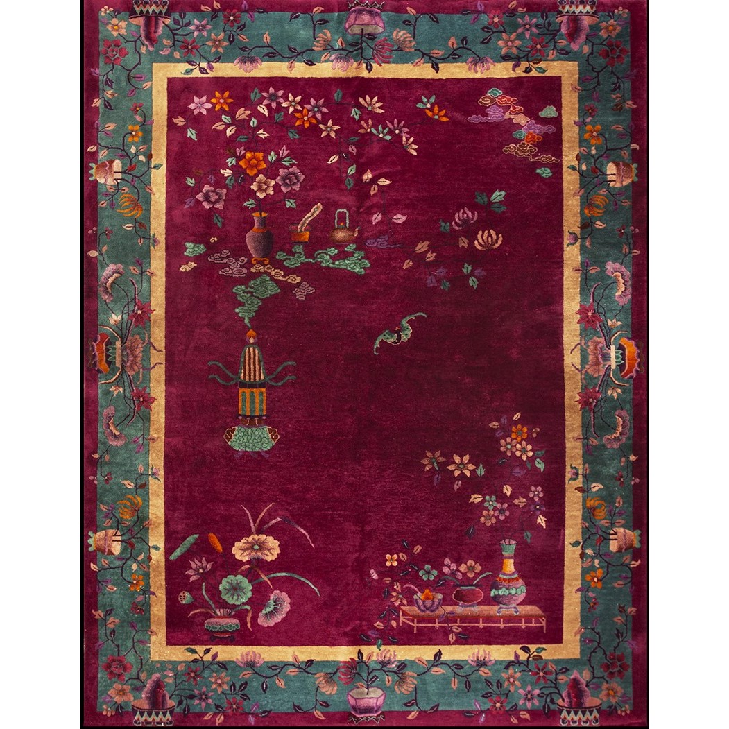 DescriptionChineseCarpets made in China proper. See entries Ningshia, Peking, Art Deco. Chinese - Art DecoAs the name implies, pieces woven between the wars for the Western market by mostly American owned firms especially Nichols and Fette, in thick heavy weaves using strong colors, asymmetric patterns and downplaying the Chinese-ness of the carpet. Nichols rugs are more strong toned than the pastel Fette. Most were woven in the coastal port city of Tientsin. Other lesser known workshops were also active. Some pieces are ultra-geometric and haute-Deco moderne in character: these are very rare. More frequent are pieces with bits of Chinese ornament: vases or other precious objects, paeonies, vines, fences, etc. Most common is the 9 x 12 size, in colors never found in mainstream Chinese rugs: backgrounds in black, mauve, purple, hot pink, orange, olive, employing the best synthetic chrome dyes of the period. Prices are still reasonable and carpets in top condition are available. | |