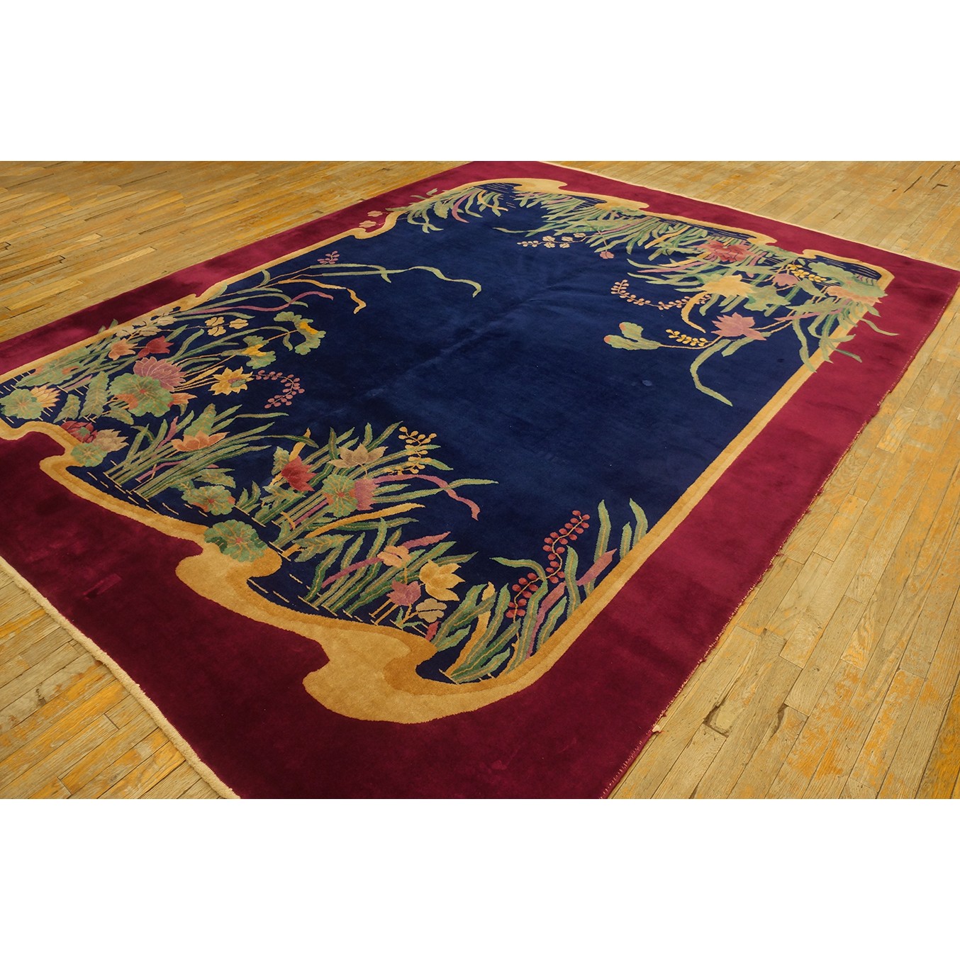DescriptionChineseCarpets made in China proper. See entries Ningshia, Peking, Art Deco. Chinese - Art DecoAs the name implies, pieces woven between the wars for the Western market by mostly American owned firms especially Nichols and Fette, in thick heavy weaves using strong colors, asymmetric patterns and downplaying the Chinese-ness of the carpet. Nichols rugs are more strong toned than the pastel Fette. Most were woven in the coastal port city of Tientsin. Other lesser known workshops were also active. Some pieces are ultra-geometric and haute-Deco moderne in character: these are very rare. More frequent are pieces with bits of Chinese ornament: vases or other precious objects, paeonies, vines, fences, etc. Most common is the 9 x 12 size, in colors never found in mainstream Chinese rugs: backgrounds in black, mauve, purple, hot pink, orange, olive, employing the best synthetic chrome dyes of the period. Prices are still reasonable and carpets in top condition are available. | |