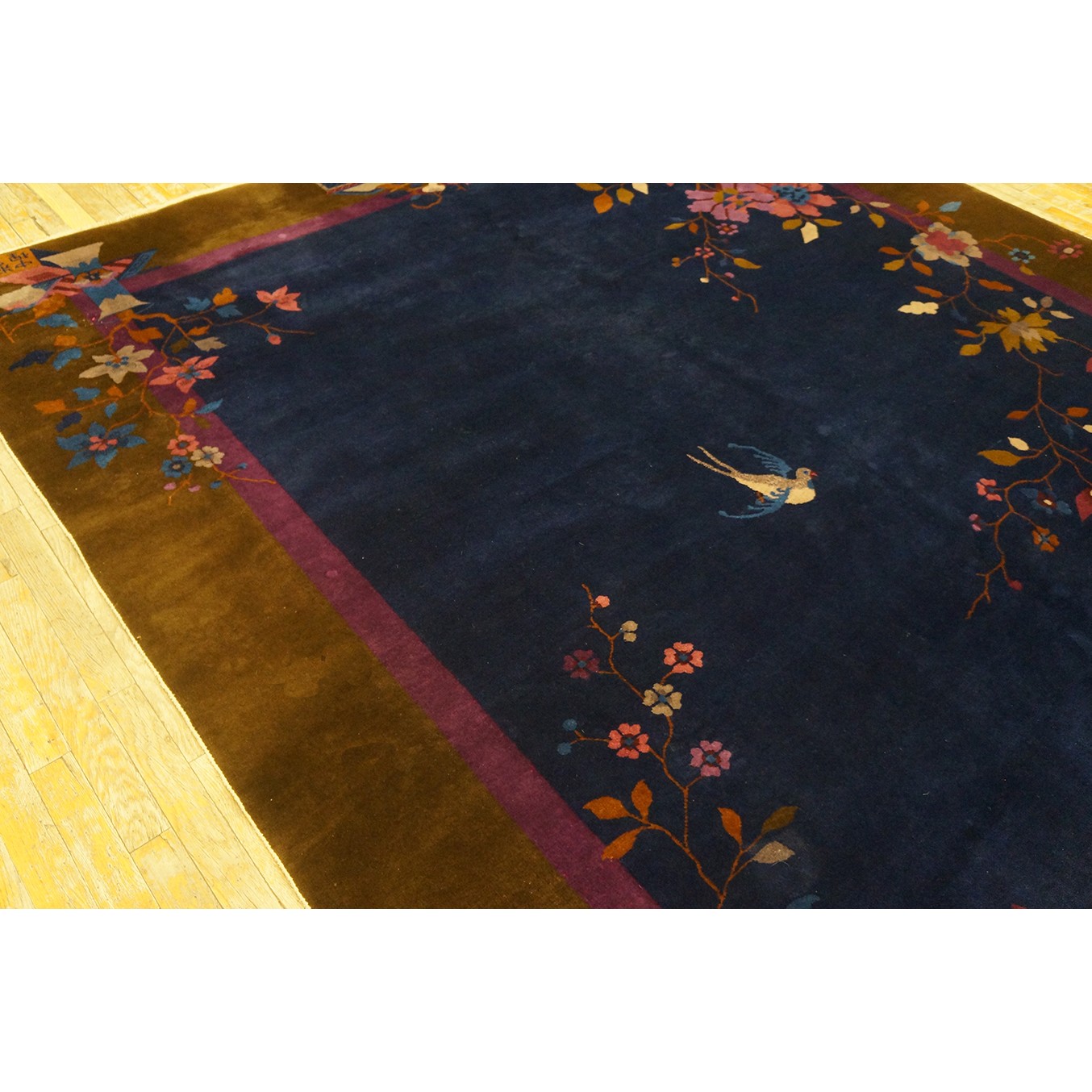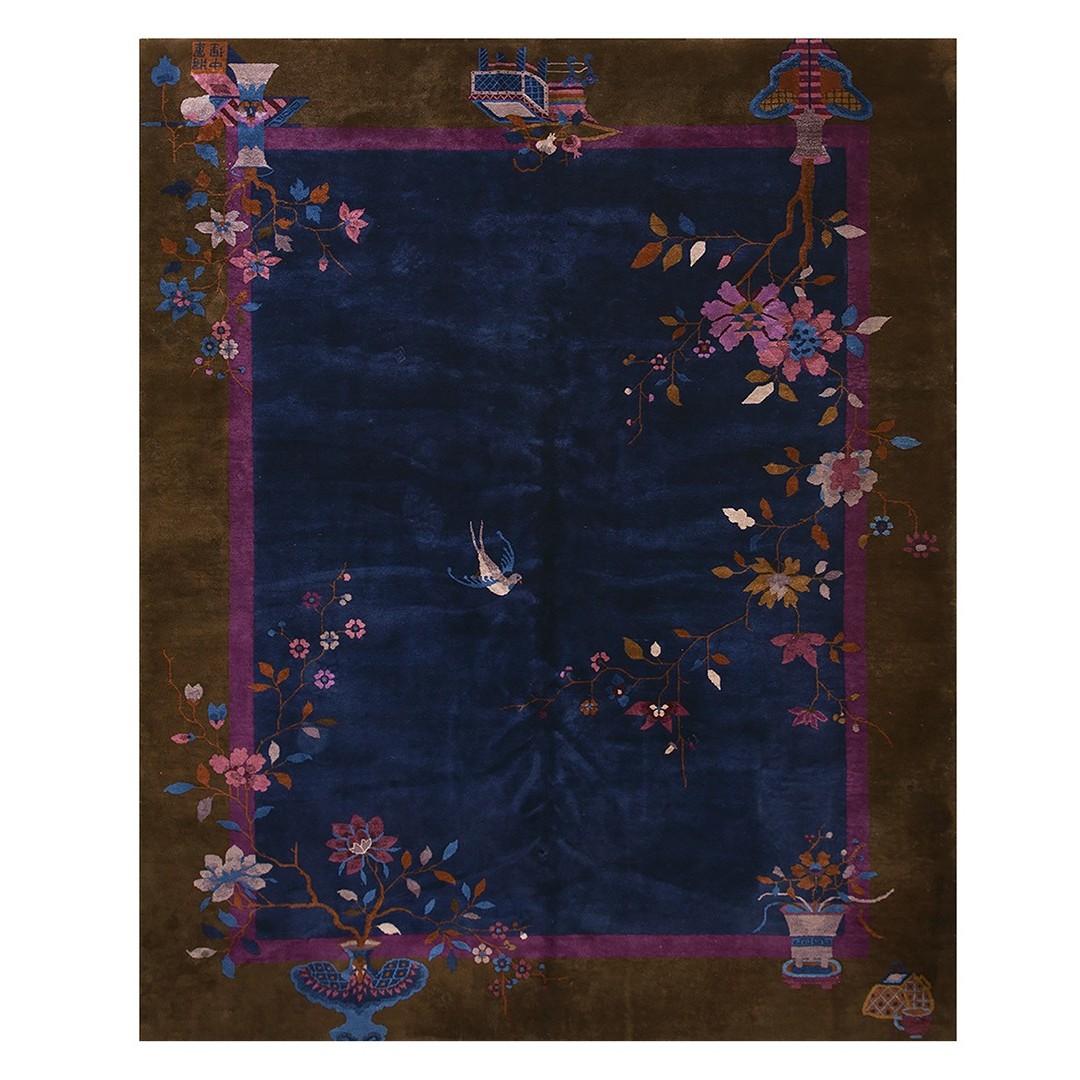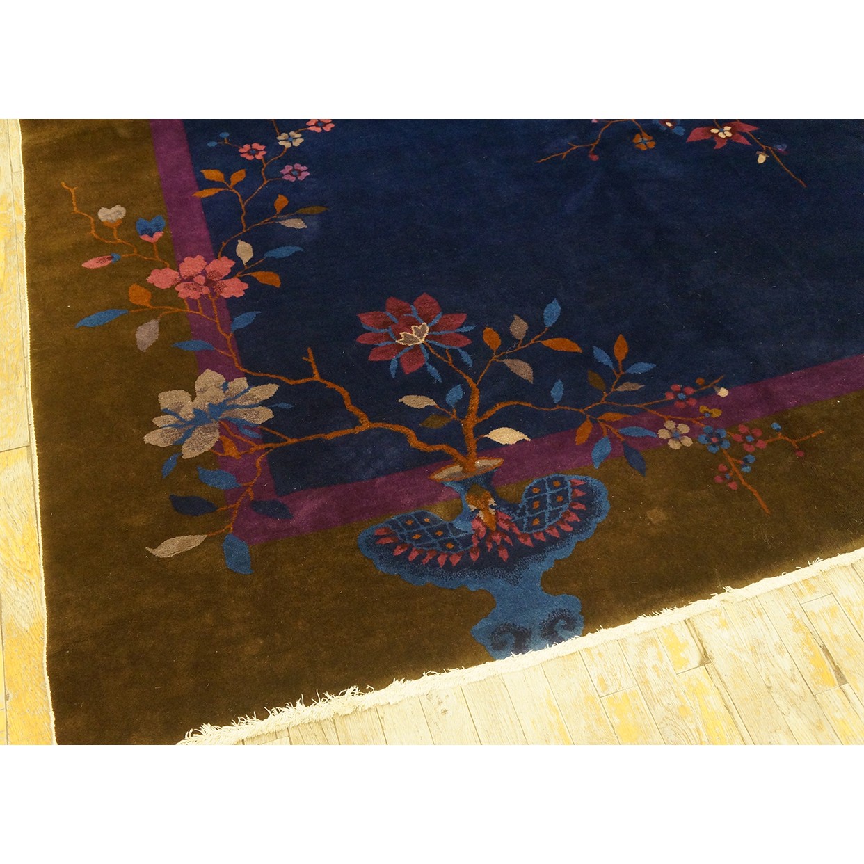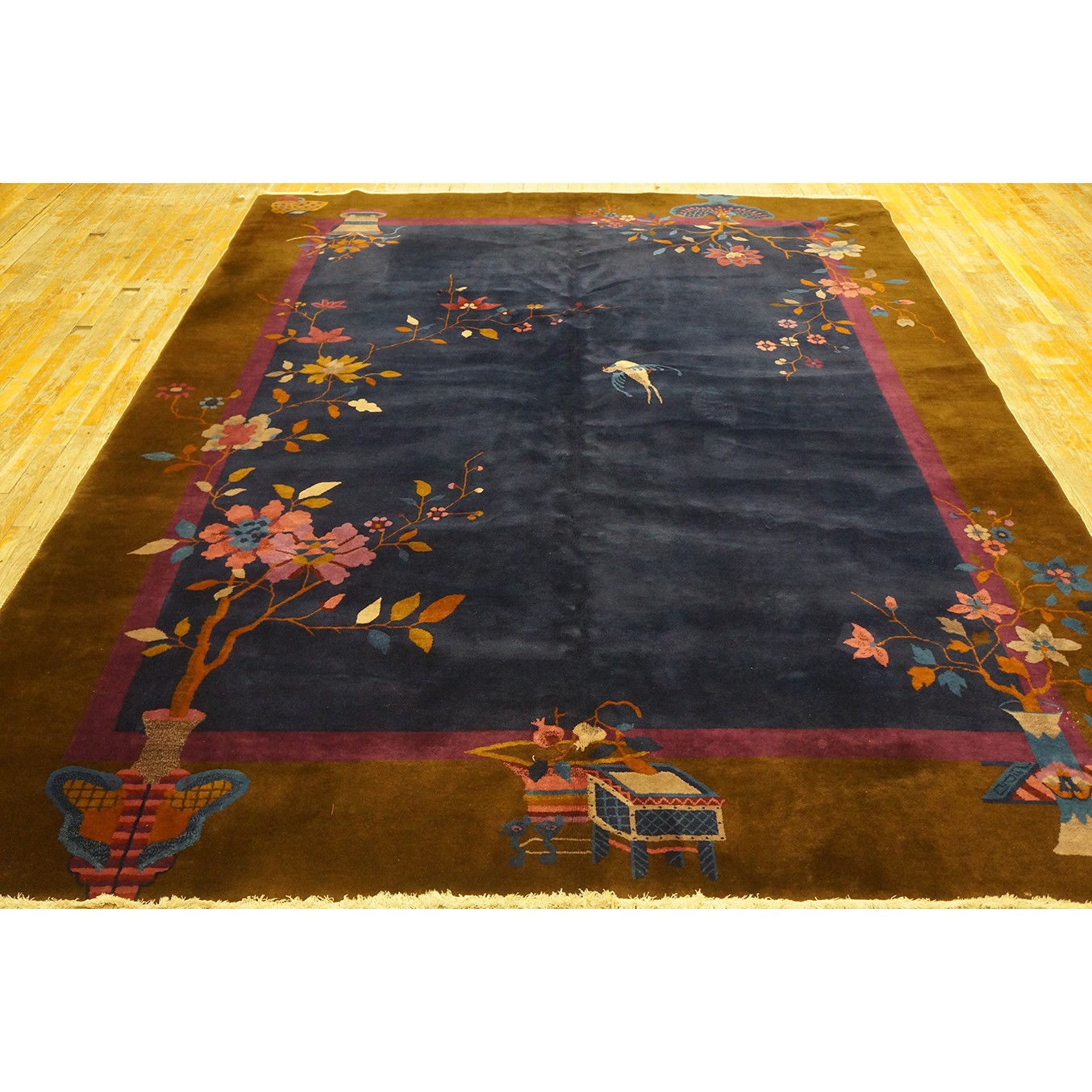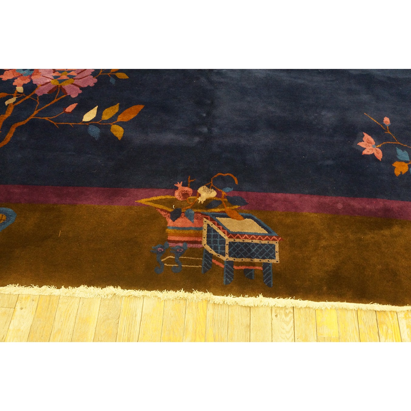 DescriptionChineseCarpets made in China proper. See entries Ningshia, Peking, Art Deco. Chinese - Art DecoAs the name implies, pieces woven between the wars for the Western market by mostly American owned firms especially Nichols and Fette, in thick heavy weaves using strong colors, asymmetric patterns and downplaying the Chinese-ness of the carpet. Nichols rugs are more strong toned than the pastel Fette. Most were woven in the coastal port city of Tientsin. Other lesser known workshops were also active. Some pieces are ultra-geometric and haute-Deco moderne in character: these are very rare. More frequent are pieces with bits of Chinese ornament: vases or other precious objects, paeonies, vines, fences, etc. Most common is the 9 x 12 size, in colors never found in mainstream Chinese rugs: backgrounds in black, mauve, purple, hot pink, orange, olive, employing the best synthetic chrome dyes of the period. Prices are still reasonable and carpets in top condition are available. | |