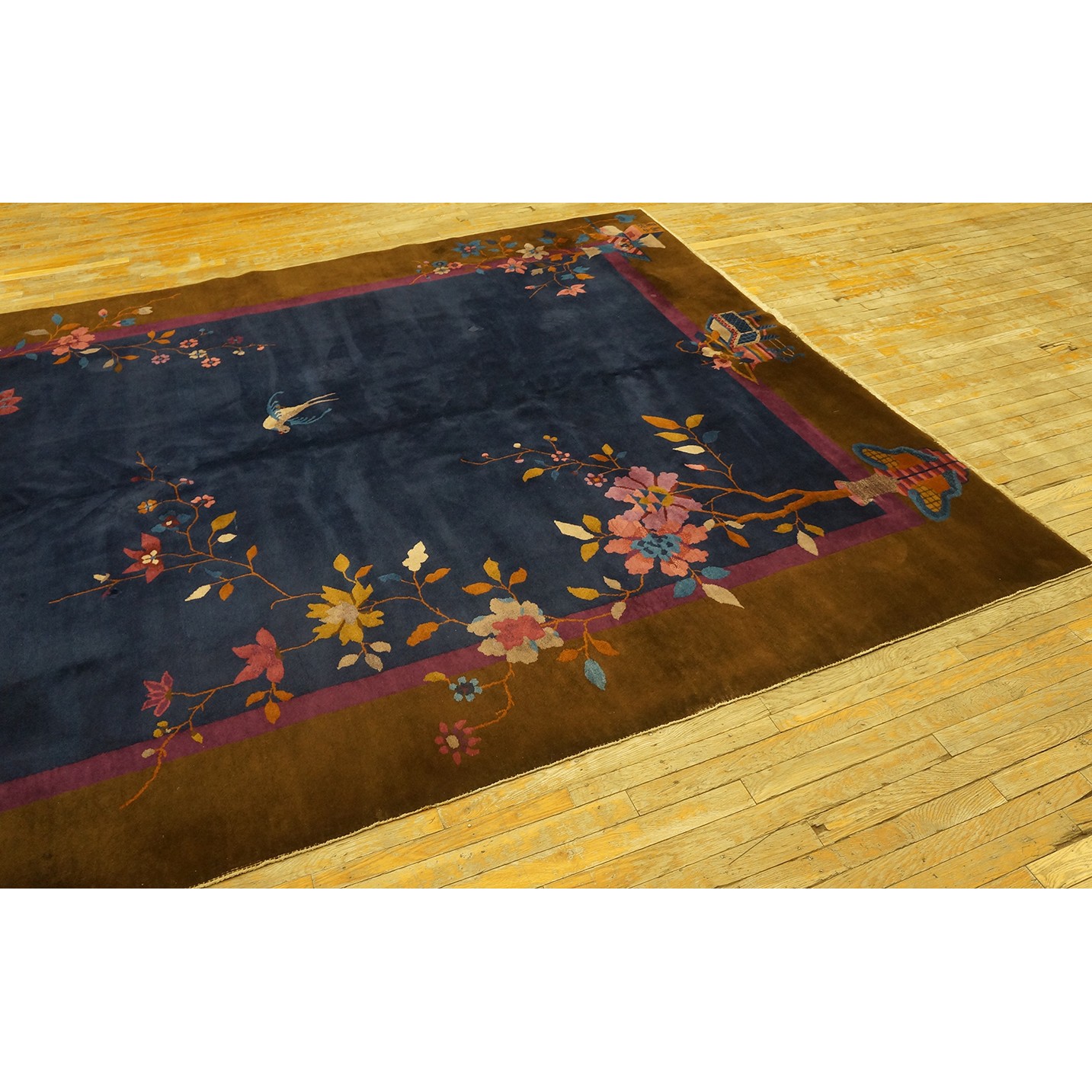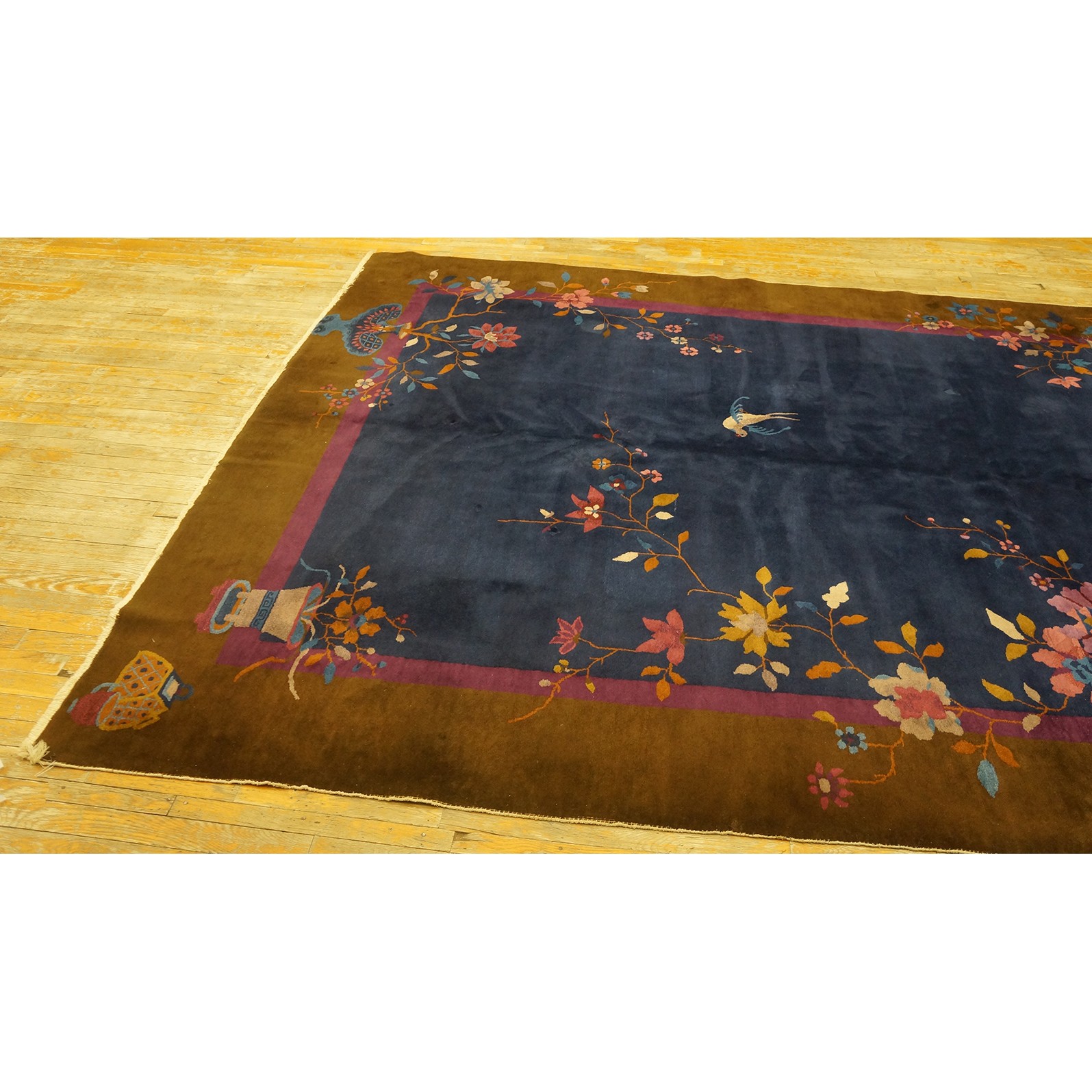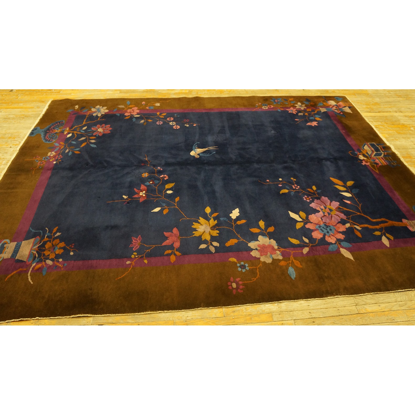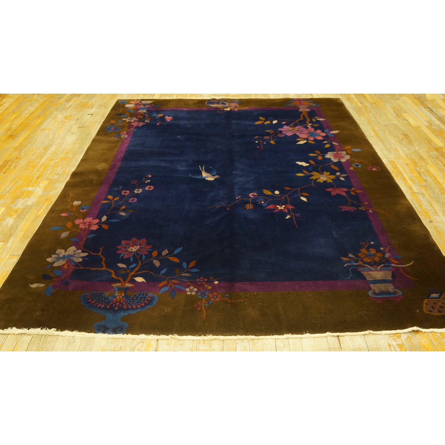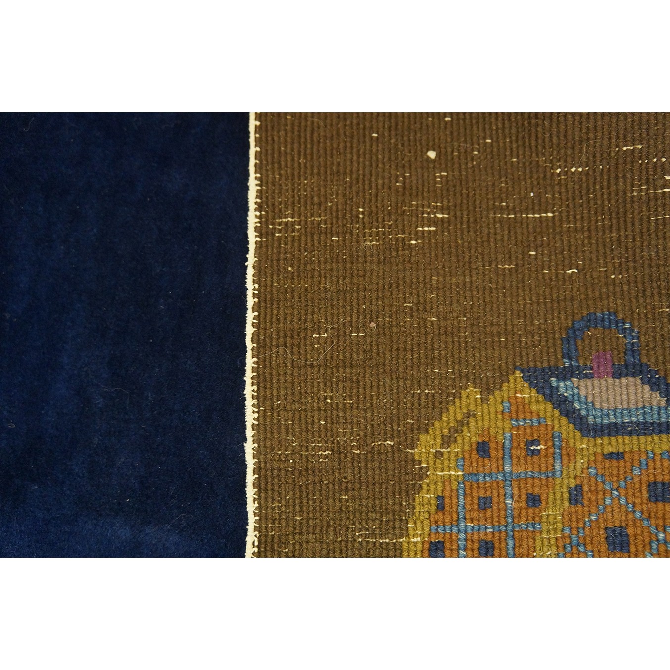 DescriptionChineseCarpets made in China proper. See entries Ningshia, Peking, Art Deco. Chinese - Art DecoAs the name implies, pieces woven between the wars for the Western market by mostly American owned firms especially Nichols and Fette, in thick heavy weaves using strong colors, asymmetric patterns and downplaying the Chinese-ness of the carpet. Nichols rugs are more strong toned than the pastel Fette. Most were woven in the coastal port city of Tientsin. Other lesser known workshops were also active. Some pieces are ultra-geometric and haute-Deco moderne in character: these are very rare. More frequent are pieces with bits of Chinese ornament: vases or other precious objects, paeonies, vines, fences, etc. Most common is the 9 x 12 size, in colors never found in mainstream Chinese rugs: backgrounds in black, mauve, purple, hot pink, orange, olive, employing the best synthetic chrome dyes of the period. Prices are still reasonable and carpets in top condition are available. | |