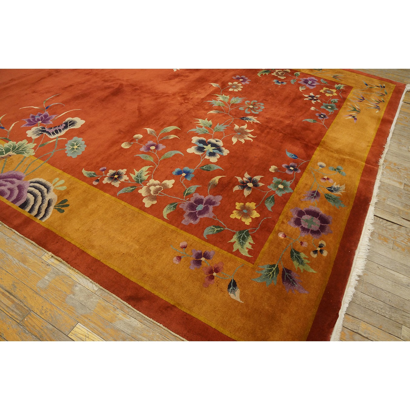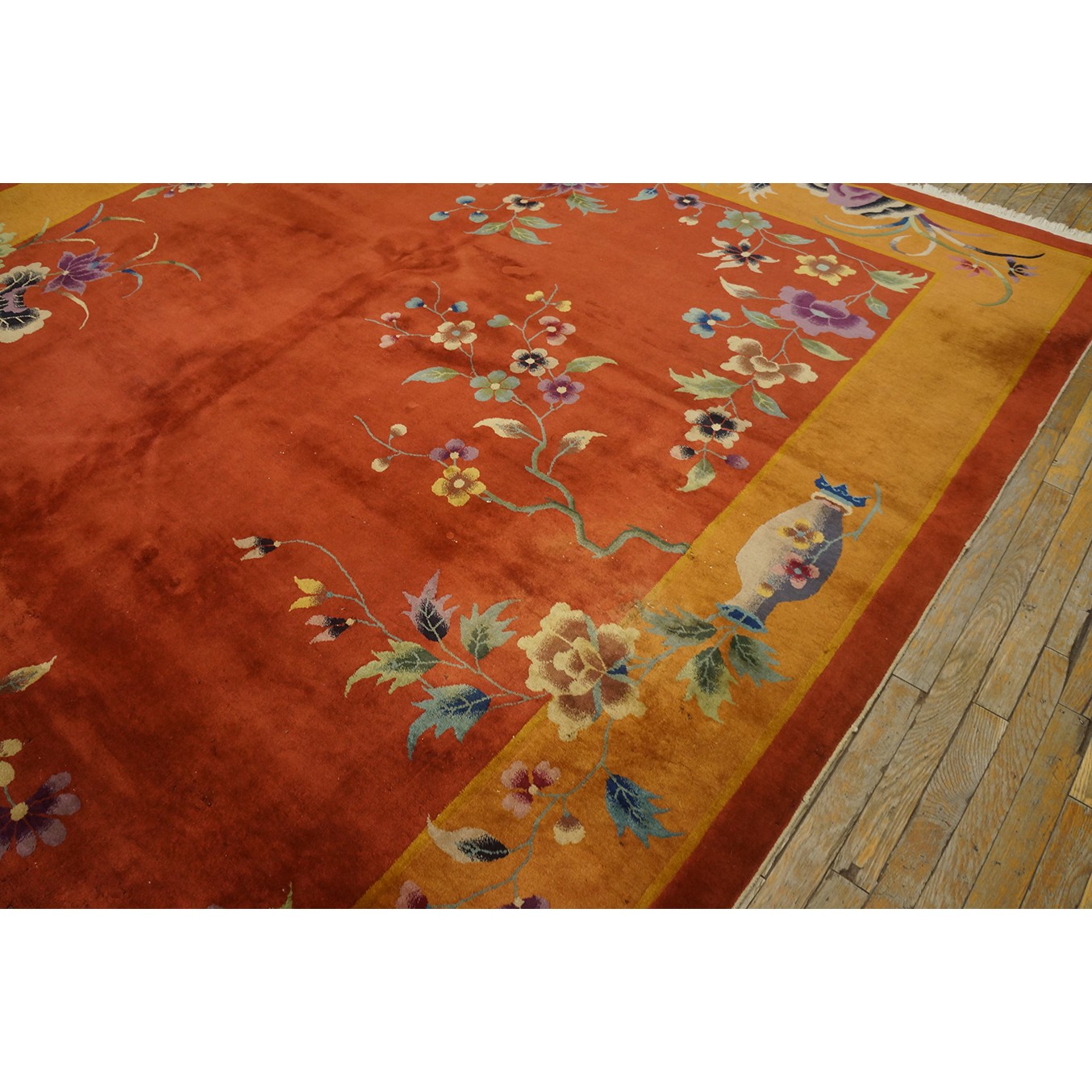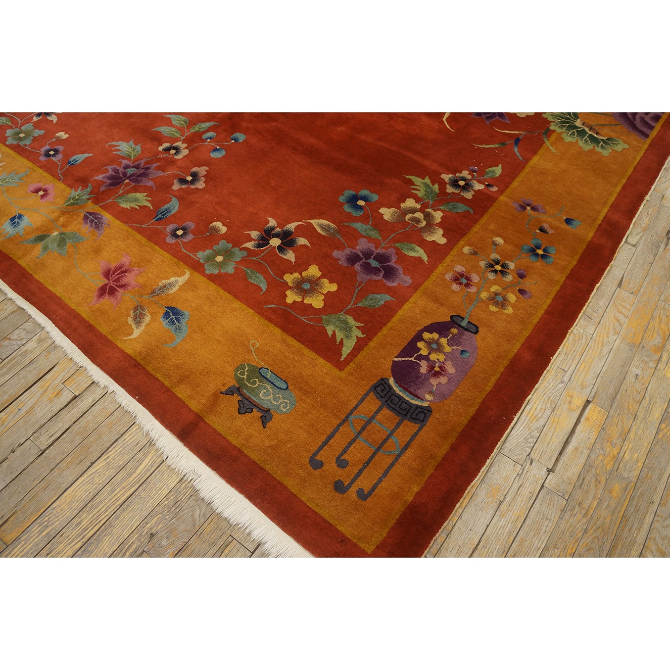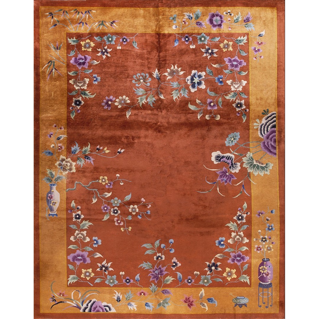 DescriptionChineseCarpets made in China proper. See entries Ningshia, Peking, Art Deco. Chinese - Art DecoAs the name implies, pieces woven between the wars for the Western market by mostly American owned firms especially Nichols and Fette, in thick heavy weaves using strong colors, asymmetric patterns and downplaying the Chinese-ness of the carpet. Nichols rugs are more strong toned than the pastel Fette. Most were woven in the coastal port city of Tientsin. Other lesser known workshops were also active. Some pieces are ultra-geometric and haute-Deco moderne in character: these are very rare. More frequent are pieces with bits of Chinese ornament: vases or other precious objects, paeonies, vines, fences, etc. Most common is the 9 x 12 size, in colors never found in mainstream Chinese rugs: backgrounds in black, mauve, purple, hot pink, orange, olive, employing the best synthetic chrome dyes of the period. Prices are still reasonable and carpets in top condition are available. | |