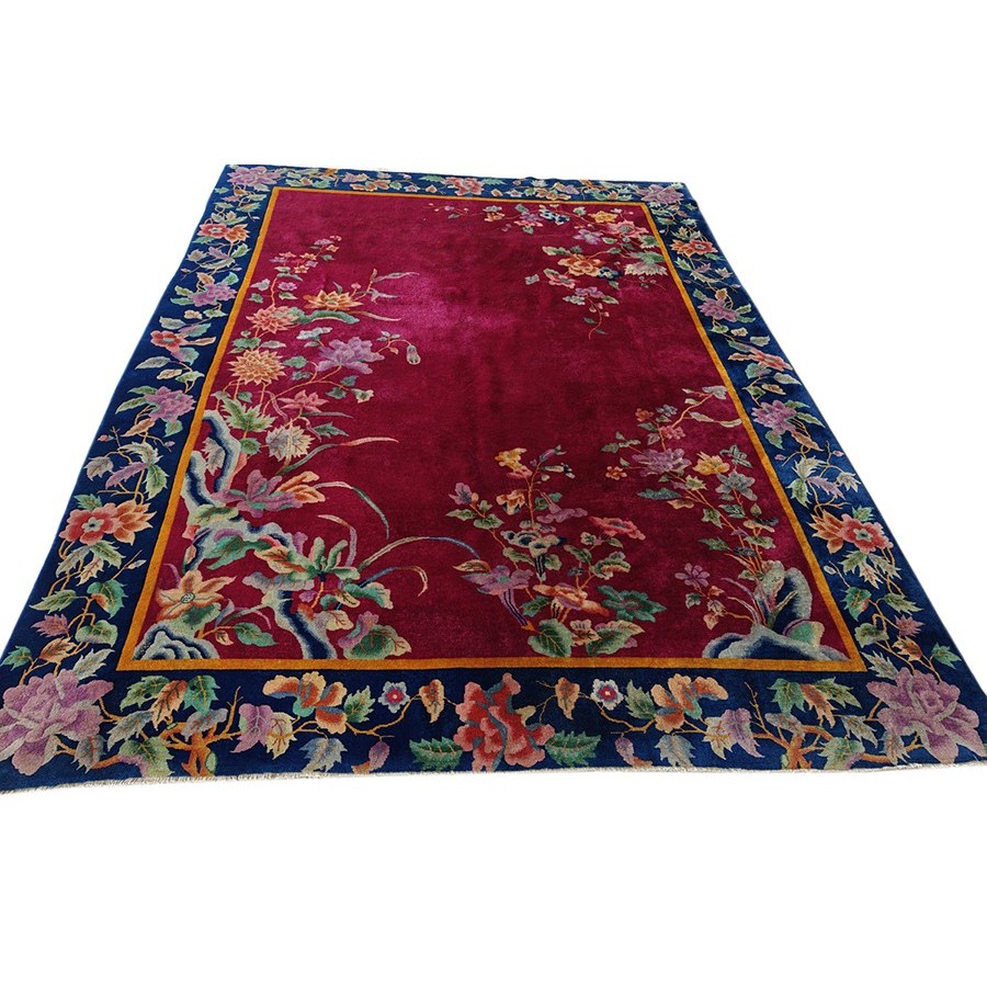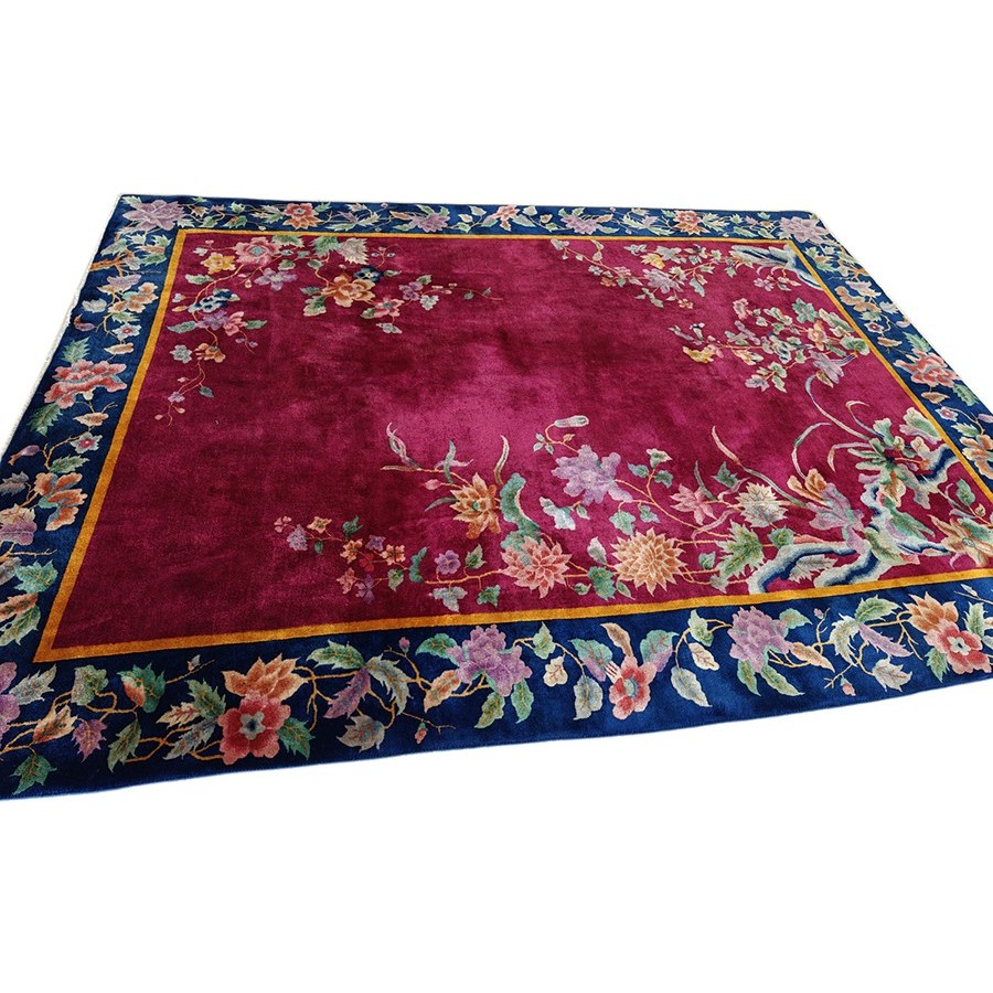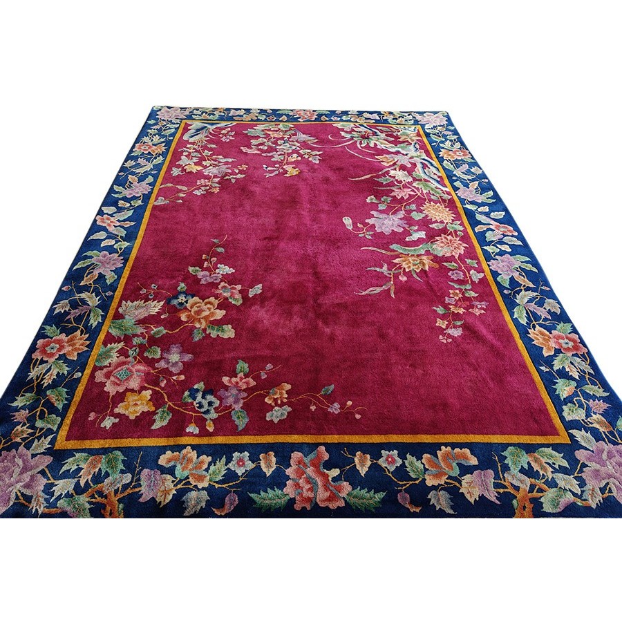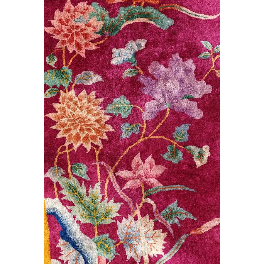 DescriptionChineseCarpets made in China proper. See entries Ningshia, Peking, Art Deco. Chinese - Art DecoAs the name implies, pieces woven between the wars for the Western market by mostly American owned firms especially Nichols and Fette, in thick heavy weaves using strong colors, asymmetric patterns and downplaying the Chinese-ness of the carpet. Nichols rugs are more strong toned than the pastel Fette. Most were woven in the coastal port city of Tientsin. Other lesser known workshops were also active. Some pieces are ultra-geometric and haute-Deco moderne in character: these are very rare. More frequent are pieces with bits of Chinese ornament: vases or other precious objects, paeonies, vines, fences, etc. Most common is the 9 x 12 size, in colors never found in mainstream Chinese rugs: backgrounds in black, mauve, purple, hot pink, orange, olive, employing the best synthetic chrome dyes of the period. Prices are still reasonable and carpets in top condition are available. | |