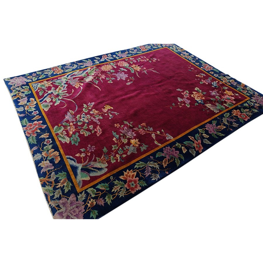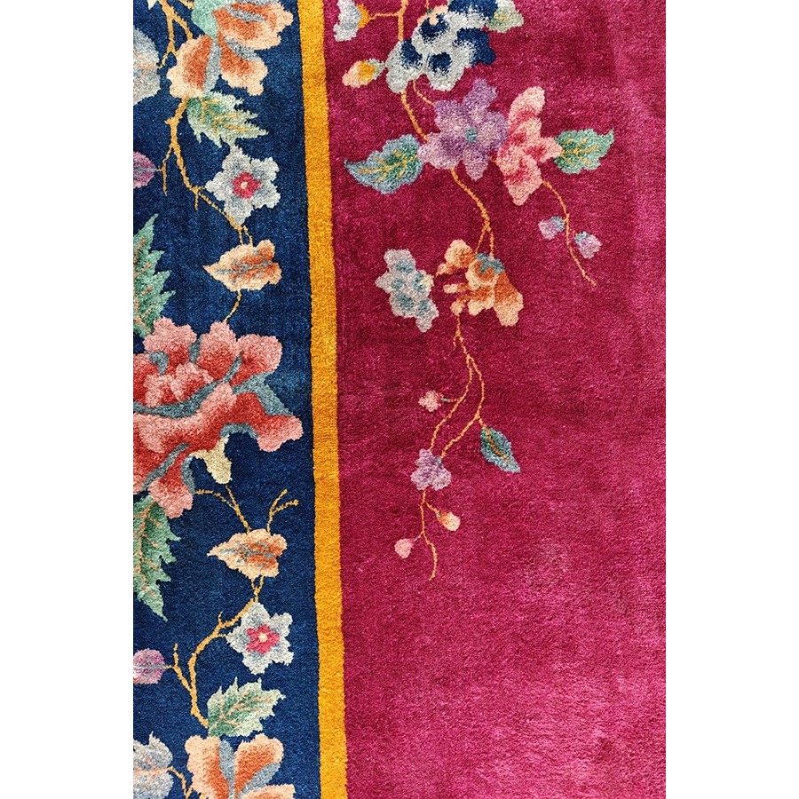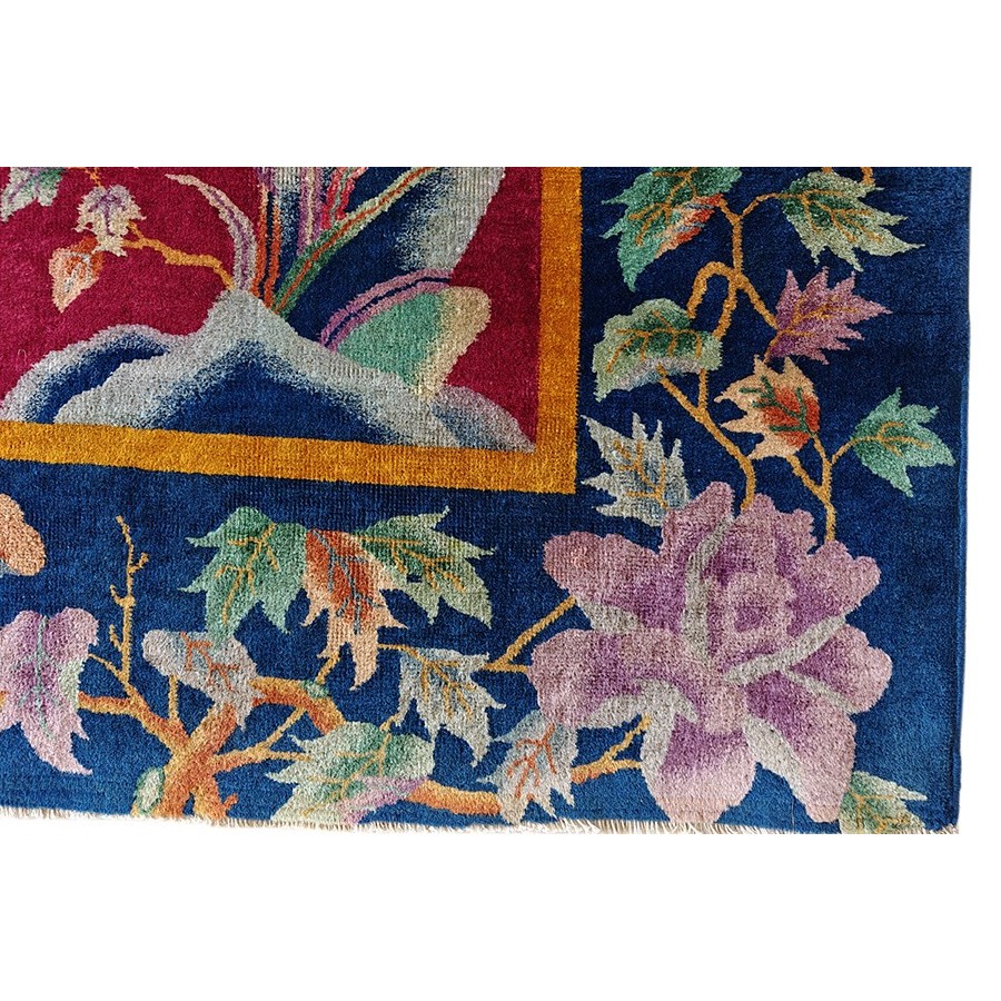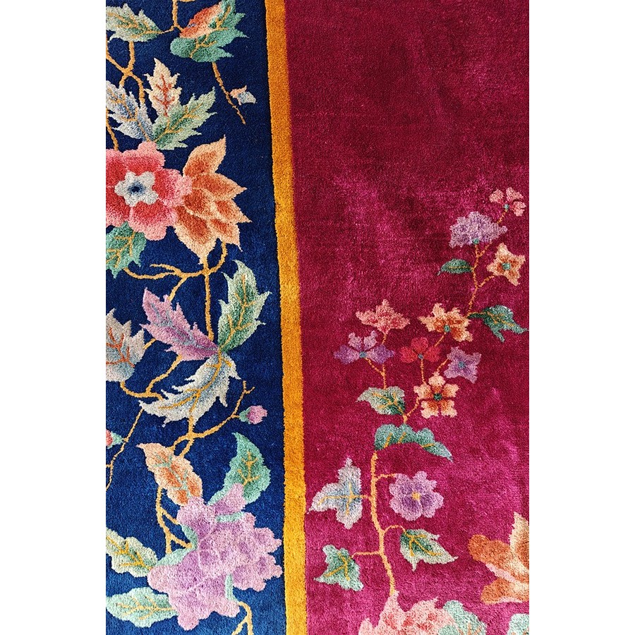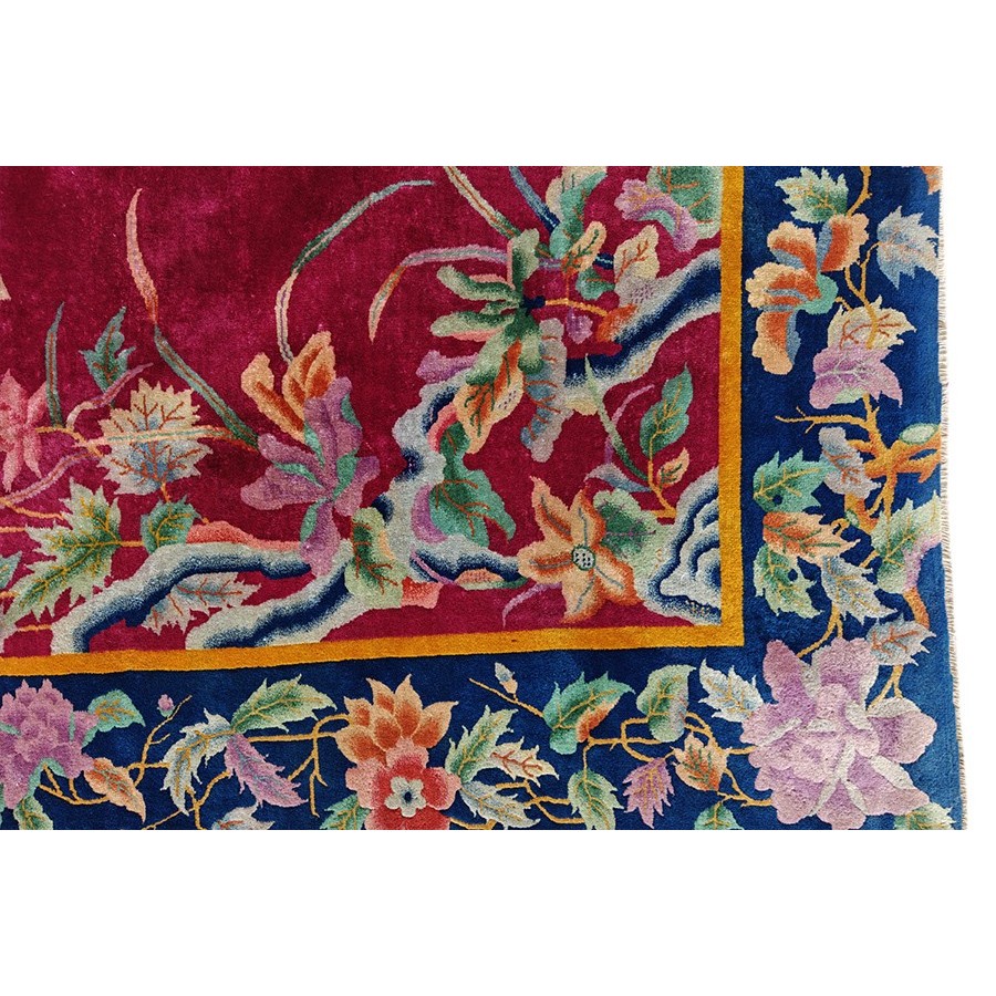 DescriptionChineseCarpets made in China proper. See entries Ningshia, Peking, Art Deco. Chinese - Art DecoAs the name implies, pieces woven between the wars for the Western market by mostly American owned firms especially Nichols and Fette, in thick heavy weaves using strong colors, asymmetric patterns and downplaying the Chinese-ness of the carpet. Nichols rugs are more strong toned than the pastel Fette. Most were woven in the coastal port city of Tientsin. Other lesser known workshops were also active. Some pieces are ultra-geometric and haute-Deco moderne in character: these are very rare. More frequent are pieces with bits of Chinese ornament: vases or other precious objects, paeonies, vines, fences, etc. Most common is the 9 x 12 size, in colors never found in mainstream Chinese rugs: backgrounds in black, mauve, purple, hot pink, orange, olive, employing the best synthetic chrome dyes of the period. Prices are still reasonable and carpets in top condition are available. | |