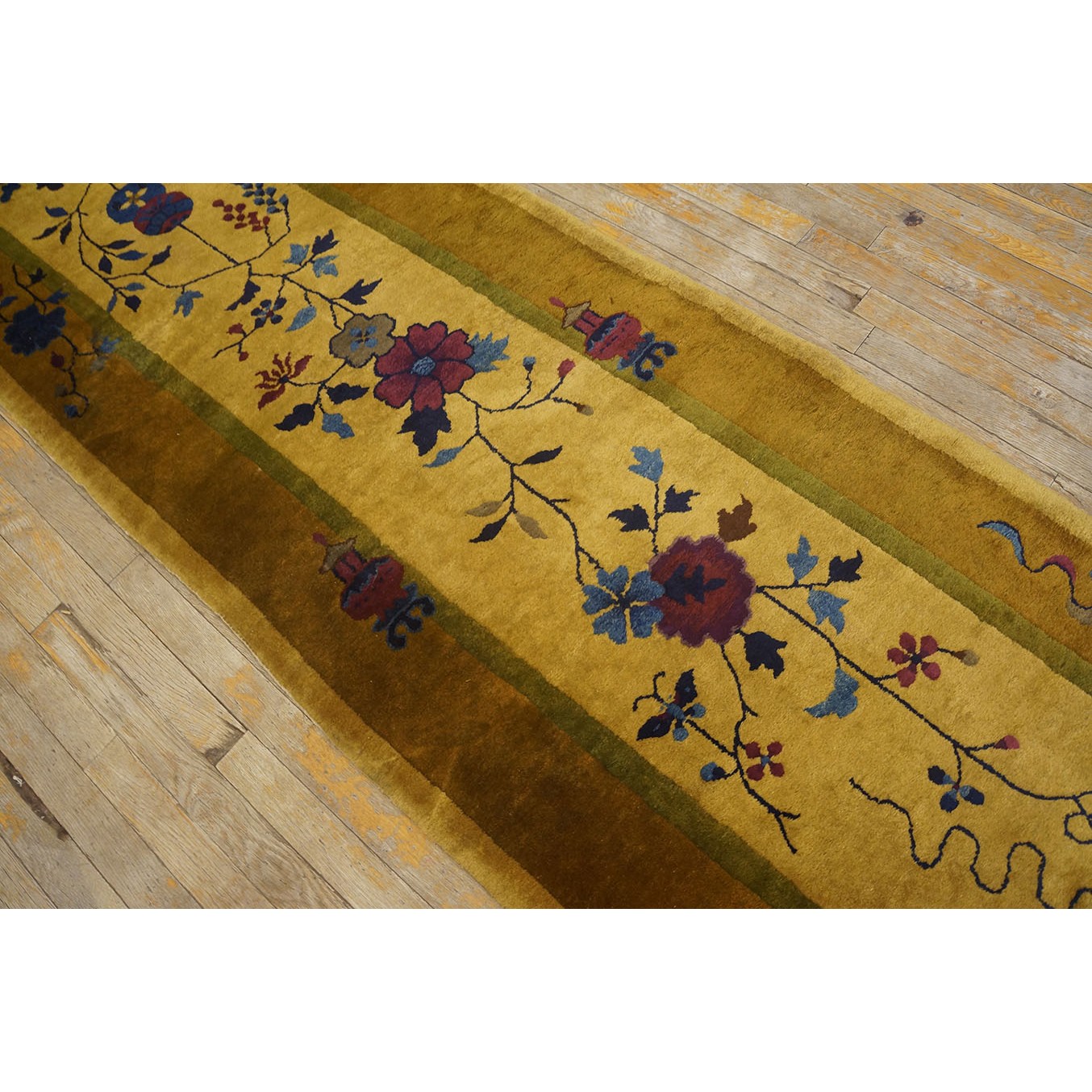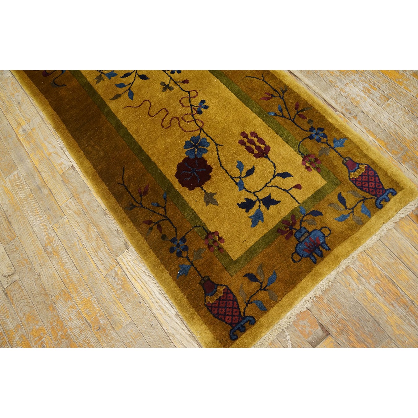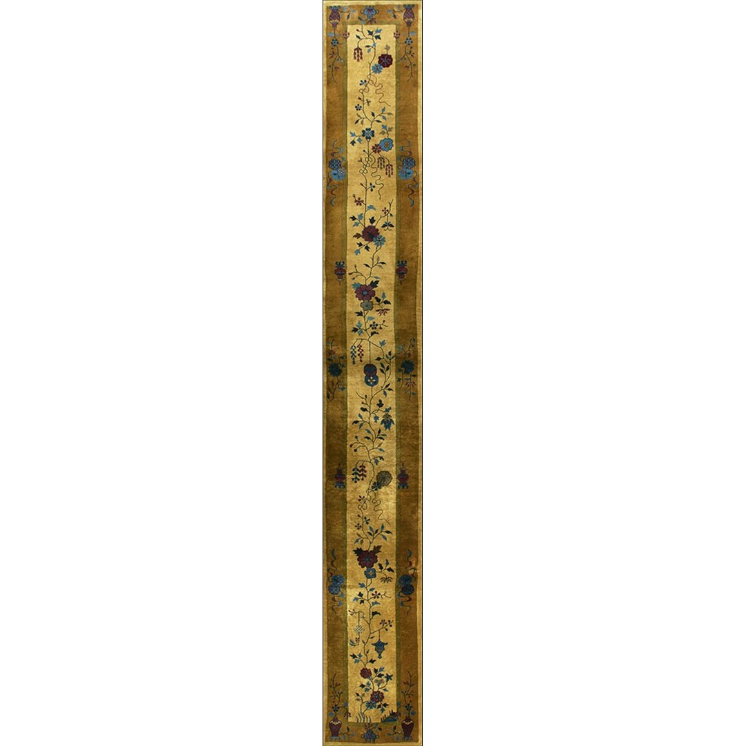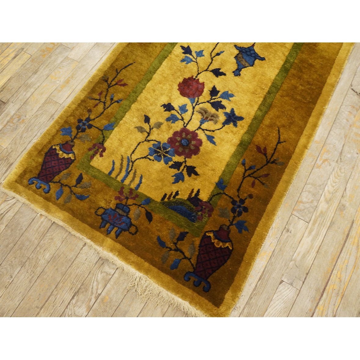 DescriptionChineseCarpets made in China proper. See entries Ningshia, Peking, Art Deco. Chinese - Art DecoAs the name implies, pieces woven between the wars for the Western market by mostly American owned firms especially Nichols and Fette, in thick heavy weaves using strong colors, asymmetric patterns and downplaying the Chinese-ness of the carpet. Nichols rugs are more strong toned than the pastel Fette. Most were woven in the coastal port city of Tientsin. Other lesser known workshops were also active. Some pieces are ultra-geometric and haute-Deco moderne in character: these are very rare. More frequent are pieces with bits of Chinese ornament: vases or other precious objects, paeonies, vines, fences, etc. Most common is the 9 x 12 size, in colors never found in mainstream Chinese rugs: backgrounds in black, mauve, purple, hot pink, orange, olive, employing the best synthetic chrome dyes of the period. Prices are still reasonable and carpets in top condition are available. | |