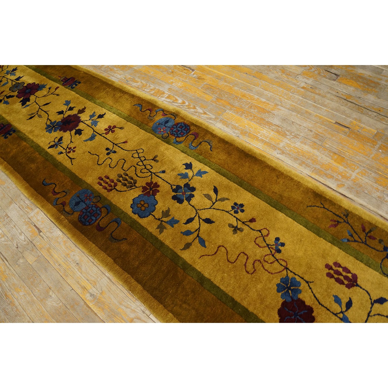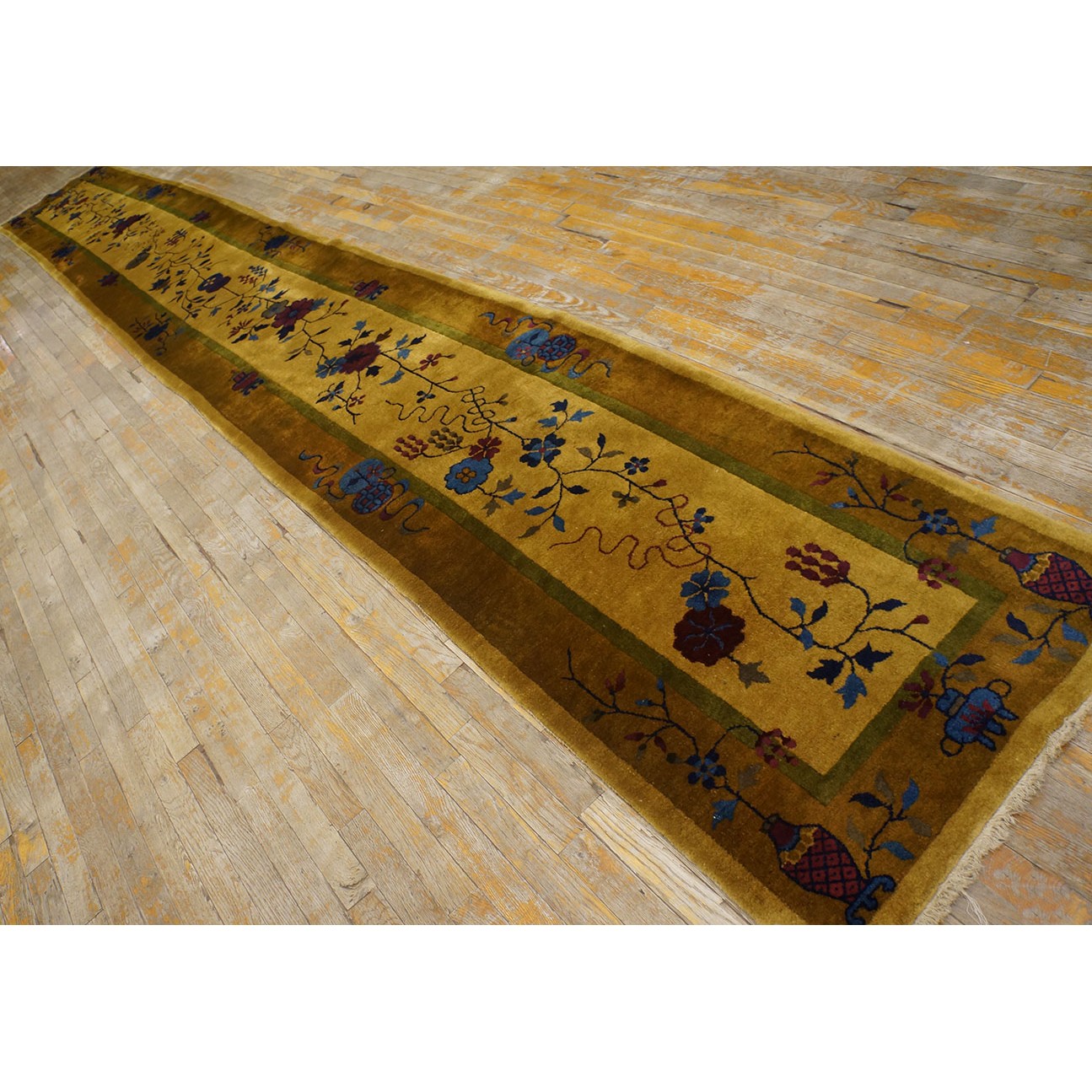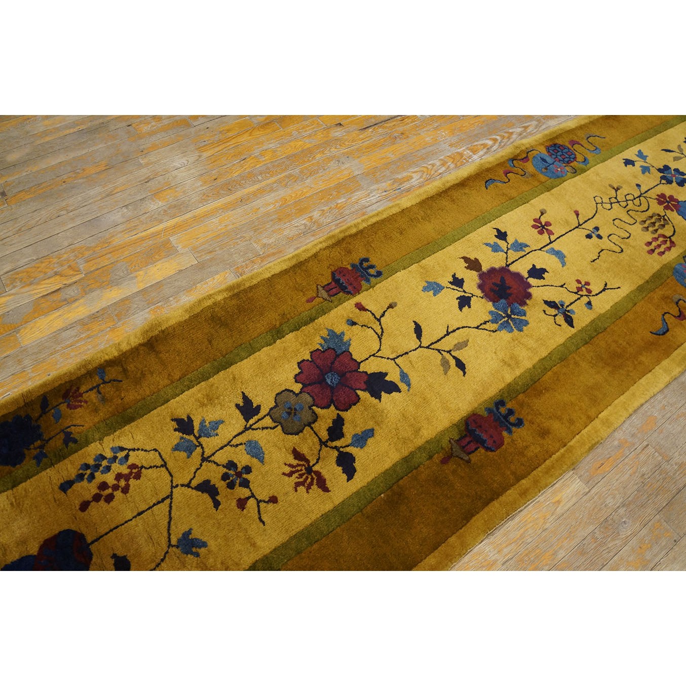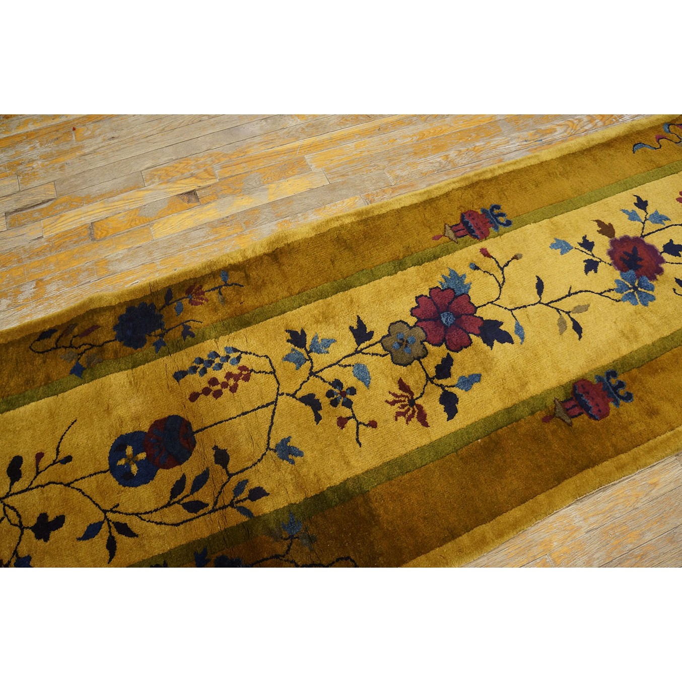 DescriptionChineseCarpets made in China proper. See entries Ningshia, Peking, Art Deco. Chinese - Art DecoAs the name implies, pieces woven between the wars for the Western market by mostly American owned firms especially Nichols and Fette, in thick heavy weaves using strong colors, asymmetric patterns and downplaying the Chinese-ness of the carpet. Nichols rugs are more strong toned than the pastel Fette. Most were woven in the coastal port city of Tientsin. Other lesser known workshops were also active. Some pieces are ultra-geometric and haute-Deco moderne in character: these are very rare. More frequent are pieces with bits of Chinese ornament: vases or other precious objects, paeonies, vines, fences, etc. Most common is the 9 x 12 size, in colors never found in mainstream Chinese rugs: backgrounds in black, mauve, purple, hot pink, orange, olive, employing the best synthetic chrome dyes of the period. Prices are still reasonable and carpets in top condition are available. | |