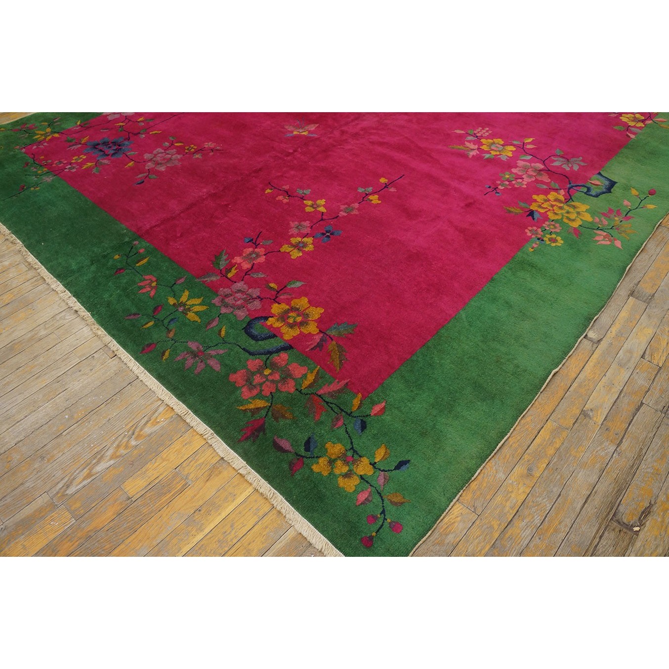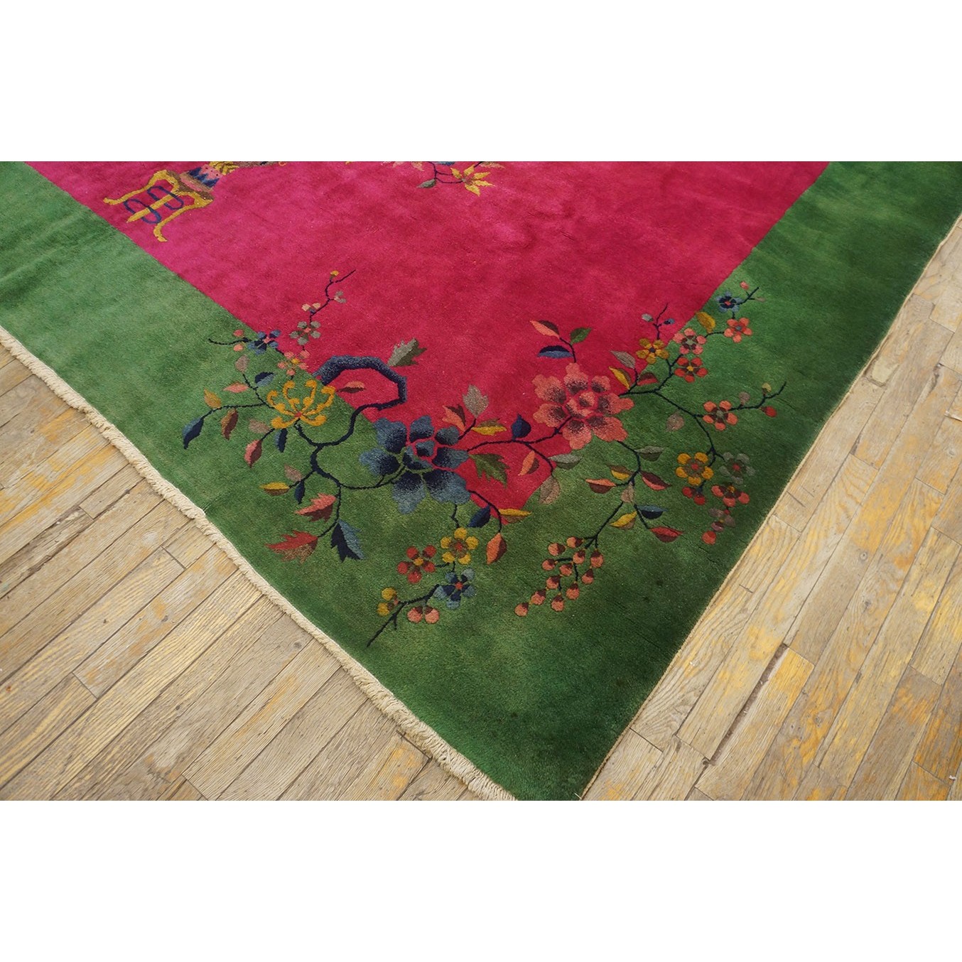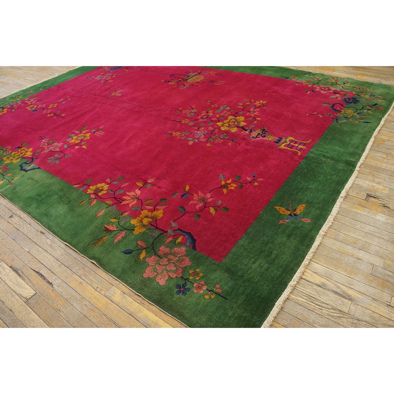 DescriptionChineseCarpets made in China proper. See entries Ningshia, Peking, Art Deco. Chinese - Art DecoAs the name implies, pieces woven between the wars for the Western market by mostly American owned firms especially Nichols and Fette, in thick heavy weaves using strong colors, asymmetric patterns and downplaying the Chinese-ness of the carpet. Nichols rugs are more strong toned than the pastel Fette. Most were woven in the coastal port city of Tientsin. Other lesser known workshops were also active. Some pieces are ultra-geometric and haute-Deco moderne in character: these are very rare. More frequent are pieces with bits of Chinese ornament: vases or other precious objects, paeonies, vines, fences, etc. Most common is the 9 x 12 size, in colors never found in mainstream Chinese rugs: backgrounds in black, mauve, purple, hot pink, orange, olive, employing the best synthetic chrome dyes of the period. Prices are still reasonable and carpets in top condition are available. | |