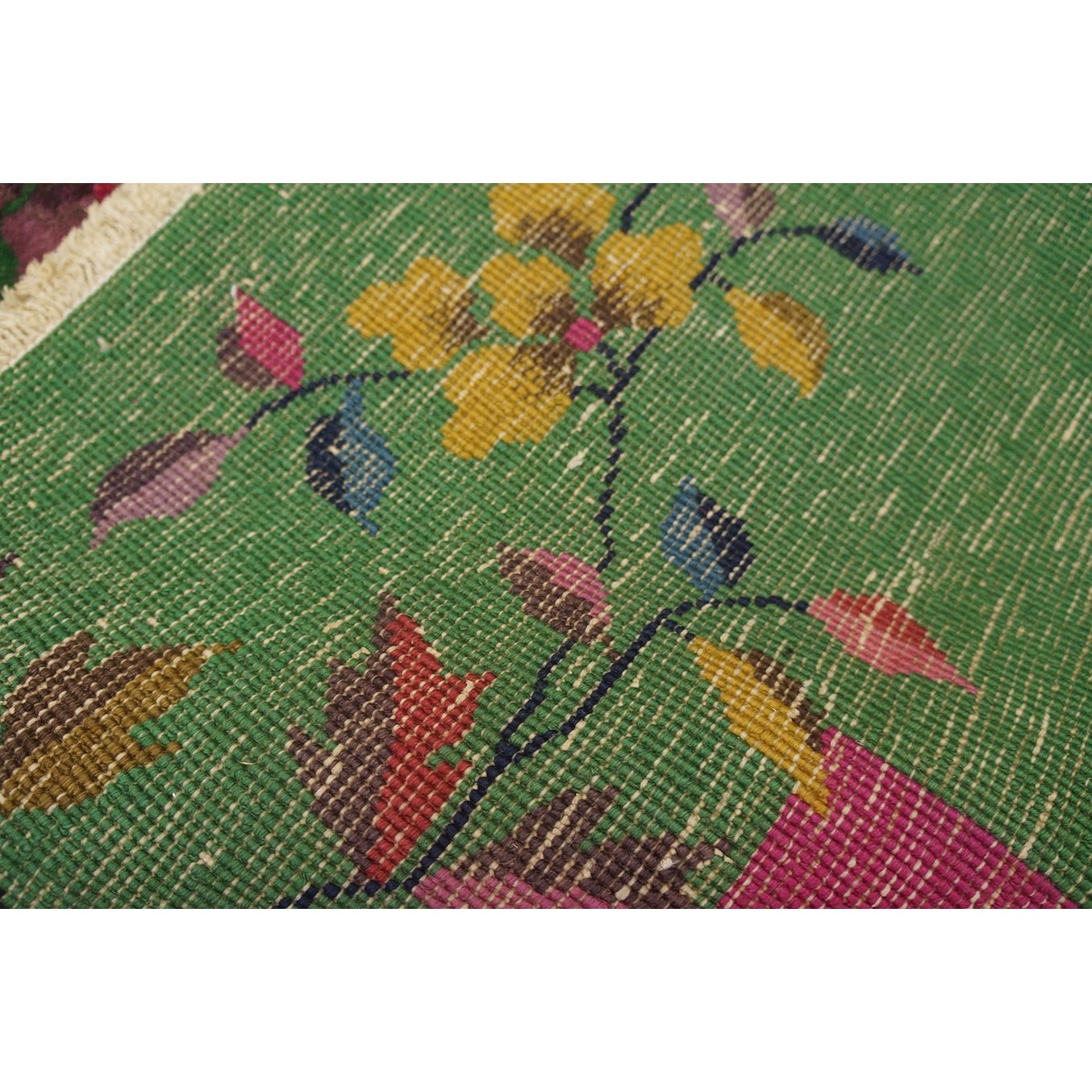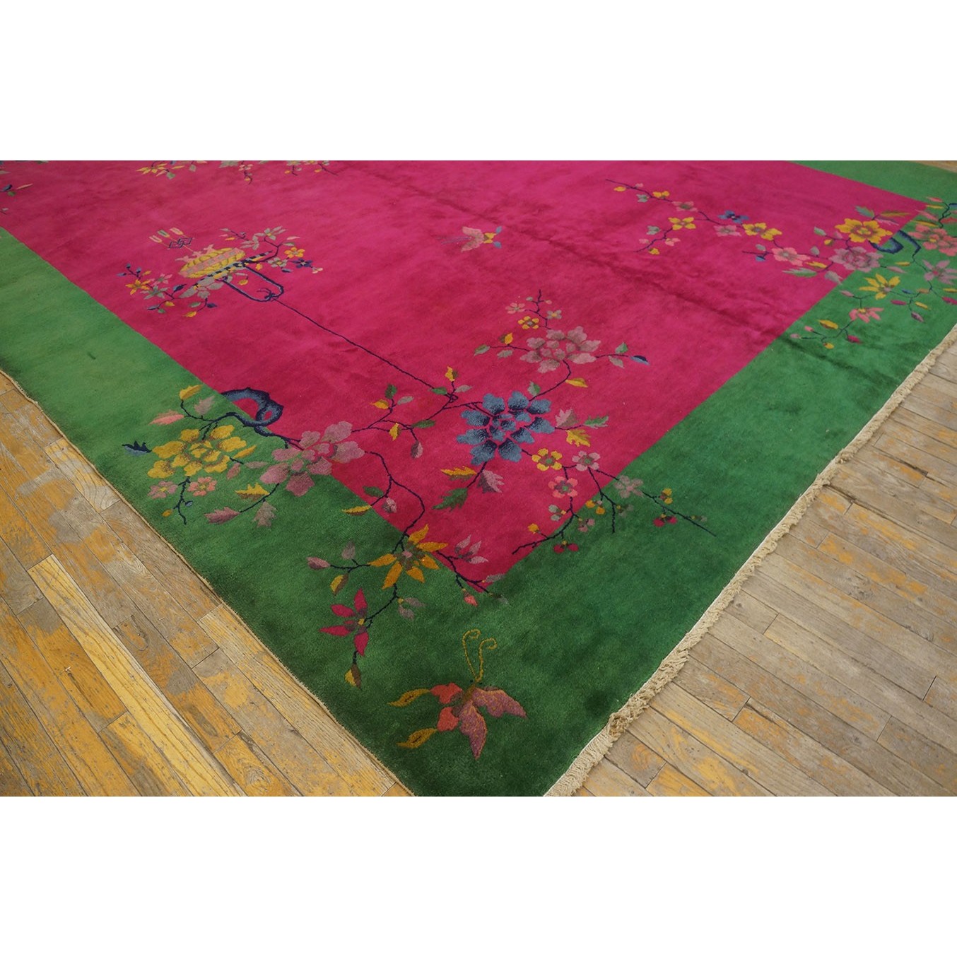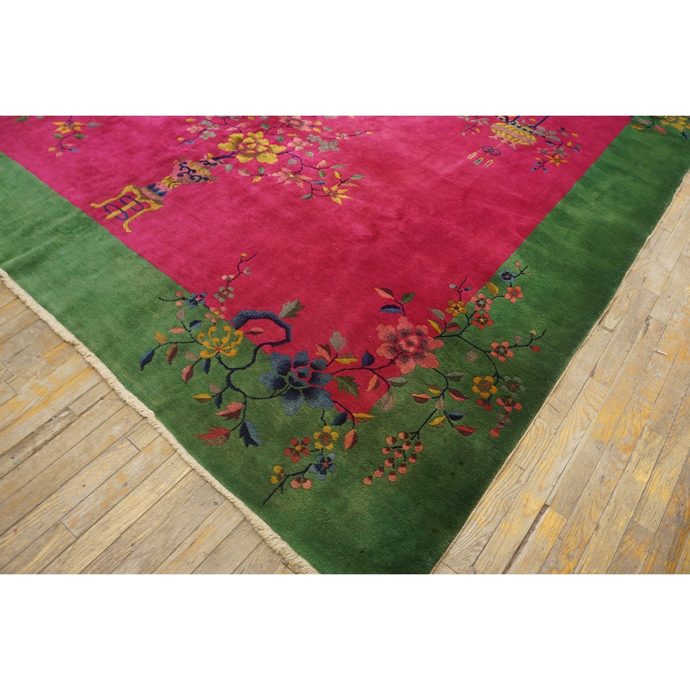 DescriptionChineseCarpets made in China proper. See entries Ningshia, Peking, Art Deco. Chinese - Art DecoAs the name implies, pieces woven between the wars for the Western market by mostly American owned firms especially Nichols and Fette, in thick heavy weaves using strong colors, asymmetric patterns and downplaying the Chinese-ness of the carpet. Nichols rugs are more strong toned than the pastel Fette. Most were woven in the coastal port city of Tientsin. Other lesser known workshops were also active. Some pieces are ultra-geometric and haute-Deco moderne in character: these are very rare. More frequent are pieces with bits of Chinese ornament: vases or other precious objects, paeonies, vines, fences, etc. Most common is the 9 x 12 size, in colors never found in mainstream Chinese rugs: backgrounds in black, mauve, purple, hot pink, orange, olive, employing the best synthetic chrome dyes of the period. Prices are still reasonable and carpets in top condition are available. | |