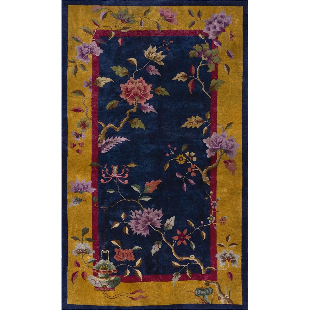 DescriptionChineseCarpets made in China proper. See entries Ningshia, Peking, Art Deco. Chinese - Art DecoAs the name implies, pieces woven between the wars for the Western market by mostly American owned firms especially Nichols and Fette, in thick heavy weaves using strong colors, asymmetric patterns and downplaying the Chinese-ness of the carpet. Nichols rugs are more strong toned than the pastel Fette. Most were woven in the coastal port city of Tientsin. Other lesser known workshops were also active. Some pieces are ultra-geometric and haute-Deco moderne in character: these are very rare. More frequent are pieces with bits of Chinese ornament: vases or other precious objects, paeonies, vines, fences, etc. Most common is the 9 x 12 size, in colors never found in mainstream Chinese rugs: backgrounds in black, mauve, purple, hot pink, orange, olive, employing the best synthetic chrome dyes of the period. Prices are still reasonable and carpets in top condition are available. | |