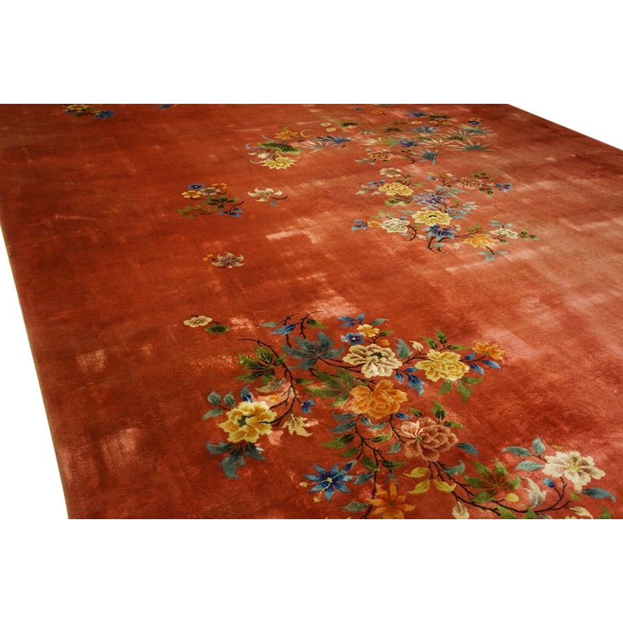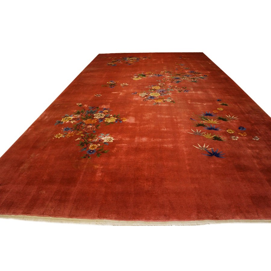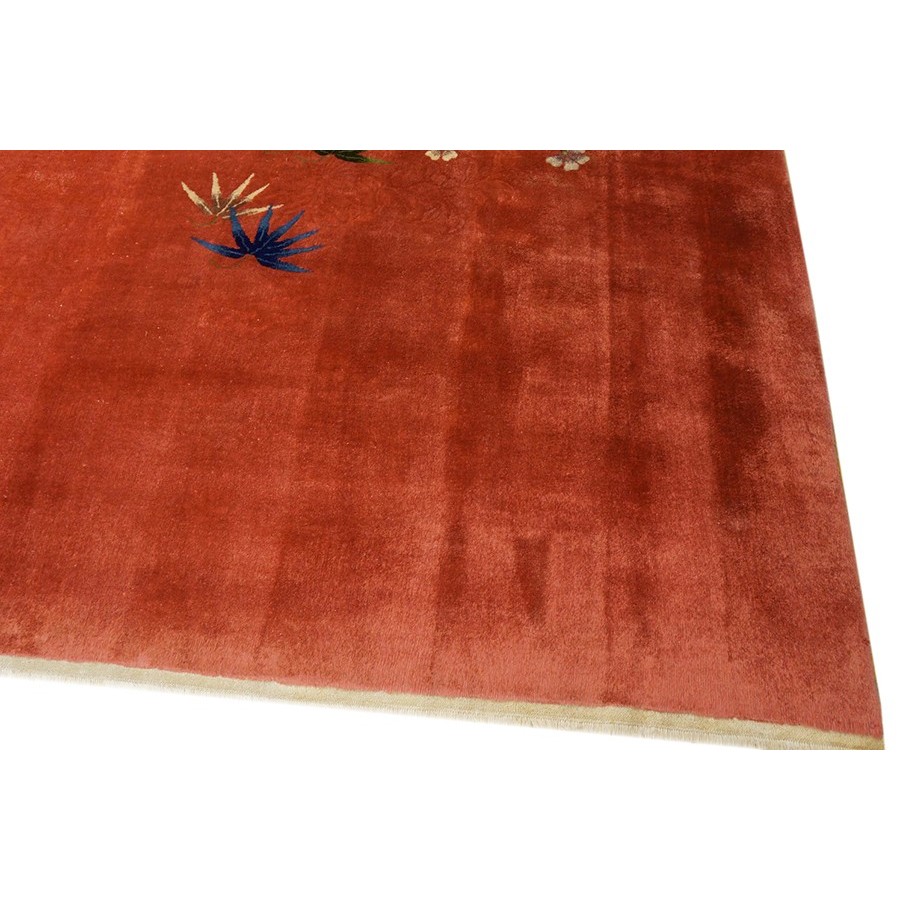 DescriptionChineseCarpets made in China proper. See entries Ningshia, Peking, Art Deco. Chinese - Art DecoAs the name implies, pieces woven between the wars for the Western market by mostly American owned firms especially Nichols and Fette, in thick heavy weaves using strong colors, asymmetric patterns and downplaying the Chinese-ness of the carpet. Nichols rugs are more strong toned than the pastel Fette. Most were woven in the coastal port city of Tientsin. Other lesser known workshops were also active. Some pieces are ultra-geometric and haute-Deco moderne in character: these are very rare. More frequent are pieces with bits of Chinese ornament: vases or other precious objects, paeonies, vines, fences, etc. Most common is the 9 x 12 size, in colors never found in mainstream Chinese rugs: backgrounds in black, mauve, purple, hot pink, orange, olive, employing the best synthetic chrome dyes of the period. Prices are still reasonable and carpets in top condition are available. | |