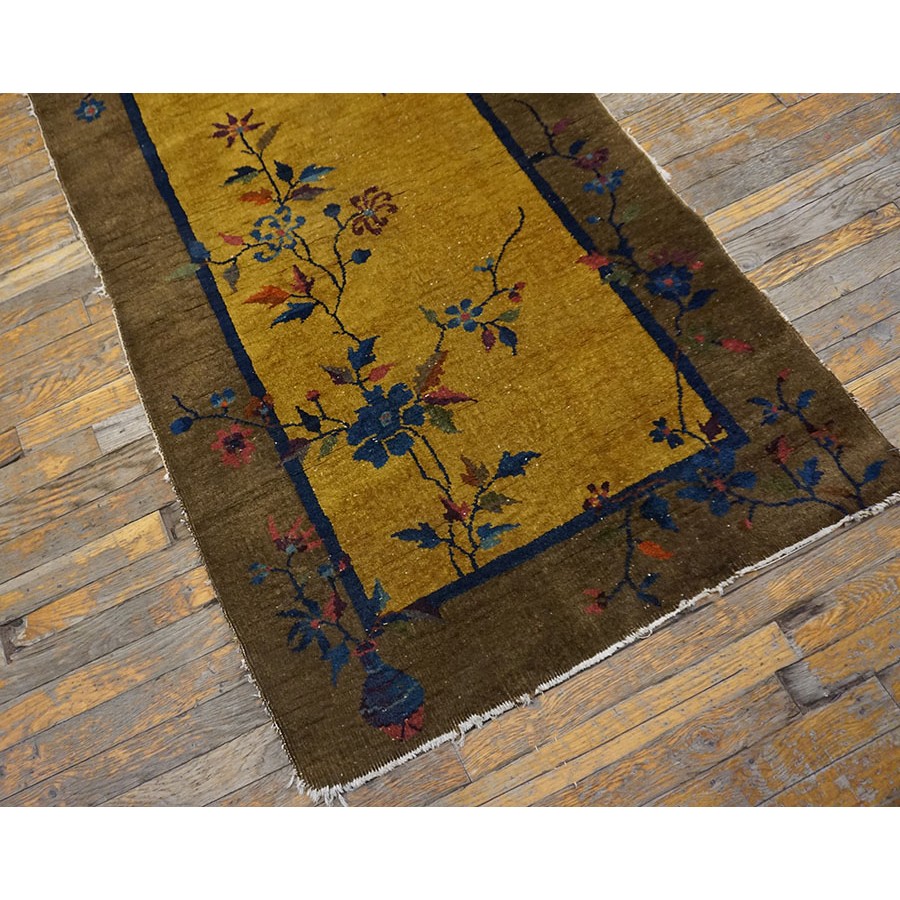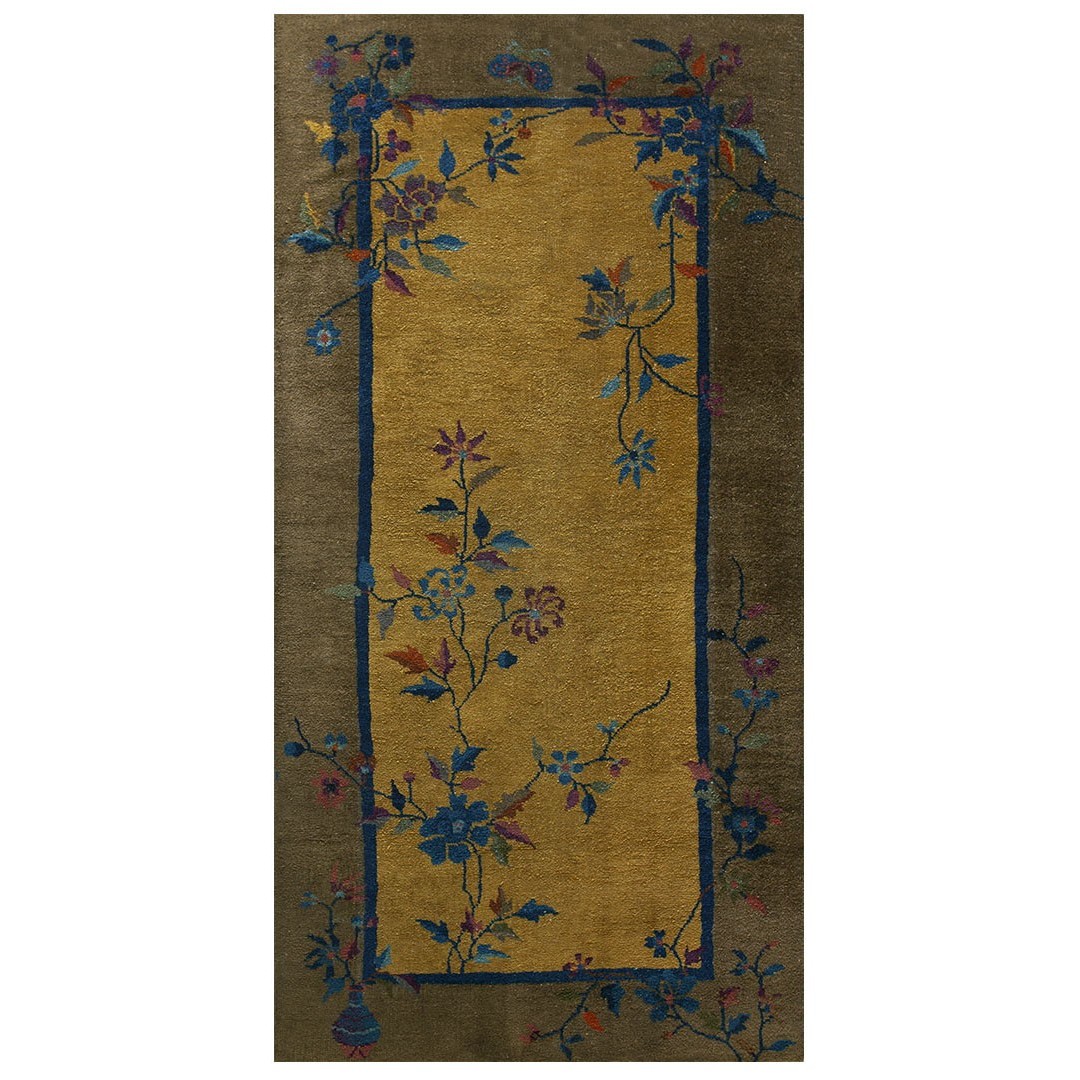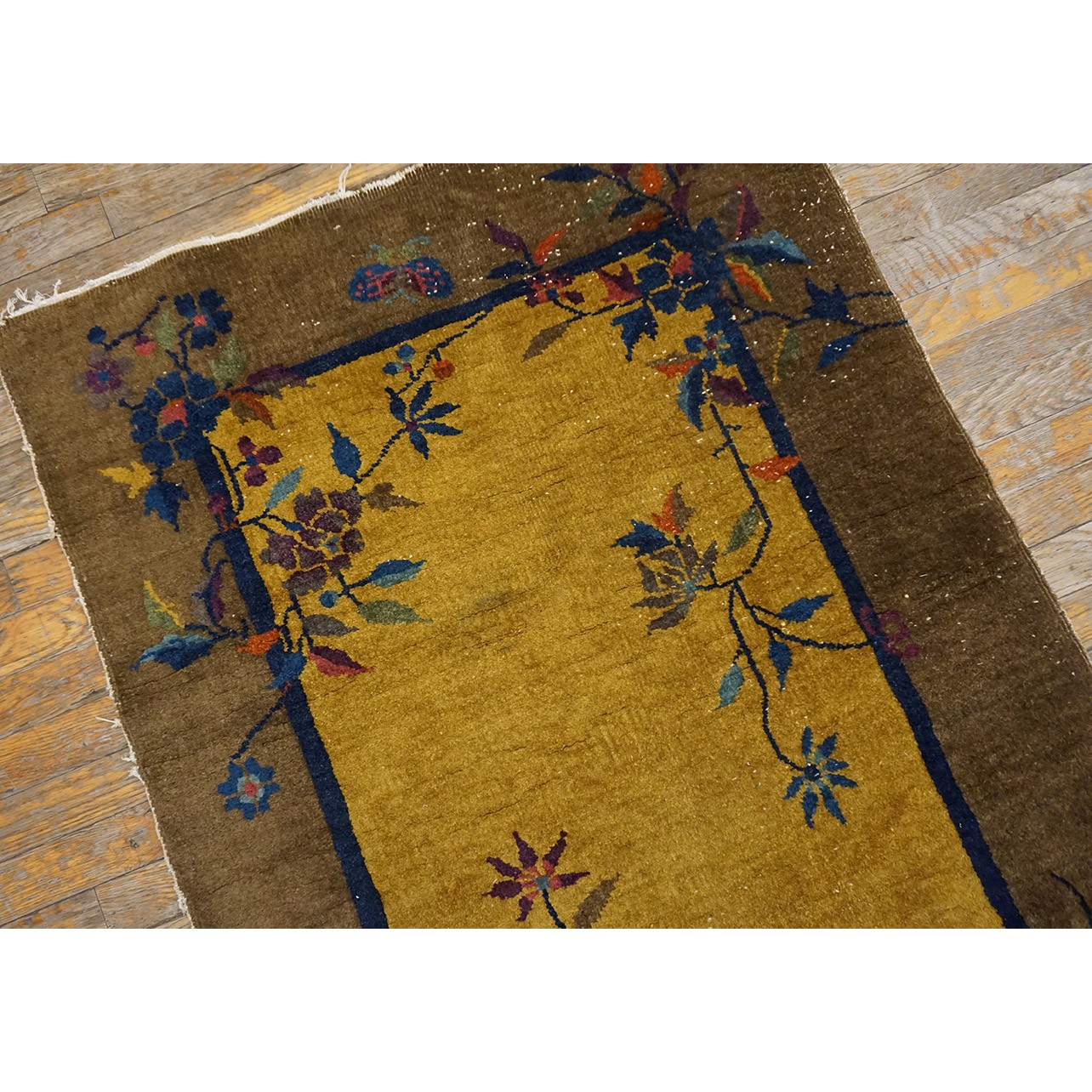 DescriptionChineseCarpets made in China proper. See entries Ningshia, Peking, Art Deco. Chinese - Art DecoAs the name implies, pieces woven between the wars for the Western market by mostly American owned firms especially Nichols and Fette, in thick heavy weaves using strong colors, asymmetric patterns and downplaying the Chinese-ness of the carpet. Nichols rugs are more strong toned than the pastel Fette. Most were woven in the coastal port city of Tientsin. Other lesser known workshops were also active. Some pieces are ultra-geometric and haute-Deco moderne in character: these are very rare. More frequent are pieces with bits of Chinese ornament: vases or other precious objects, paeonies, vines, fences, etc. Most common is the 9 x 12 size, in colors never found in mainstream Chinese rugs: backgrounds in black, mauve, purple, hot pink, orange, olive, employing the best synthetic chrome dyes of the period. Prices are still reasonable and carpets in top condition are available. | |