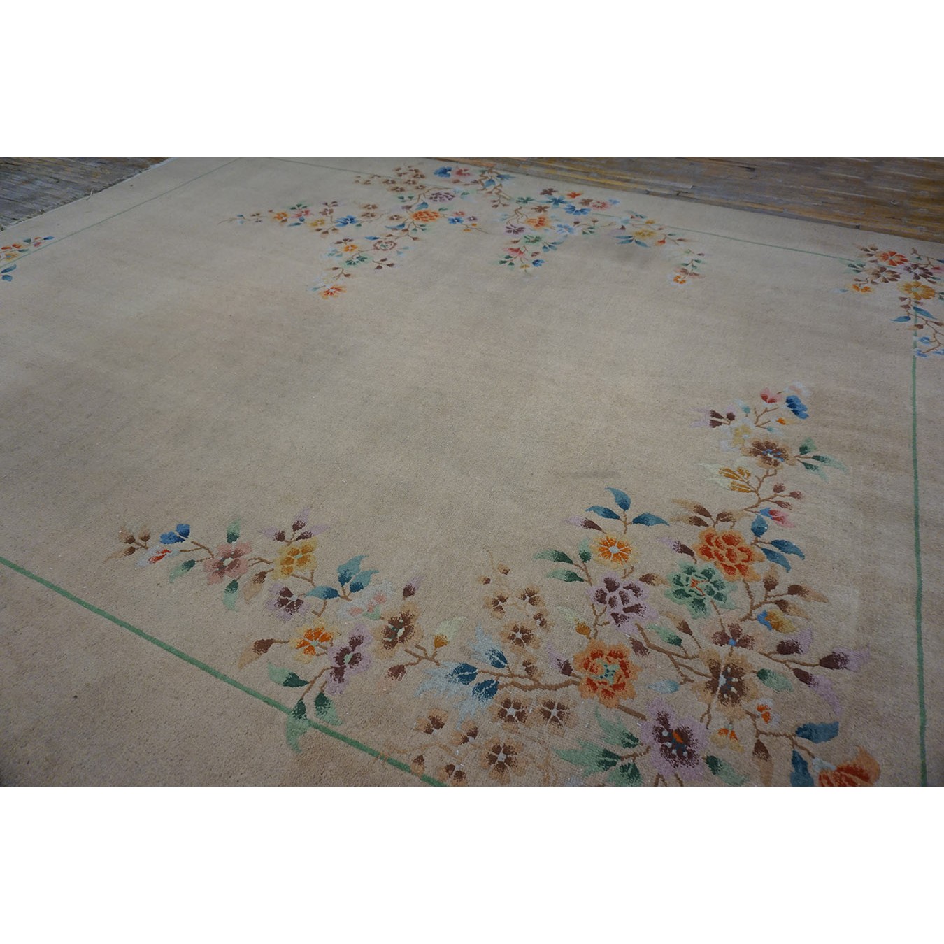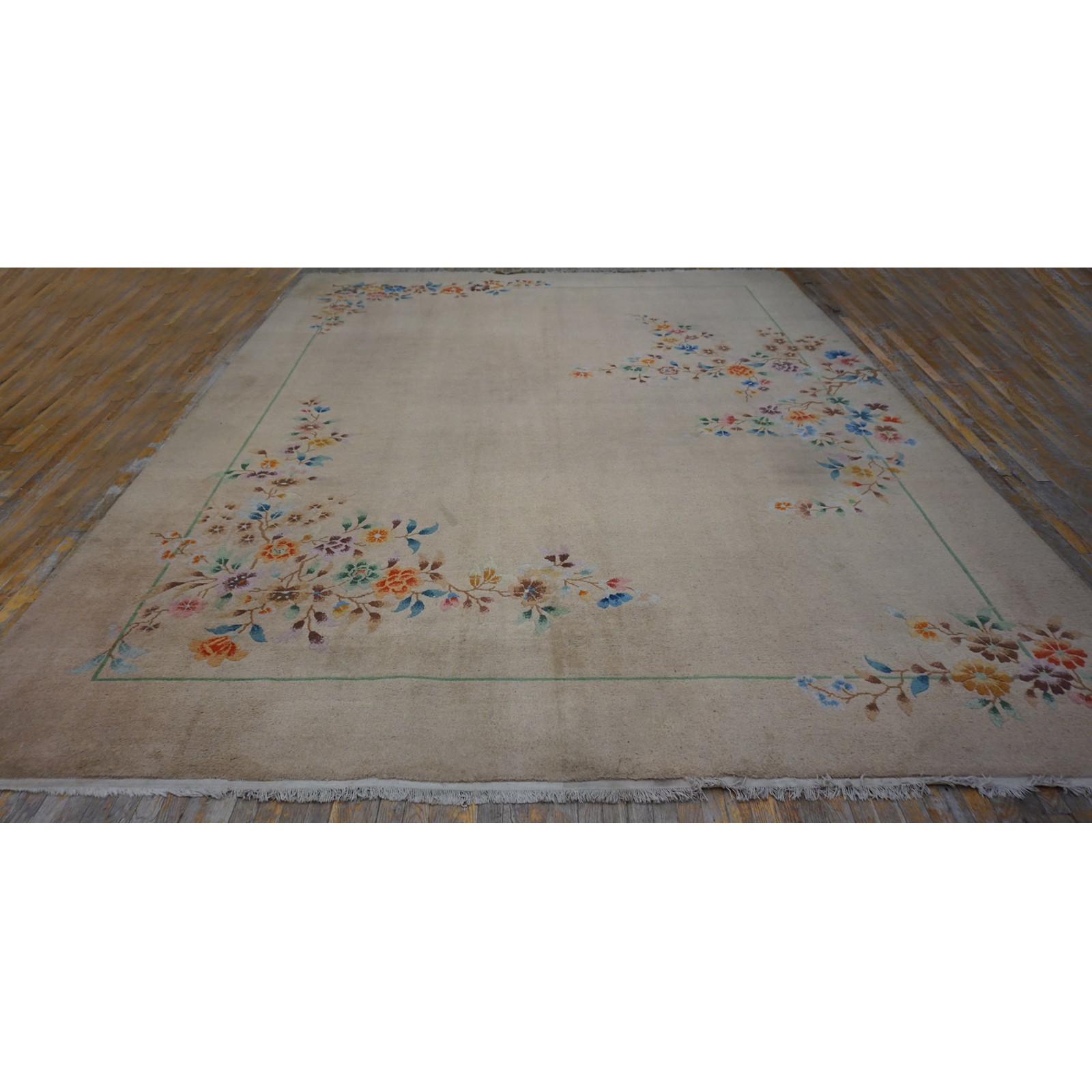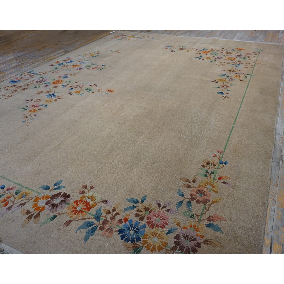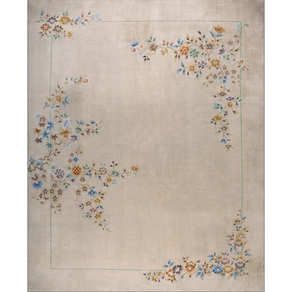 DescriptionChineseCarpets made in China proper. See entries Ningshia, Peking, Art Deco. Chinese - Art DecoAs the name implies, pieces woven between the wars for the Western market by mostly American owned firms especially Nichols and Fette, in thick heavy weaves using strong colors, asymmetric patterns and downplaying the Chinese-ness of the carpet. Nichols rugs are more strong toned than the pastel Fette. Most were woven in the coastal port city of Tientsin. Other lesser known workshops were also active. Some pieces are ultra-geometric and haute-Deco moderne in character: these are very rare. More frequent are pieces with bits of Chinese ornament: vases or other precious objects, paeonies, vines, fences, etc. Most common is the 9 x 12 size, in colors never found in mainstream Chinese rugs: backgrounds in black, mauve, purple, hot pink, orange, olive, employing the best synthetic chrome dyes of the period. Prices are still reasonable and carpets in top condition are available. | |