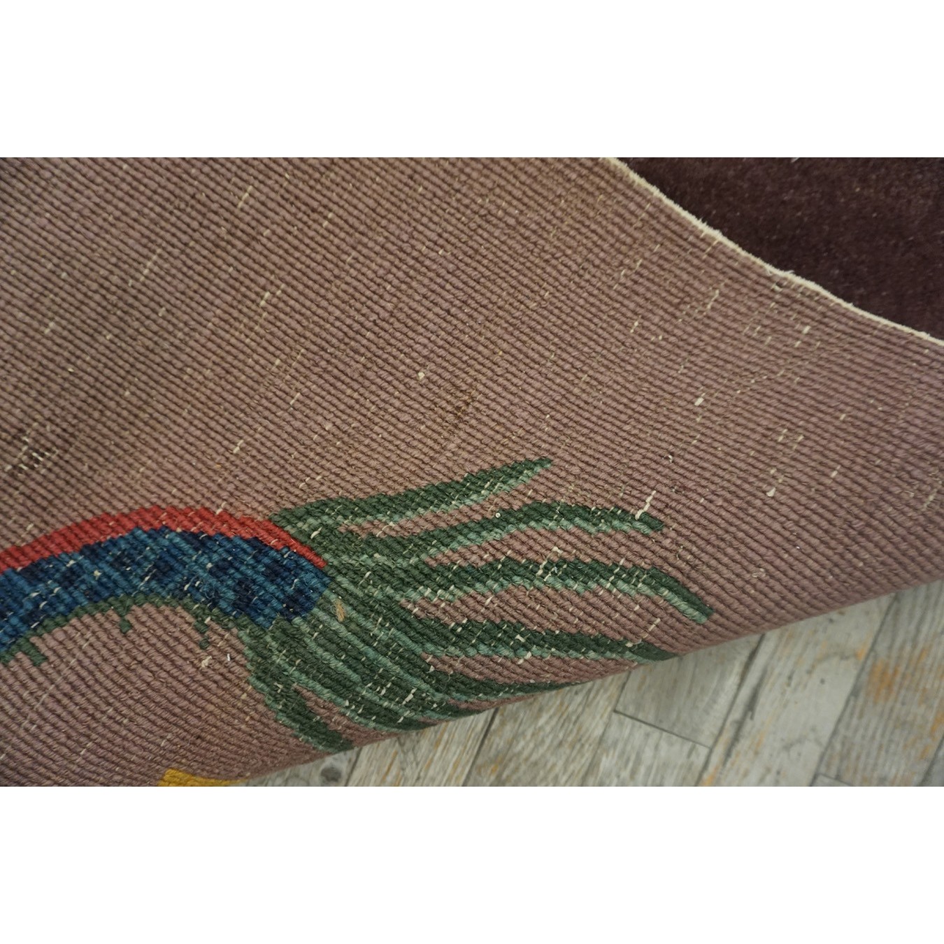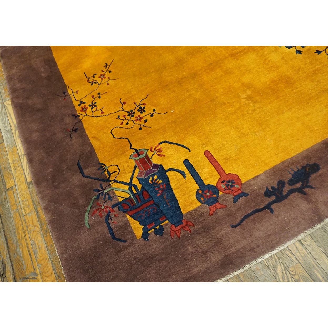DescriptionChineseCarpets made in China proper. See entries Ningshia, Peking, Art Deco. Chinese - Art DecoAs the name implies, pieces woven between the wars for the Western market by mostly American owned firms especially Nichols and Fette, in thick heavy weaves using strong colors, asymmetric patterns and downplaying the Chinese-ness of the carpet. Nichols rugs are more strong toned than the pastel Fette. Most were woven in the coastal port city of Tientsin. Other lesser known workshops were also active. Some pieces are ultra-geometric and haute-Deco moderne in character: these are very rare. More frequent are pieces with bits of Chinese ornament: vases or other precious objects, paeonies, vines, fences, etc. Most common is the 9 x 12 size, in colors never found in mainstream Chinese rugs: backgrounds in black, mauve, purple, hot pink, orange, olive, employing the best synthetic chrome dyes of the period. Prices are still reasonable and carpets in top condition are available. | |