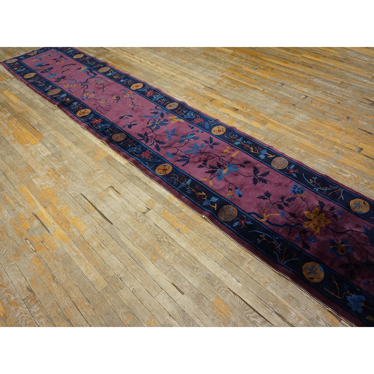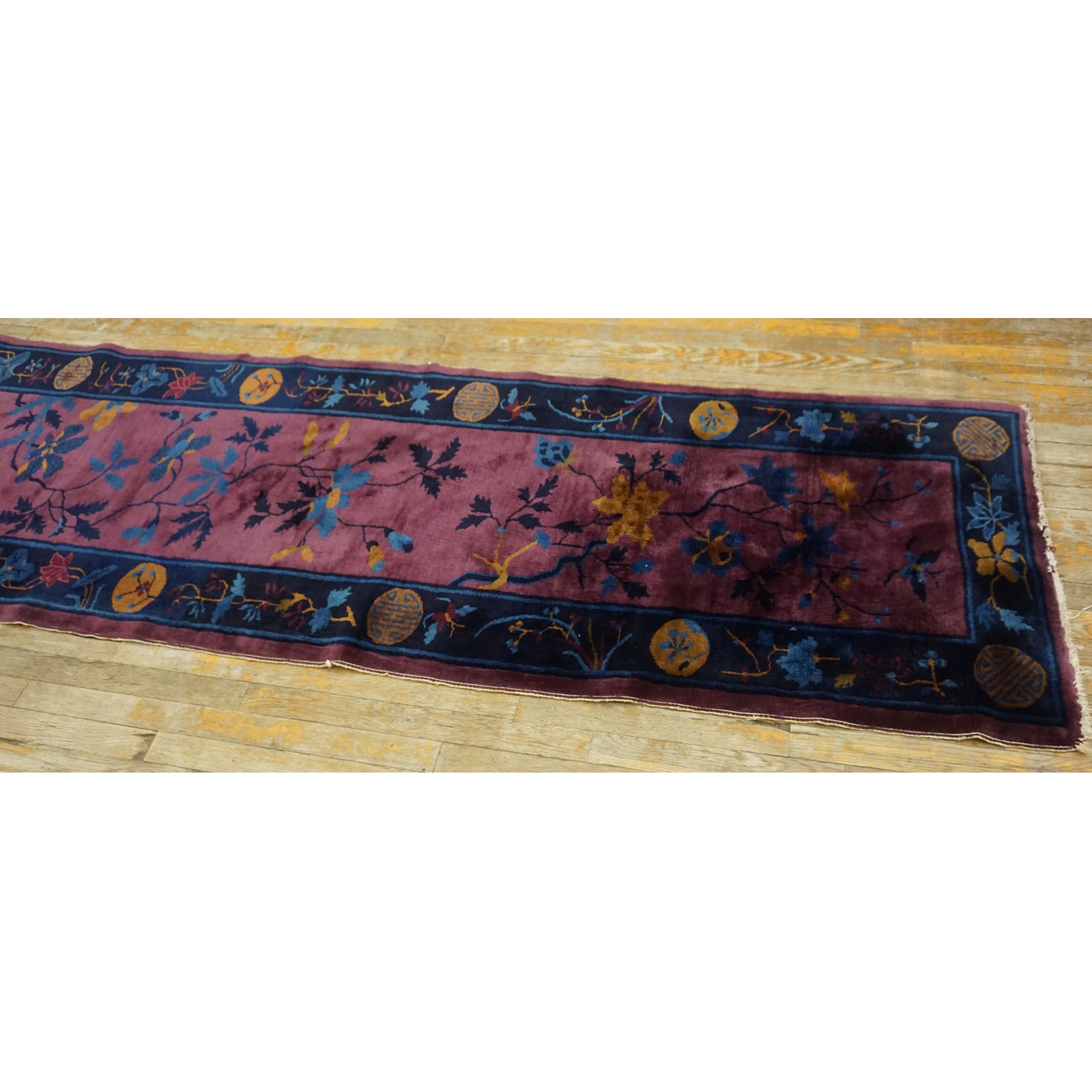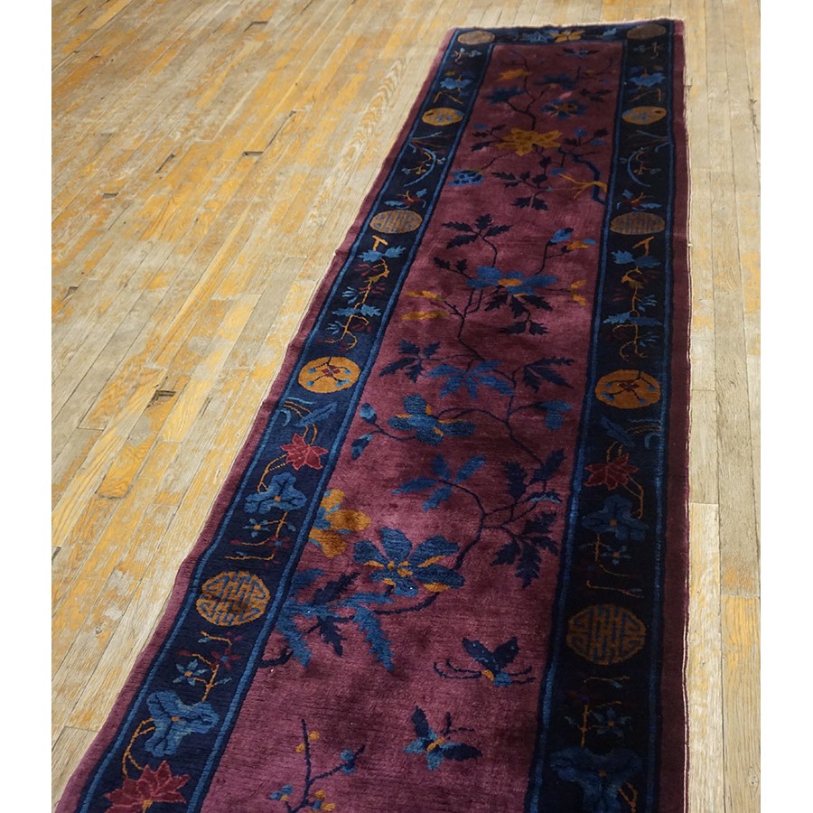 DescriptionChineseCarpets made in China proper. See entries Ningshia, Peking, Art Deco. Chinese - Art DecoAs the name implies, pieces woven between the wars for the Western market by mostly American owned firms especially Nichols and Fette, in thick heavy weaves using strong colors, asymmetric patterns and downplaying the Chinese-ness of the carpet. Nichols rugs are more strong toned than the pastel Fette. Most were woven in the coastal port city of Tientsin. Other lesser known workshops were also active. Some pieces are ultra-geometric and haute-Deco moderne in character: these are very rare. More frequent are pieces with bits of Chinese ornament: vases or other precious objects, paeonies, vines, fences, etc. Most common is the 9 x 12 size, in colors never found in mainstream Chinese rugs: backgrounds in black, mauve, purple, hot pink, orange, olive, employing the best synthetic chrome dyes of the period. Prices are still reasonable and carpets in top condition are available. | |