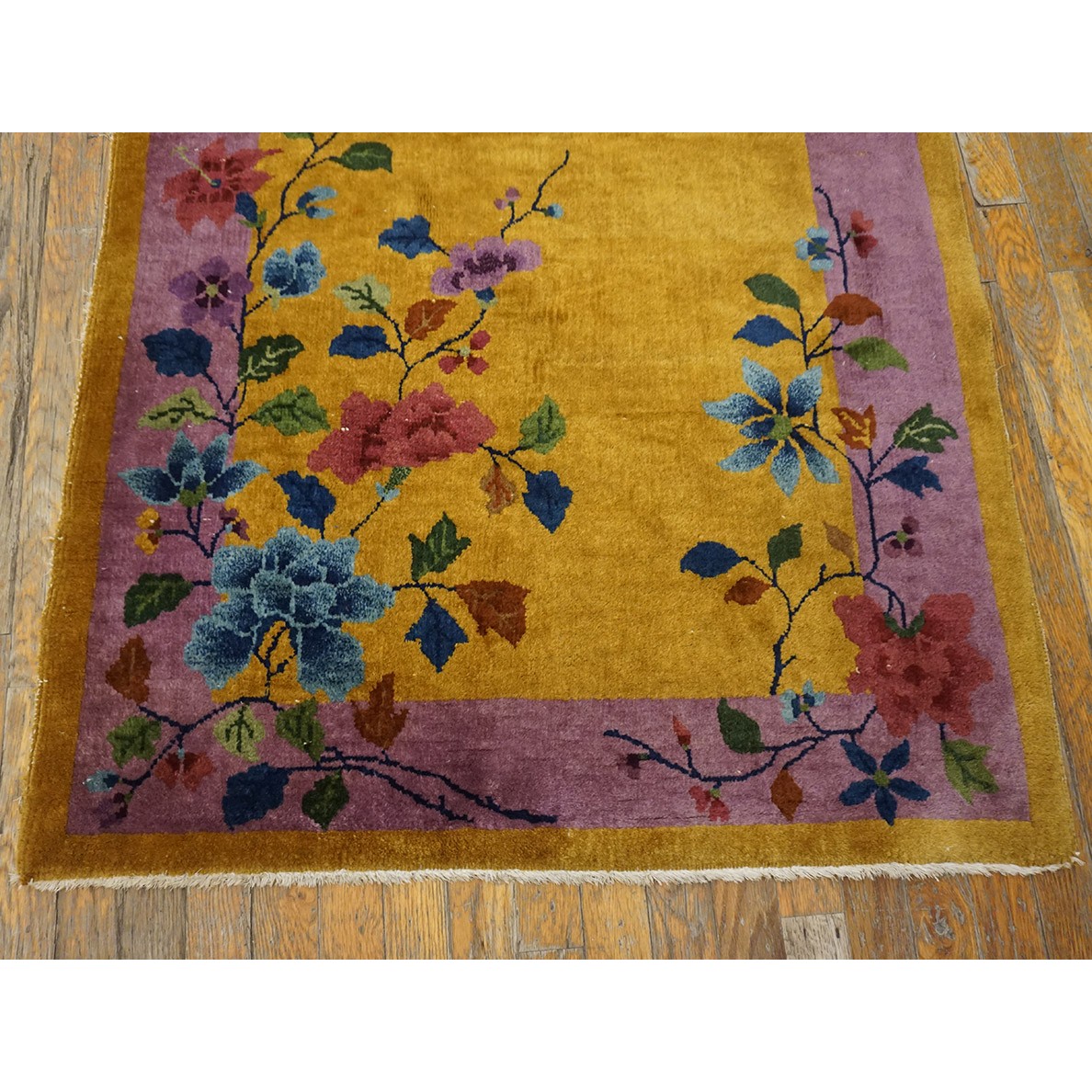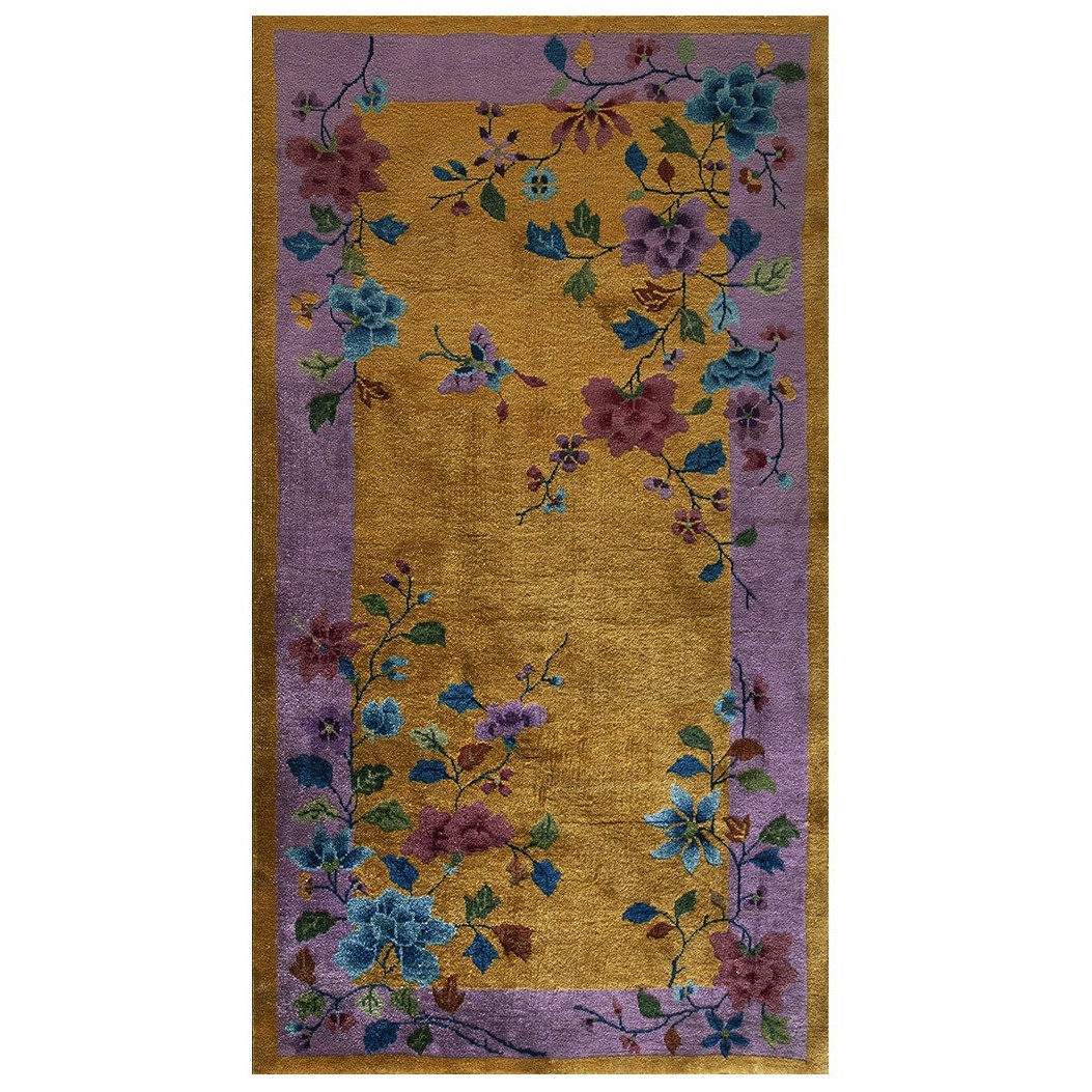DescriptionChineseCarpets made in China proper. See entries Ningshia, Peking, Art Deco. Chinese - Art DecoAs the name implies, pieces woven between the wars for the Western market by mostly American owned firms especially Nichols and Fette, in thick heavy weaves using strong colors, asymmetric patterns and downplaying the Chinese-ness of the carpet. Nichols rugs are more strong toned than the pastel Fette. Most were woven in the coastal port city of Tientsin. Other lesser known workshops were also active. Some pieces are ultra-geometric and haute-Deco moderne in character: these are very rare. More frequent are pieces with bits of Chinese ornament: vases or other precious objects, paeonies, vines, fences, etc. Most common is the 9 x 12 size, in colors never found in mainstream Chinese rugs: backgrounds in black, mauve, purple, hot pink, orange, olive, employing the best synthetic chrome dyes of the period. Prices are still reasonable and carpets in top condition are available. | |