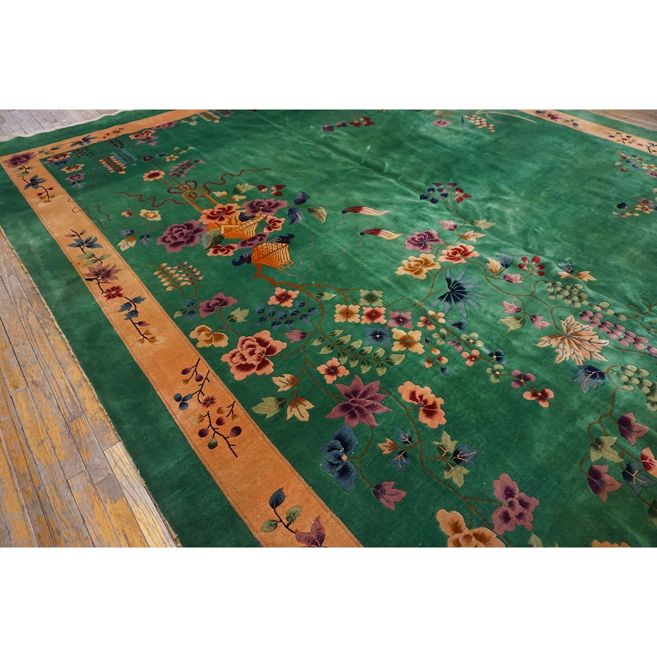 DescriptionChineseCarpets made in China proper. See entries Ningshia, Peking, Art Deco. Chinese - Art DecoAs the name implies, pieces woven between the wars for the Western market by mostly American owned firms especially Nichols and Fette, in thick heavy weaves using strong colors, asymmetric patterns and downplaying the Chinese-ness of the carpet. Nichols rugs are more strong toned than the pastel Fette. Most were woven in the coastal port city of Tientsin. Other lesser known workshops were also active. Some pieces are ultra-geometric and haute-Deco moderne in character: these are very rare. More frequent are pieces with bits of Chinese ornament: vases or other precious objects, paeonies, vines, fences, etc. Most common is the 9 x 12 size, in colors never found in mainstream Chinese rugs: backgrounds in black, mauve, purple, hot pink, orange, olive, employing the best synthetic chrome dyes of the period. Prices are still reasonable and carpets in top condition are available. | |