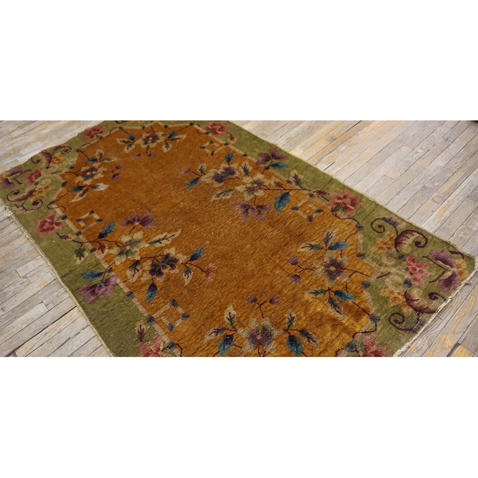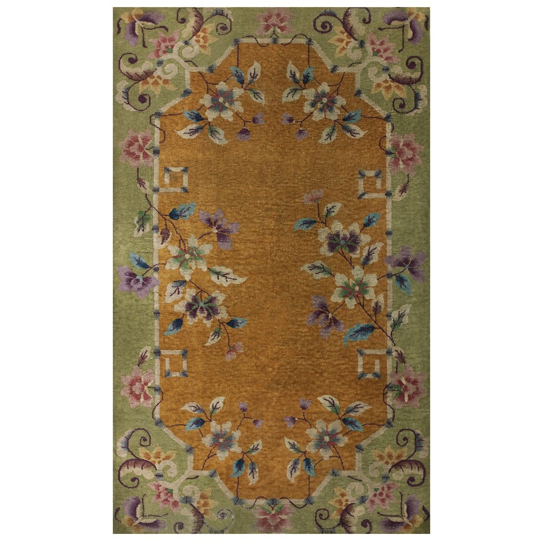 DescriptionChineseCarpets made in China proper. See entries Ningshia, Peking, Art Deco. Chinese - Art DecoAs the name implies, pieces woven between the wars for the Western market by mostly American owned firms especially Nichols and Fette, in thick heavy weaves using strong colors, asymmetric patterns and downplaying the Chinese-ness of the carpet. Nichols rugs are more strong toned than the pastel Fette. Most were woven in the coastal port city of Tientsin. Other lesser known workshops were also active. Some pieces are ultra-geometric and haute-Deco moderne in character: these are very rare. More frequent are pieces with bits of Chinese ornament: vases or other precious objects, paeonies, vines, fences, etc. Most common is the 9 x 12 size, in colors never found in mainstream Chinese rugs: backgrounds in black, mauve, purple, hot pink, orange, olive, employing the best synthetic chrome dyes of the period. Prices are still reasonable and carpets in top condition are available. | |