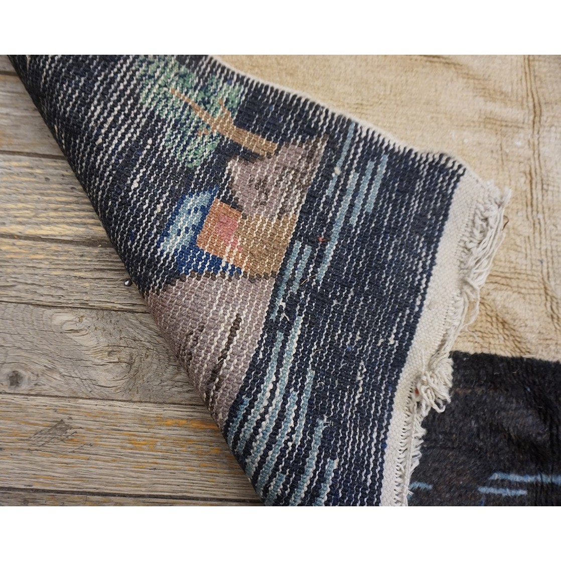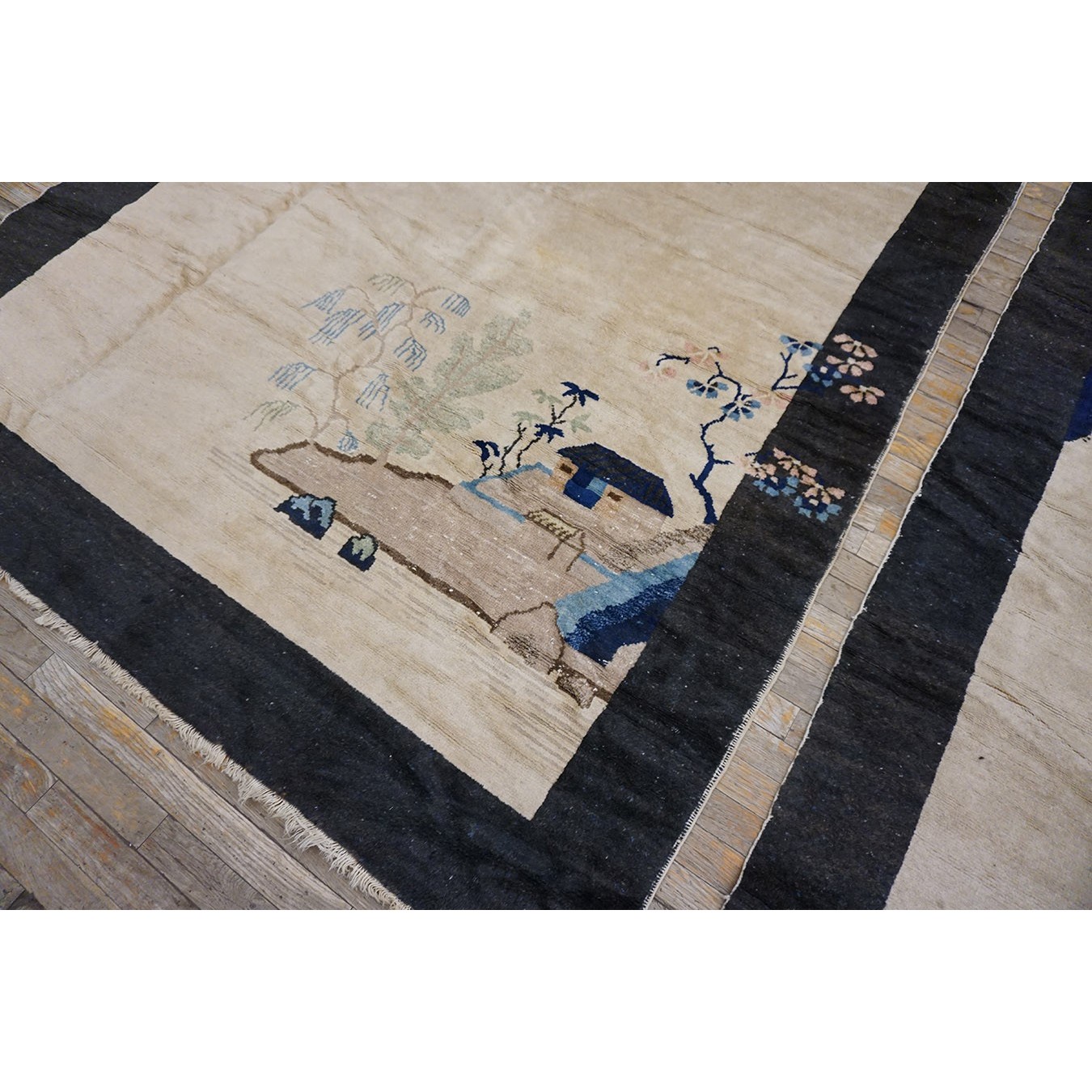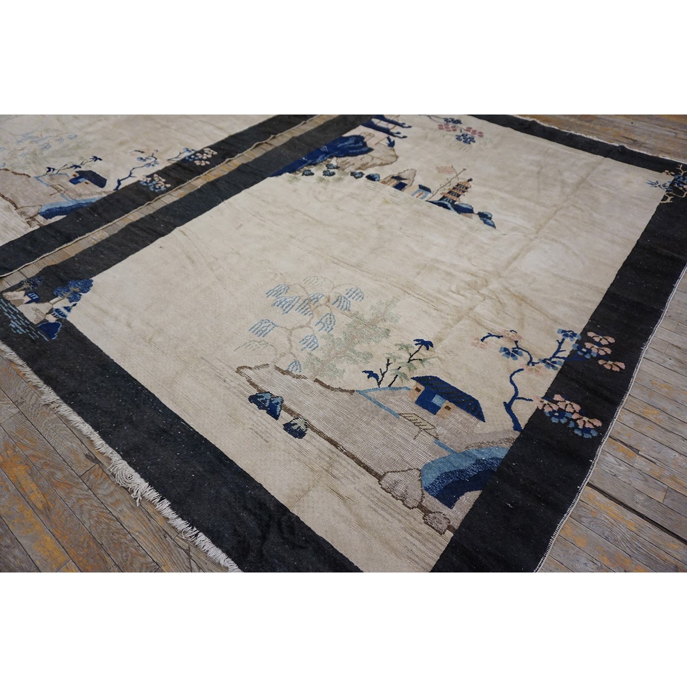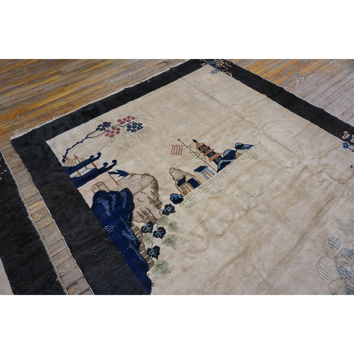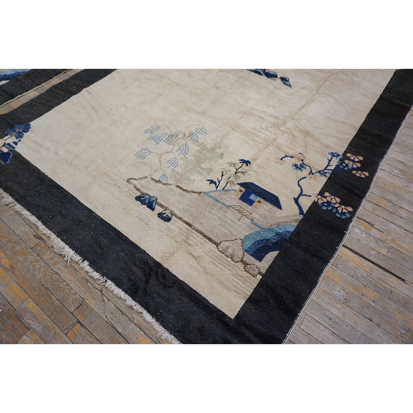 DescriptionChineseCarpets made in China proper. See entries Ningshia, Peking, Art Deco. Chinese - Art DecoAs the name implies, pieces woven between the wars for the Western market by mostly American owned firms especially Nichols and Fette, in thick heavy weaves using strong colors, asymmetric patterns and downplaying the Chinese-ness of the carpet. Nichols rugs are more strong toned than the pastel Fette. Most were woven in the coastal port city of Tientsin. Other lesser known workshops were also active. Some pieces are ultra-geometric and haute-Deco moderne in character: these are very rare. More frequent are pieces with bits of Chinese ornament: vases or other precious objects, paeonies, vines, fences, etc. Most common is the 9 x 12 size, in colors never found in mainstream Chinese rugs: backgrounds in black, mauve, purple, hot pink, orange, olive, employing the best synthetic chrome dyes of the period. Prices are still reasonable and carpets in top condition are available. | |