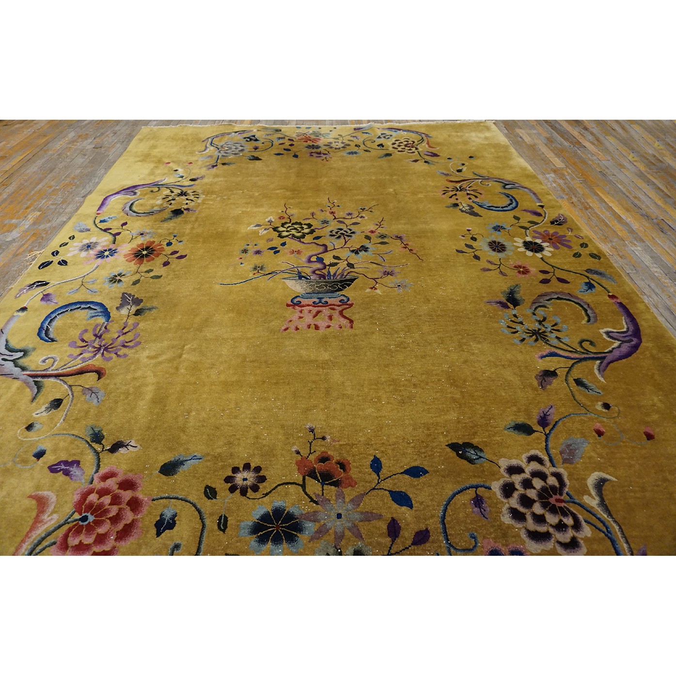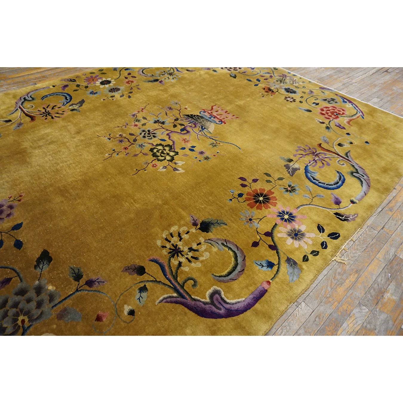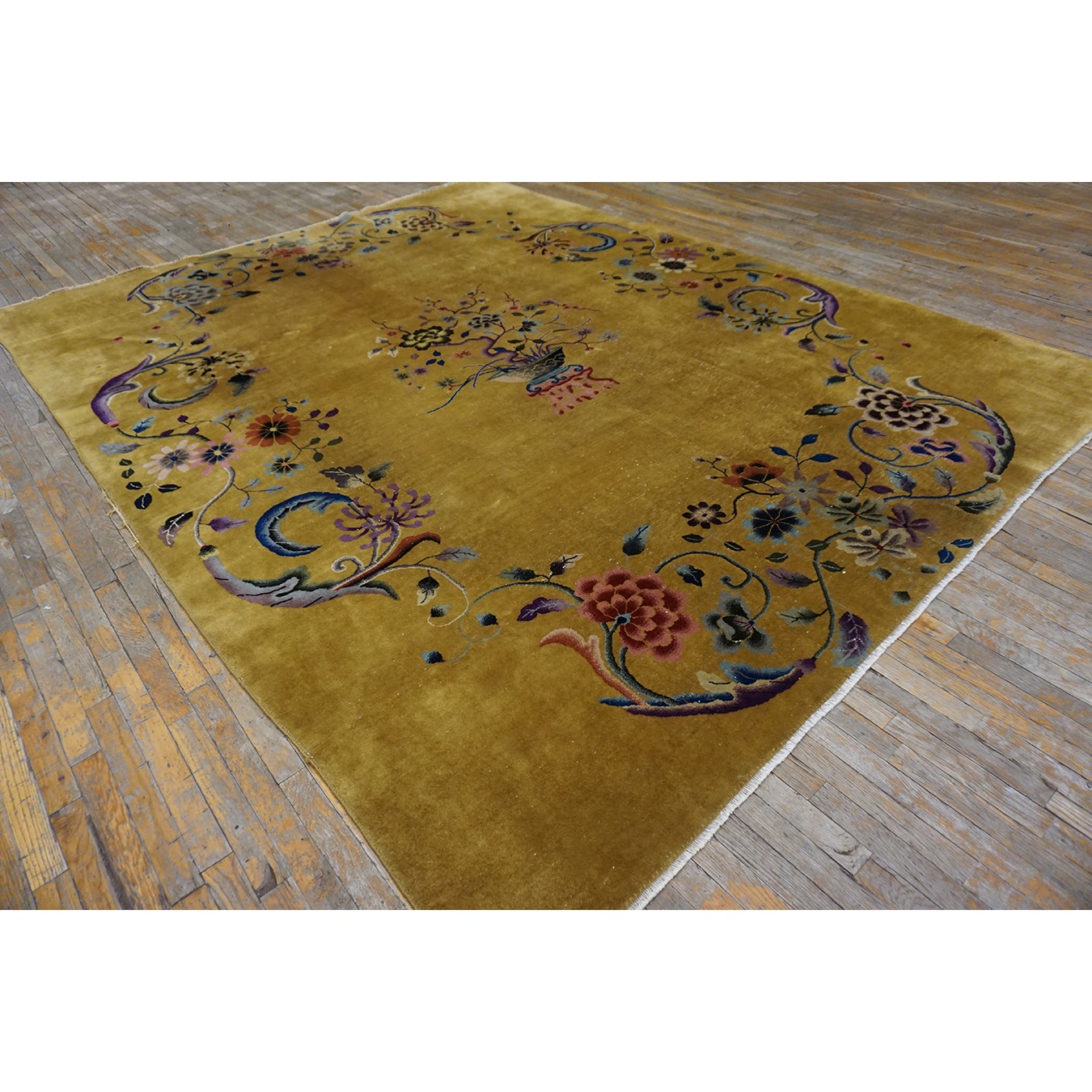 DescriptionChineseCarpets made in China proper. See entries Ningshia, Peking, Art Deco. Chinese - Art DecoAs the name implies, pieces woven between the wars for the Western market by mostly American owned firms especially Nichols and Fette, in thick heavy weaves using strong colors, asymmetric patterns and downplaying the Chinese-ness of the carpet. Nichols rugs are more strong toned than the pastel Fette. Most were woven in the coastal port city of Tientsin. Other lesser known workshops were also active. Some pieces are ultra-geometric and haute-Deco moderne in character: these are very rare. More frequent are pieces with bits of Chinese ornament: vases or other precious objects, paeonies, vines, fences, etc. Most common is the 9 x 12 size, in colors never found in mainstream Chinese rugs: backgrounds in black, mauve, purple, hot pink, orange, olive, employing the best synthetic chrome dyes of the period. Prices are still reasonable and carpets in top condition are available. | |