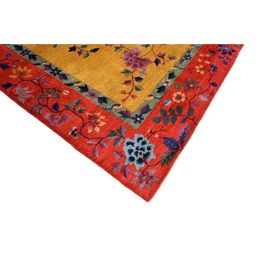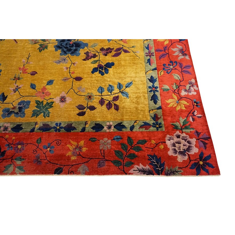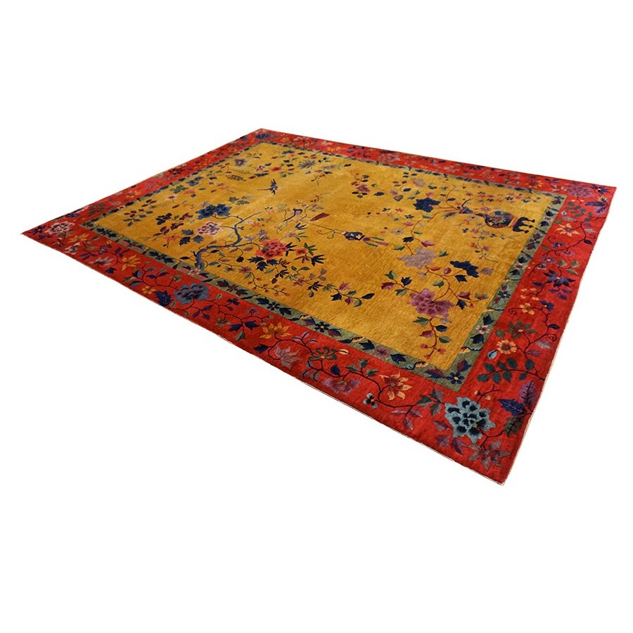 DescriptionChineseCarpets made in China proper. See entries Ningshia, Peking, Art Deco. Chinese - Art DecoAs the name implies, pieces woven between the wars for the Western market by mostly American owned firms especially Nichols and Fette, in thick heavy weaves using strong colors, asymmetric patterns and downplaying the Chinese-ness of the carpet. Nichols rugs are more strong toned than the pastel Fette. Most were woven in the coastal port city of Tientsin. Other lesser known workshops were also active. Some pieces are ultra-geometric and haute-Deco moderne in character: these are very rare. More frequent are pieces with bits of Chinese ornament: vases or other precious objects, paeonies, vines, fences, etc. Most common is the 9 x 12 size, in colors never found in mainstream Chinese rugs: backgrounds in black, mauve, purple, hot pink, orange, olive, employing the best synthetic chrome dyes of the period. Prices are still reasonable and carpets in top condition are available. | |