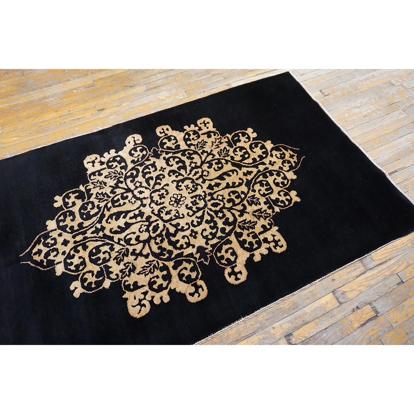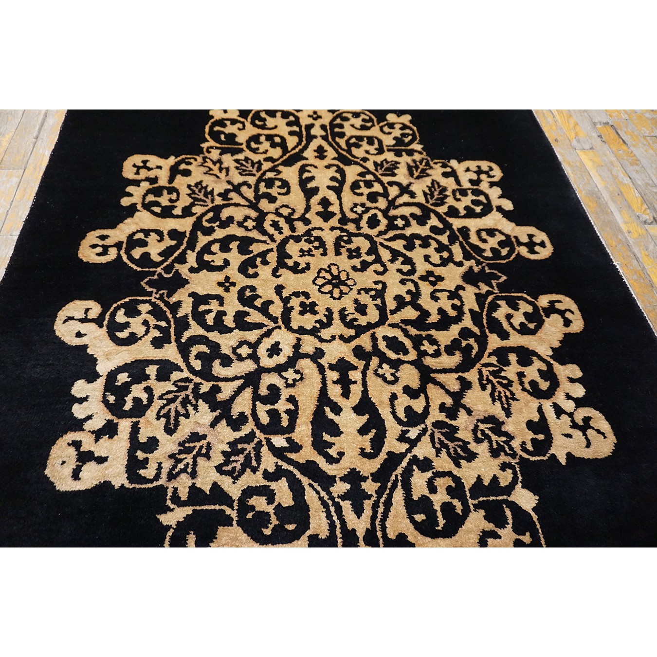 DescriptionChineseCarpets made in China proper. See entries Ningshia, Peking, Art Deco. Chinese - Art DecoAs the name implies, pieces woven between the wars for the Western market by mostly American owned firms especially Nichols and Fette, in thick heavy weaves using strong colors, asymmetric patterns and downplaying the Chinese-ness of the carpet. Nichols rugs are more strong toned than the pastel Fette. Most were woven in the coastal port city of Tientsin. Other lesser known workshops were also active. Some pieces are ultra-geometric and haute-Deco moderne in character: these are very rare. More frequent are pieces with bits of Chinese ornament: vases or other precious objects, paeonies, vines, fences, etc. Most common is the 9 x 12 size, in colors never found in mainstream Chinese rugs: backgrounds in black, mauve, purple, hot pink, orange, olive, employing the best synthetic chrome dyes of the period. Prices are still reasonable and carpets in top condition are available. | |