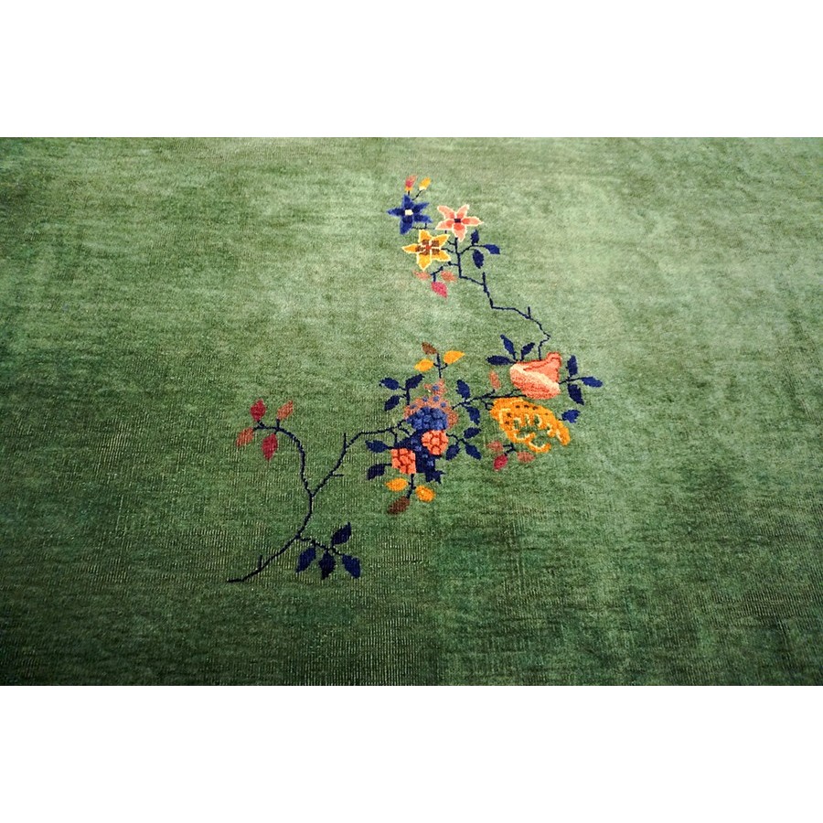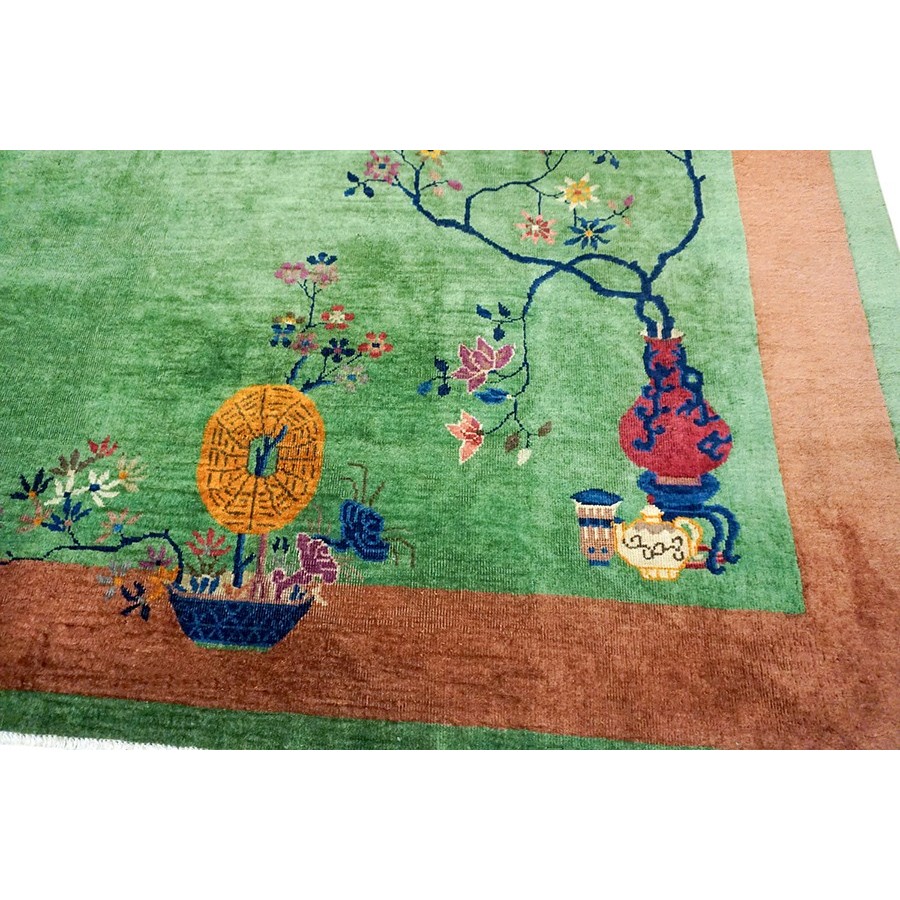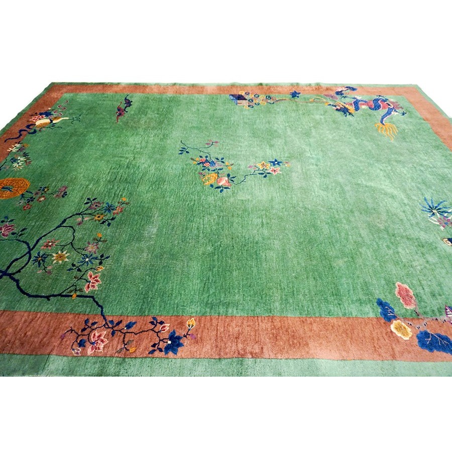 DescriptionChineseCarpets made in China proper. See entries Ningshia, Peking, Art Deco. Chinese - Art DecoAs the name implies, pieces woven between the wars for the Western market by mostly American owned firms especially Nichols and Fette, in thick heavy weaves using strong colors, asymmetric patterns and downplaying the Chinese-ness of the carpet. Nichols rugs are more strong toned than the pastel Fette. Most were woven in the coastal port city of Tientsin. Other lesser known workshops were also active. Some pieces are ultra-geometric and haute-Deco moderne in character: these are very rare. More frequent are pieces with bits of Chinese ornament: vases or other precious objects, paeonies, vines, fences, etc. Most common is the 9 x 12 size, in colors never found in mainstream Chinese rugs: backgrounds in black, mauve, purple, hot pink, orange, olive, employing the best synthetic chrome dyes of the period. Prices are still reasonable and carpets in top condition are available. | |