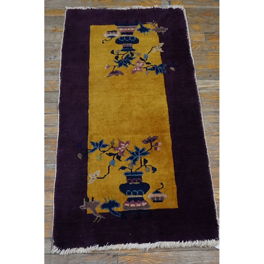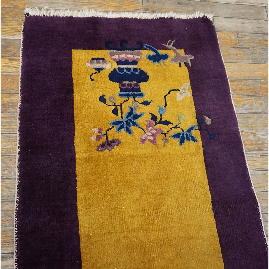 DescriptionChineseCarpets made in China proper. See entries Ningshia, Peking, Art Deco. Chinese - Art DecoAs the name implies, pieces woven between the wars for the Western market by mostly American owned firms especially Nichols and Fette, in thick heavy weaves using strong colors, asymmetric patterns and downplaying the Chinese-ness of the carpet. Nichols rugs are more strong toned than the pastel Fette. Most were woven in the coastal port city of Tientsin. Other lesser known workshops were also active. Some pieces are ultra-geometric and haute-Deco moderne in character: these are very rare. More frequent are pieces with bits of Chinese ornament: vases or other precious objects, paeonies, vines, fences, etc. Most common is the 9 x 12 size, in colors never found in mainstream Chinese rugs: backgrounds in black, mauve, purple, hot pink, orange, olive, employing the best synthetic chrome dyes of the period. Prices are still reasonable and carpets in top condition are available. | |