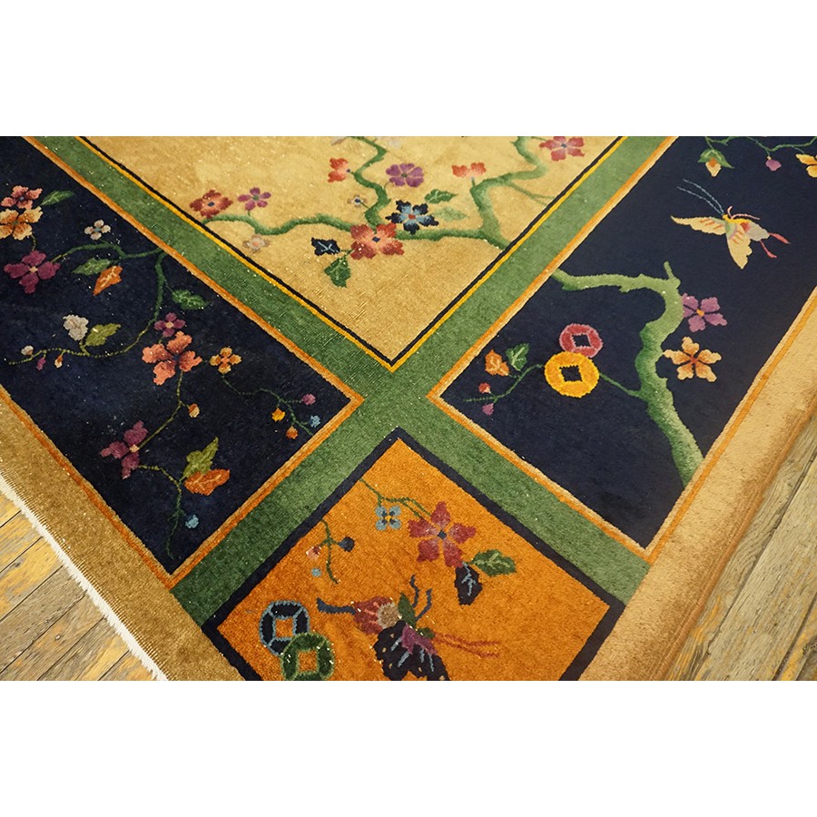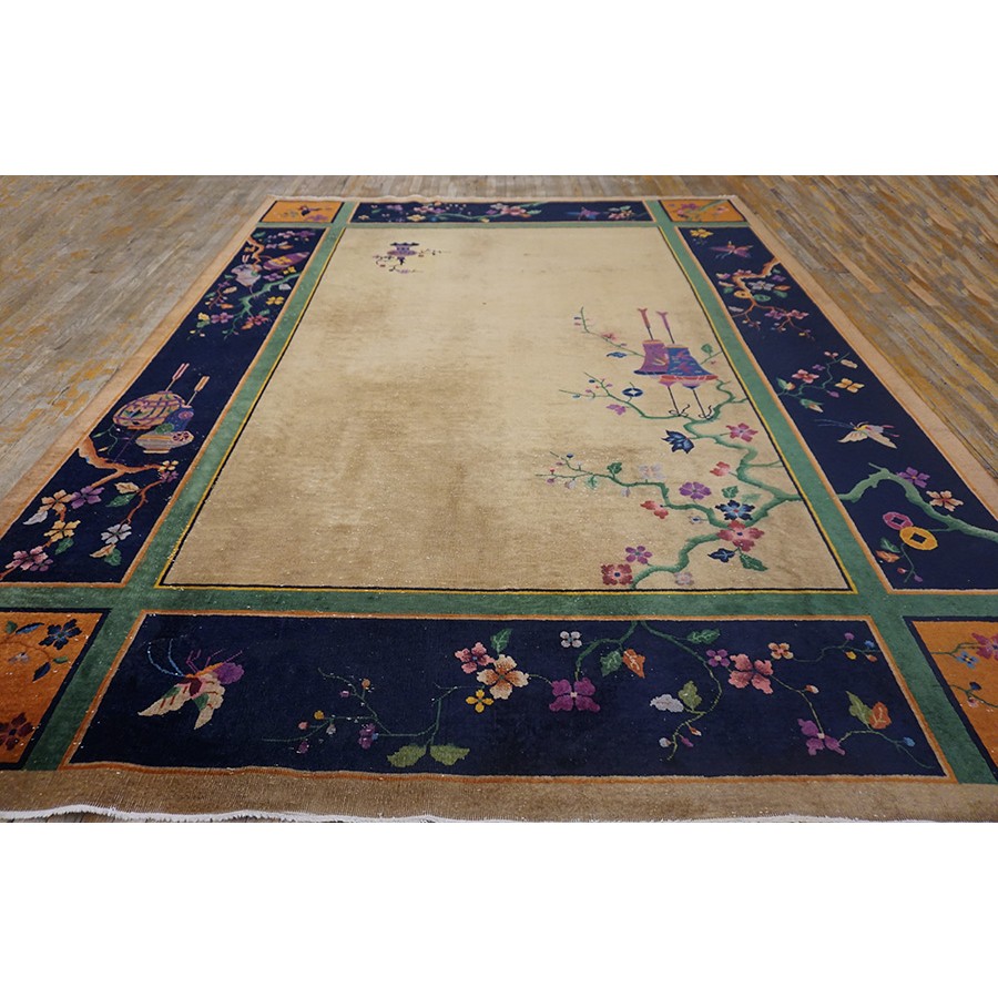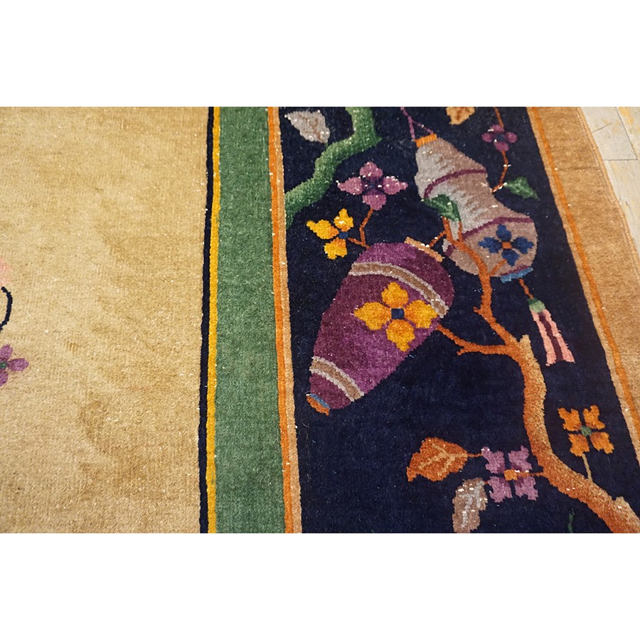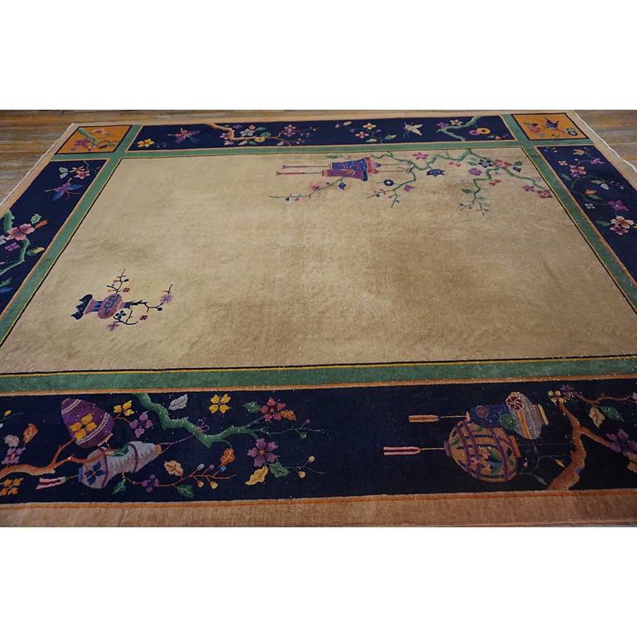 DescriptionChineseCarpets made in China proper. See entries Ningshia, Peking, Art Deco. Chinese - Art DecoAs the name implies, pieces woven between the wars for the Western market by mostly American owned firms especially Nichols and Fette, in thick heavy weaves using strong colors, asymmetric patterns and downplaying the Chinese-ness of the carpet. Nichols rugs are more strong toned than the pastel Fette. Most were woven in the coastal port city of Tientsin. Other lesser known workshops were also active. Some pieces are ultra-geometric and haute-Deco moderne in character: these are very rare. More frequent are pieces with bits of Chinese ornament: vases or other precious objects, paeonies, vines, fences, etc. Most common is the 9 x 12 size, in colors never found in mainstream Chinese rugs: backgrounds in black, mauve, purple, hot pink, orange, olive, employing the best synthetic chrome dyes of the period. Prices are still reasonable and carpets in top condition are available. | |