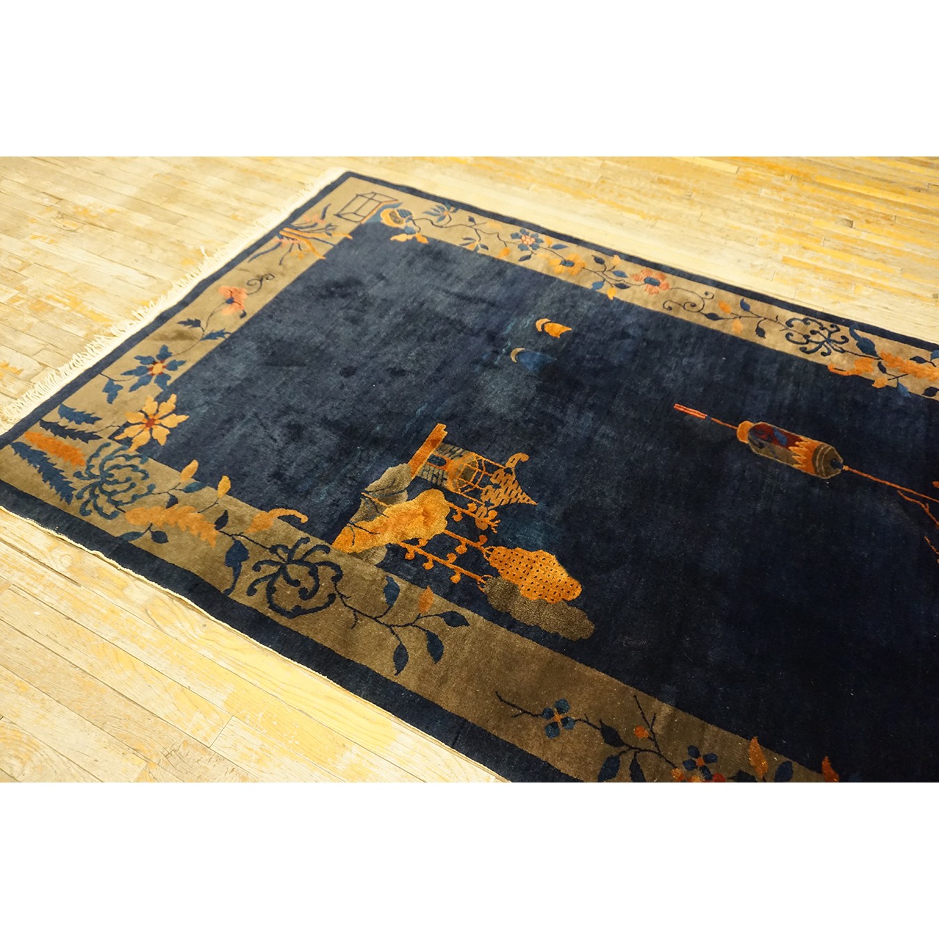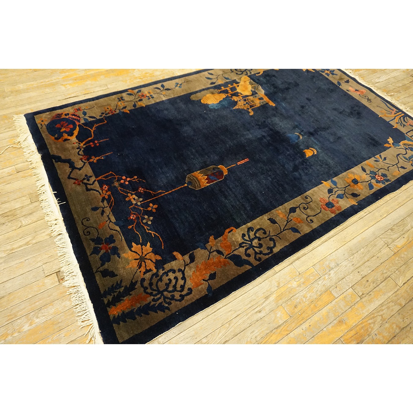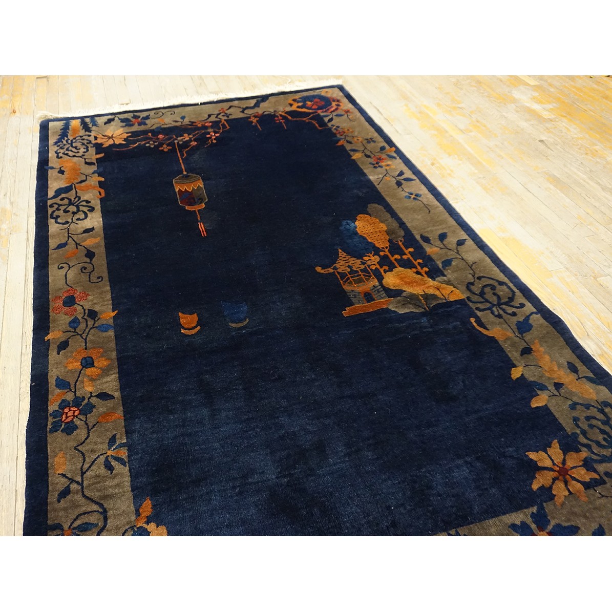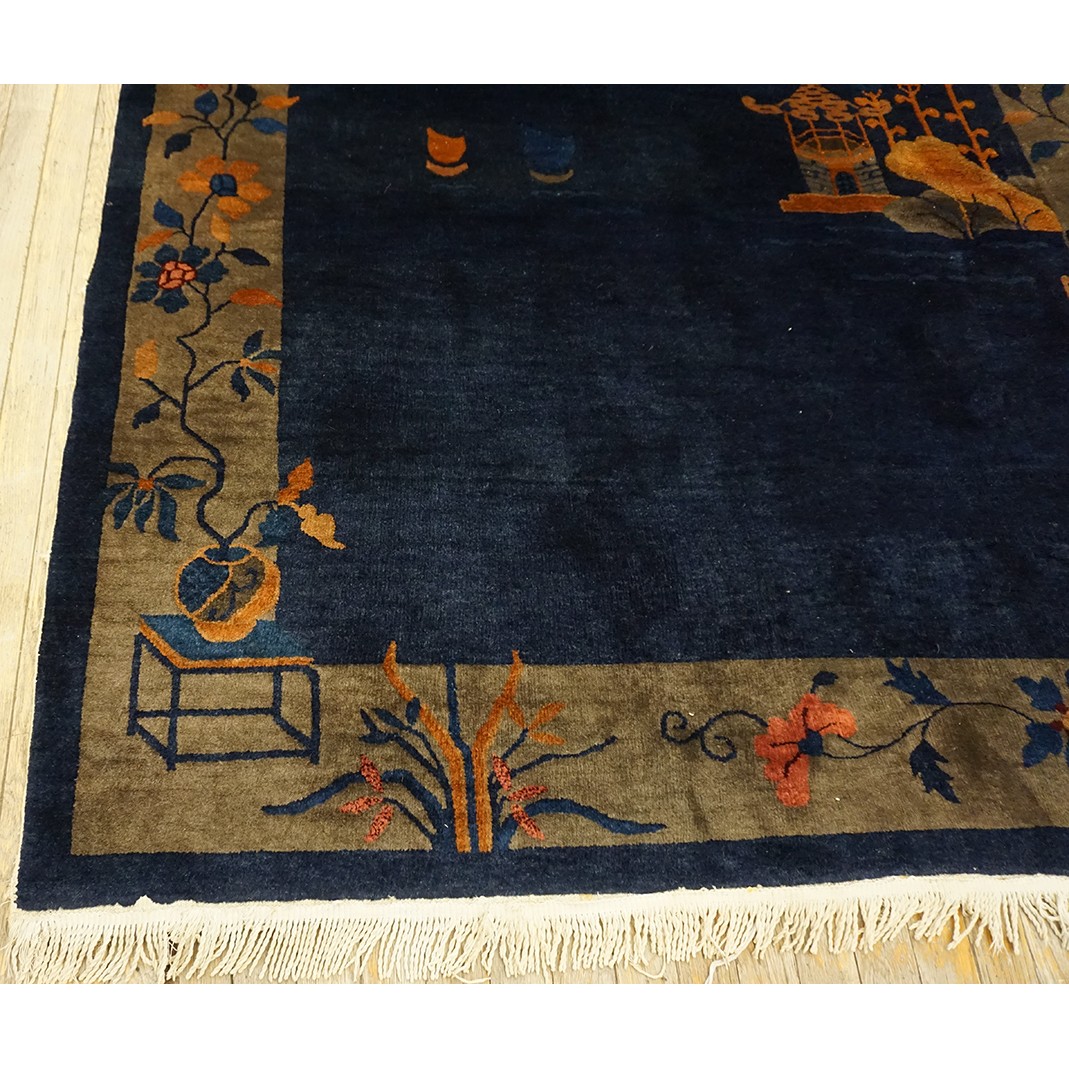 DescriptionChineseCarpets made in China proper. See entries Ningshia, Peking, Art Deco. Chinese - Art DecoAs the name implies, pieces woven between the wars for the Western market by mostly American owned firms especially Nichols and Fette, in thick heavy weaves using strong colors, asymmetric patterns and downplaying the Chinese-ness of the carpet. Nichols rugs are more strong toned than the pastel Fette. Most were woven in the coastal port city of Tientsin. Other lesser known workshops were also active. Some pieces are ultra-geometric and haute-Deco moderne in character: these are very rare. More frequent are pieces with bits of Chinese ornament: vases or other precious objects, paeonies, vines, fences, etc. Most common is the 9 x 12 size, in colors never found in mainstream Chinese rugs: backgrounds in black, mauve, purple, hot pink, orange, olive, employing the best synthetic chrome dyes of the period. Prices are still reasonable and carpets in top condition are available. | |