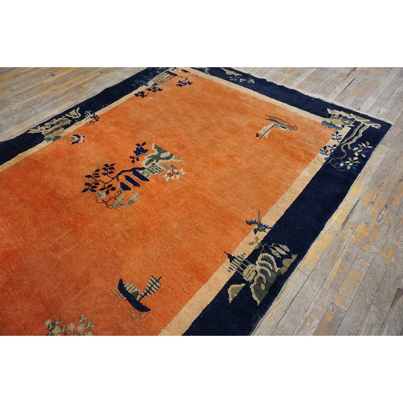 DescriptionChineseCarpets made in China proper. See entries Ningshia, Peking, Art Deco. Chinese - Art DecoAs the name implies, pieces woven between the wars for the Western market by mostly American owned firms especially Nichols and Fette, in thick heavy weaves using strong colors, asymmetric patterns and downplaying the Chinese-ness of the carpet. Nichols rugs are more strong toned than the pastel Fette. Most were woven in the coastal port city of Tientsin. Other lesser known workshops were also active. Some pieces are ultra-geometric and haute-Deco moderne in character: these are very rare. More frequent are pieces with bits of Chinese ornament: vases or other precious objects, paeonies, vines, fences, etc. Most common is the 9 x 12 size, in colors never found in mainstream Chinese rugs: backgrounds in black, mauve, purple, hot pink, orange, olive, employing the best synthetic chrome dyes of the period. Prices are still reasonable and carpets in top condition are available. | |