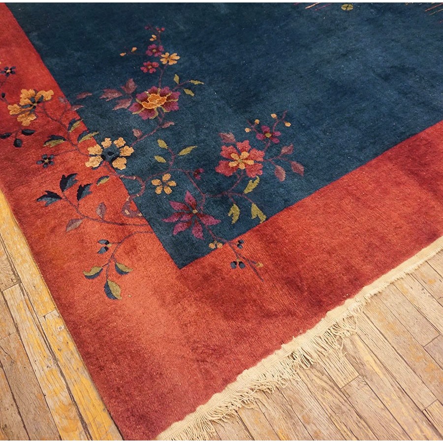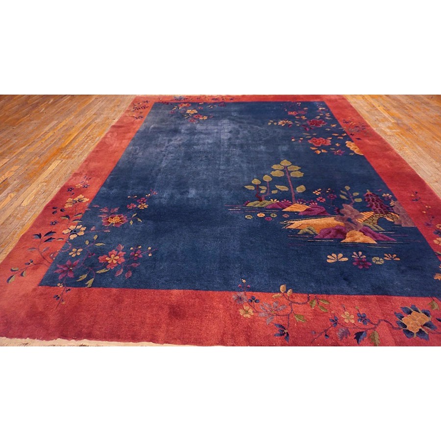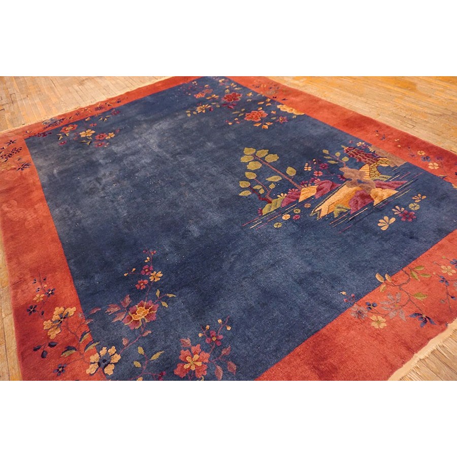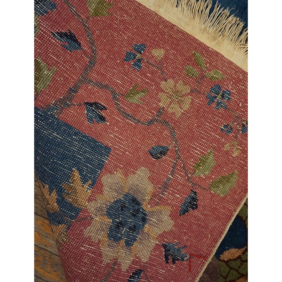 DescriptionChineseCarpets made in China proper. See entries Ningshia, Peking, Art Deco. Chinese - Art DecoAs the name implies, pieces woven between the wars for the Western market by mostly American owned firms especially Nichols and Fette, in thick heavy weaves using strong colors, asymmetric patterns and downplaying the Chinese-ness of the carpet. Nichols rugs are more strong toned than the pastel Fette. Most were woven in the coastal port city of Tientsin. Other lesser known workshops were also active. Some pieces are ultra-geometric and haute-Deco moderne in character: these are very rare. More frequent are pieces with bits of Chinese ornament: vases or other precious objects, paeonies, vines, fences, etc. Most common is the 9 x 12 size, in colors never found in mainstream Chinese rugs: backgrounds in black, mauve, purple, hot pink, orange, olive, employing the best synthetic chrome dyes of the period. Prices are still reasonable and carpets in top condition are available. | |