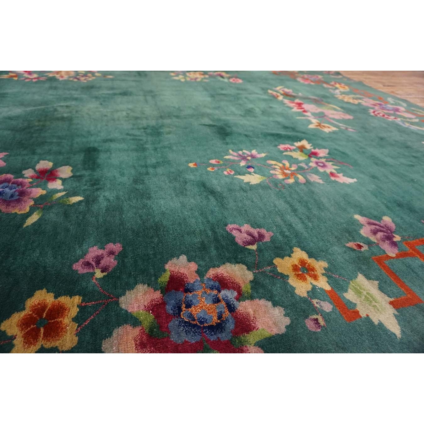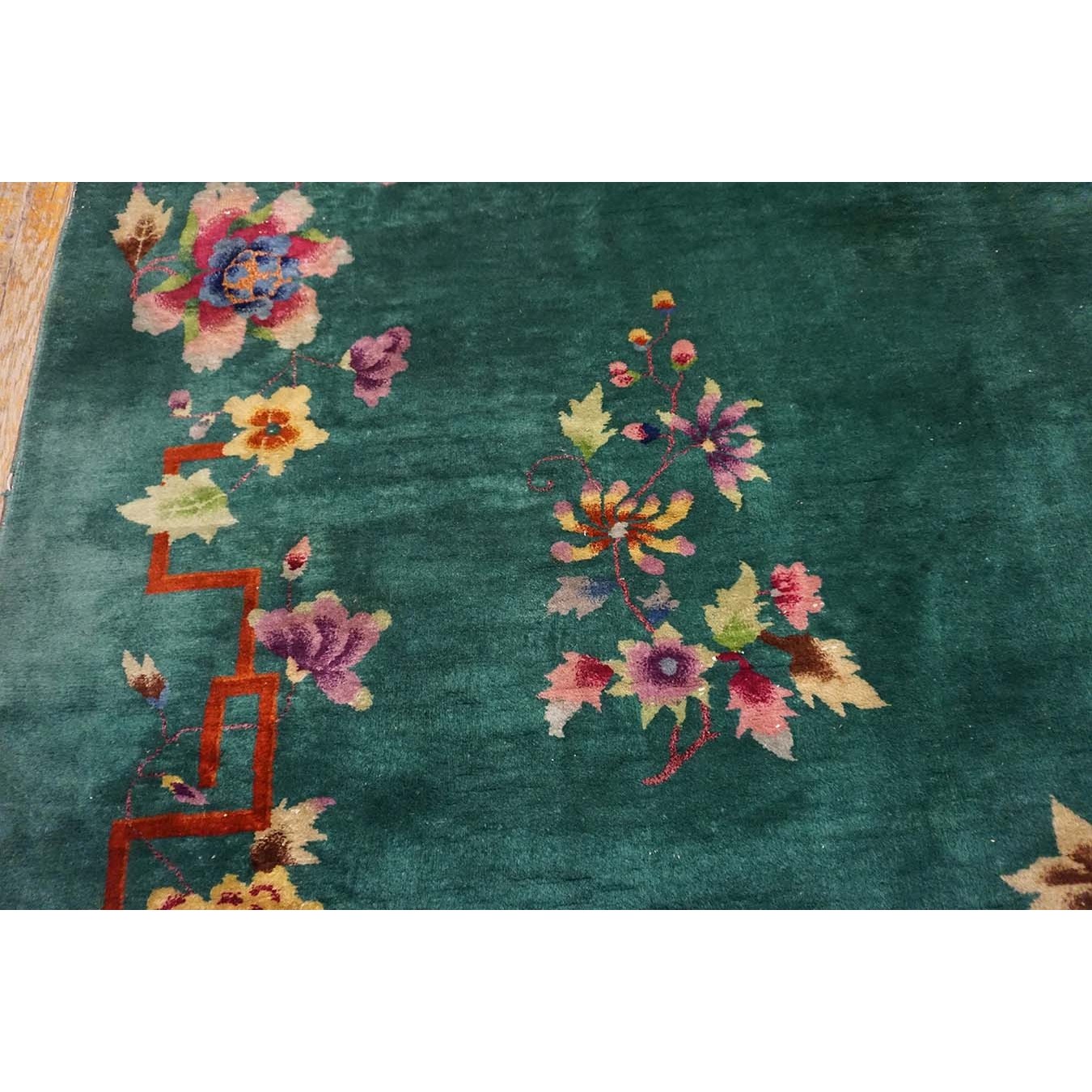 DescriptionChineseCarpets made in China proper. See entries Ningshia, Peking, Art Deco. Chinese - Art DecoAs the name implies, pieces woven between the wars for the Western market by mostly American owned firms especially Nichols and Fette, in thick heavy weaves using strong colors, asymmetric patterns and downplaying the Chinese-ness of the carpet. Nichols rugs are more strong toned than the pastel Fette. Most were woven in the coastal port city of Tientsin. Other lesser known workshops were also active. Some pieces are ultra-geometric and haute-Deco moderne in character: these are very rare. More frequent are pieces with bits of Chinese ornament: vases or other precious objects, paeonies, vines, fences, etc. Most common is the 9 x 12 size, in colors never found in mainstream Chinese rugs: backgrounds in black, mauve, purple, hot pink, orange, olive, employing the best synthetic chrome dyes of the period. Prices are still reasonable and carpets in top condition are available. | |