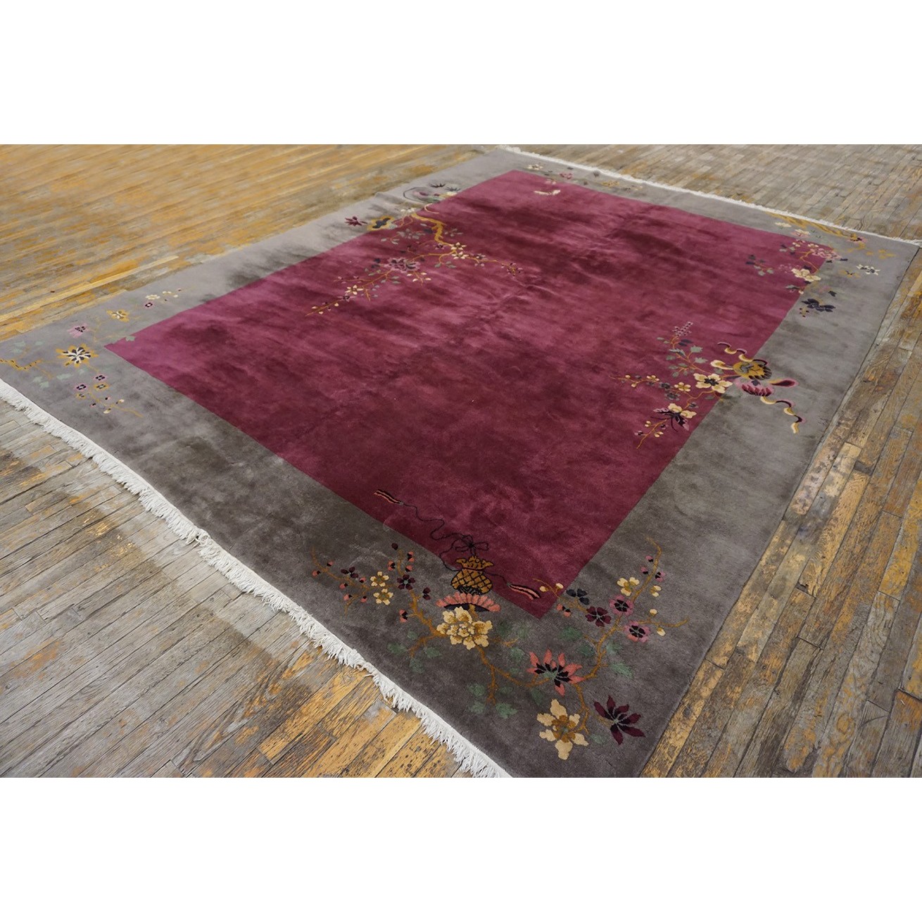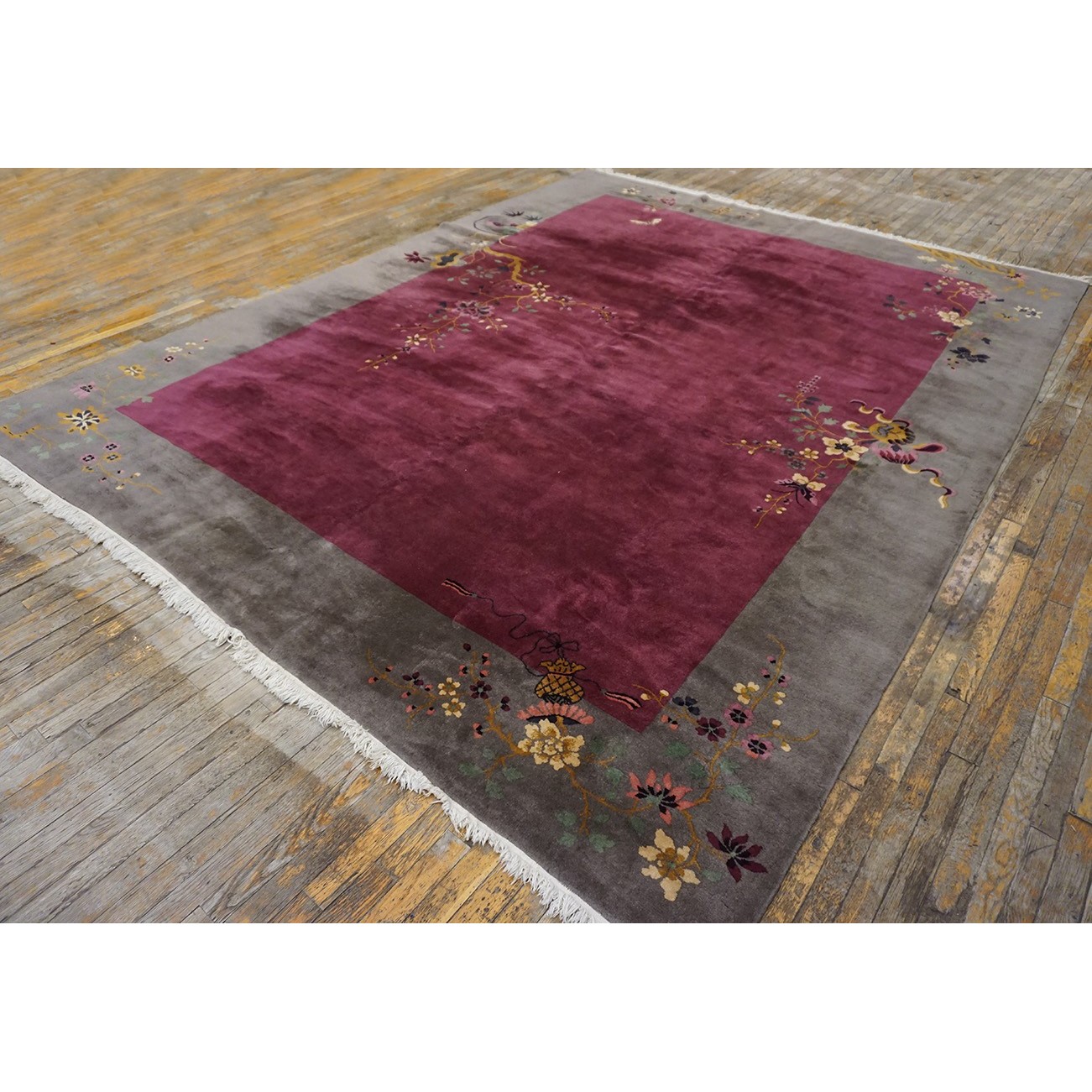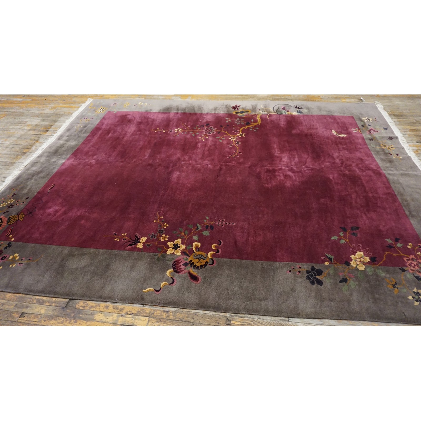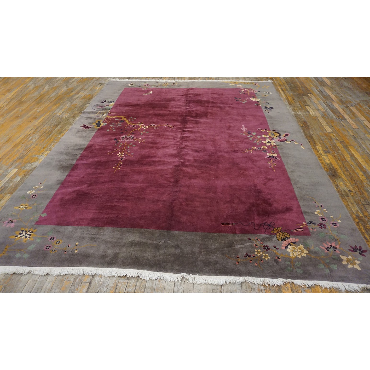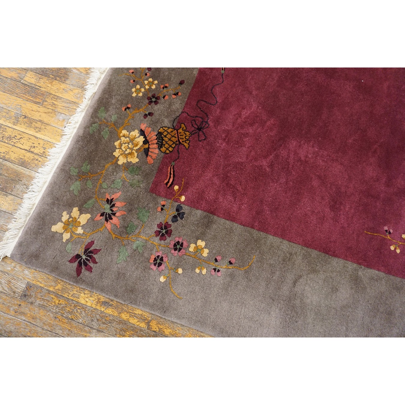 DescriptionChineseCarpets made in China proper. See entries Ningshia, Peking, Art Deco. Chinese - Art DecoAs the name implies, pieces woven between the wars for the Western market by mostly American owned firms especially Nichols and Fette, in thick heavy weaves using strong colors, asymmetric patterns and downplaying the Chinese-ness of the carpet. Nichols rugs are more strong toned than the pastel Fette. Most were woven in the coastal port city of Tientsin. Other lesser known workshops were also active. Some pieces are ultra-geometric and haute-Deco moderne in character: these are very rare. More frequent are pieces with bits of Chinese ornament: vases or other precious objects, paeonies, vines, fences, etc. Most common is the 9 x 12 size, in colors never found in mainstream Chinese rugs: backgrounds in black, mauve, purple, hot pink, orange, olive, employing the best synthetic chrome dyes of the period. Prices are still reasonable and carpets in top condition are available. | |