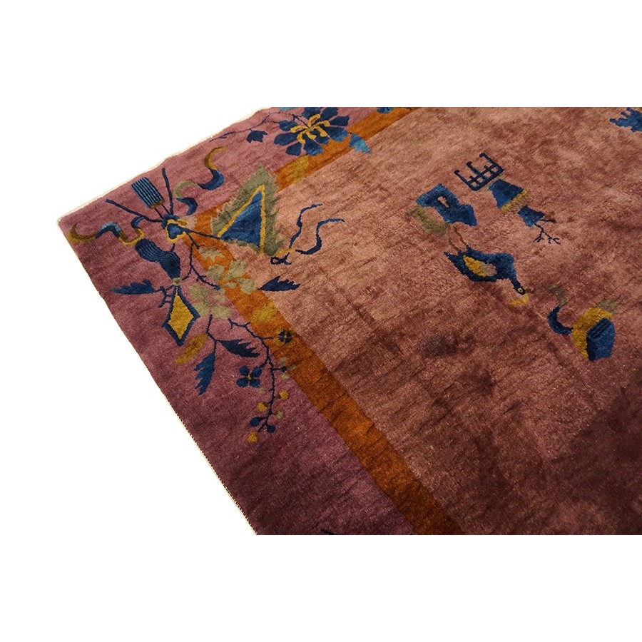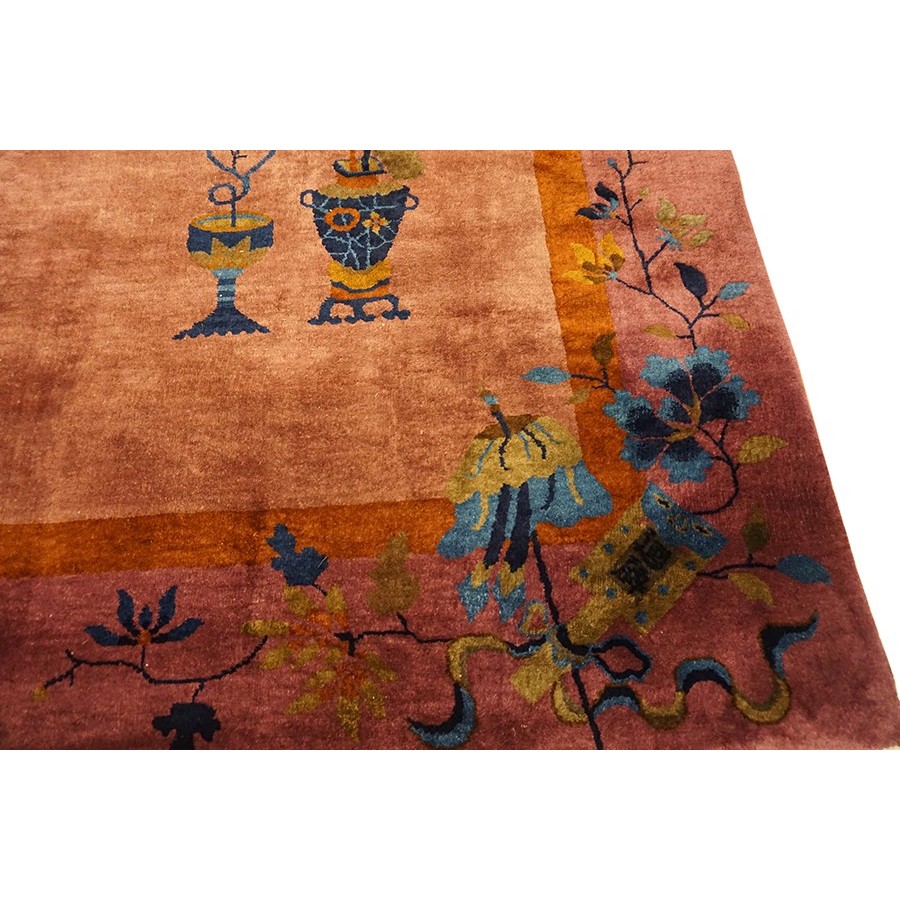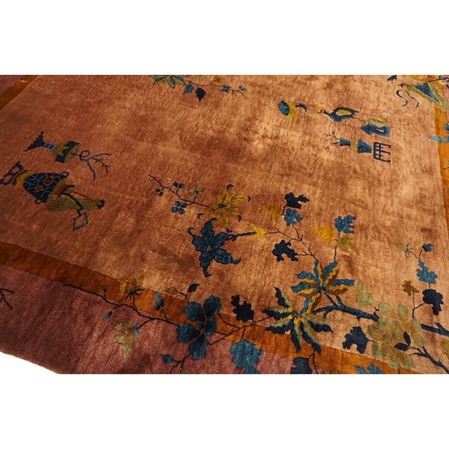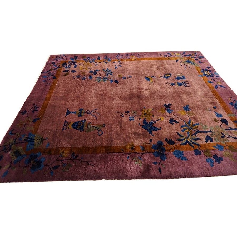 DescriptionChineseCarpets made in China proper. See entries Ningshia, Peking, Art Deco. Chinese - Art DecoAs the name implies, pieces woven between the wars for the Western market by mostly American owned firms especially Nichols and Fette, in thick heavy weaves using strong colors, asymmetric patterns and downplaying the Chinese-ness of the carpet. Nichols rugs are more strong toned than the pastel Fette. Most were woven in the coastal port city of Tientsin. Other lesser known workshops were also active. Some pieces are ultra-geometric and haute-Deco moderne in character: these are very rare. More frequent are pieces with bits of Chinese ornament: vases or other precious objects, paeonies, vines, fences, etc. Most common is the 9 x 12 size, in colors never found in mainstream Chinese rugs: backgrounds in black, mauve, purple, hot pink, orange, olive, employing the best synthetic chrome dyes of the period. Prices are still reasonable and carpets in top condition are available. | |