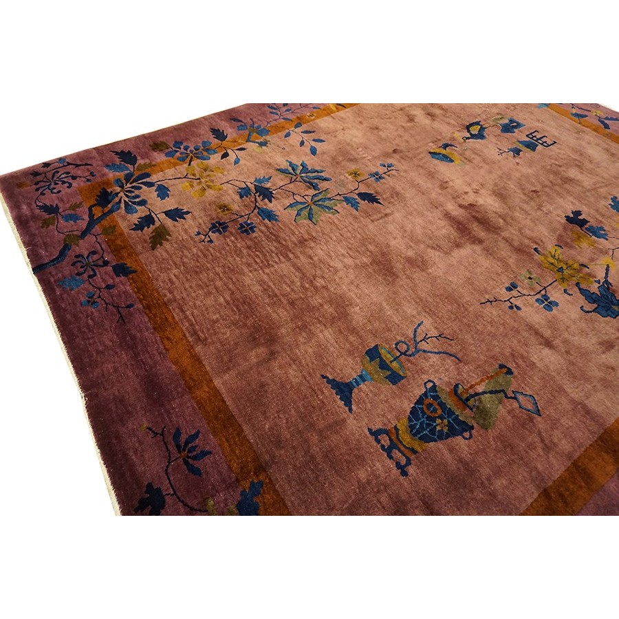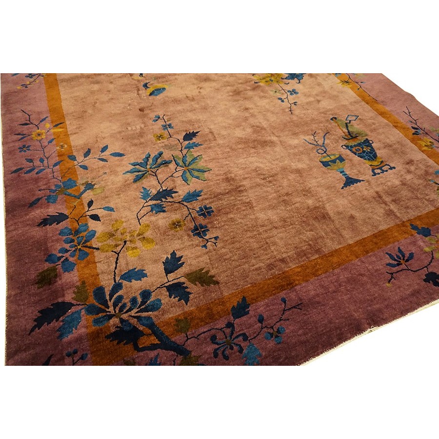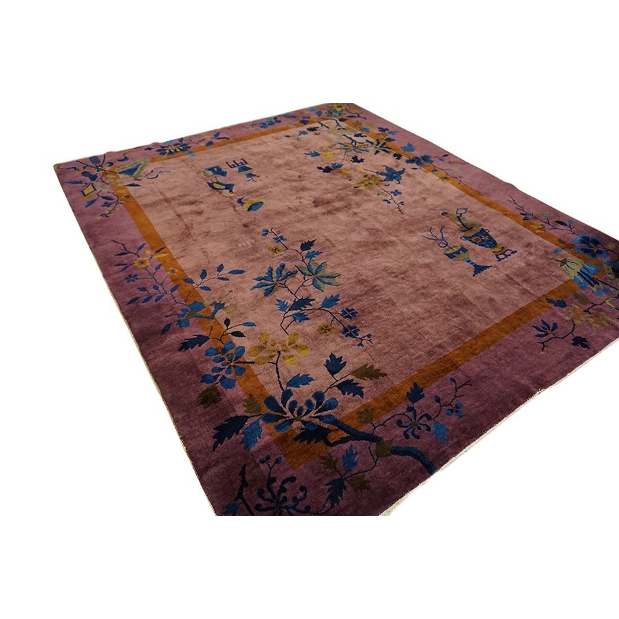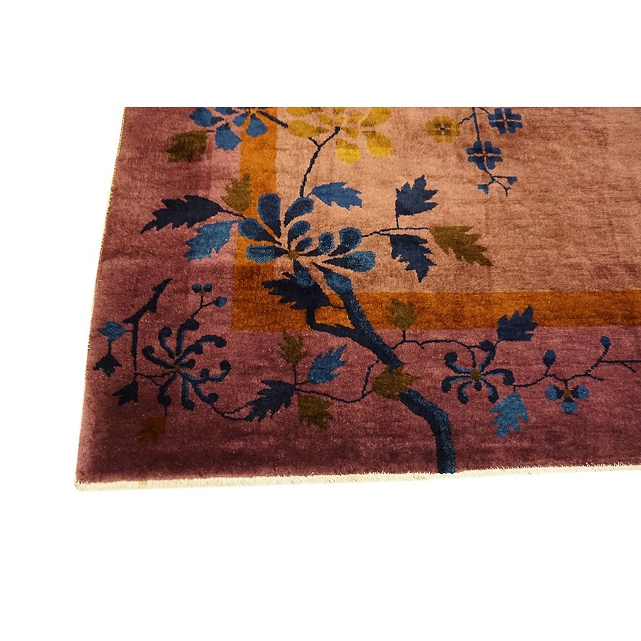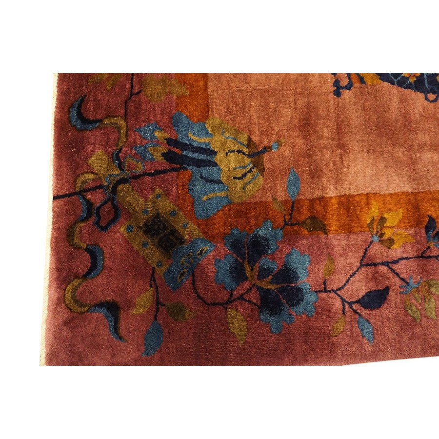 DescriptionChineseCarpets made in China proper. See entries Ningshia, Peking, Art Deco. Chinese - Art DecoAs the name implies, pieces woven between the wars for the Western market by mostly American owned firms especially Nichols and Fette, in thick heavy weaves using strong colors, asymmetric patterns and downplaying the Chinese-ness of the carpet. Nichols rugs are more strong toned than the pastel Fette. Most were woven in the coastal port city of Tientsin. Other lesser known workshops were also active. Some pieces are ultra-geometric and haute-Deco moderne in character: these are very rare. More frequent are pieces with bits of Chinese ornament: vases or other precious objects, paeonies, vines, fences, etc. Most common is the 9 x 12 size, in colors never found in mainstream Chinese rugs: backgrounds in black, mauve, purple, hot pink, orange, olive, employing the best synthetic chrome dyes of the period. Prices are still reasonable and carpets in top condition are available. | |
