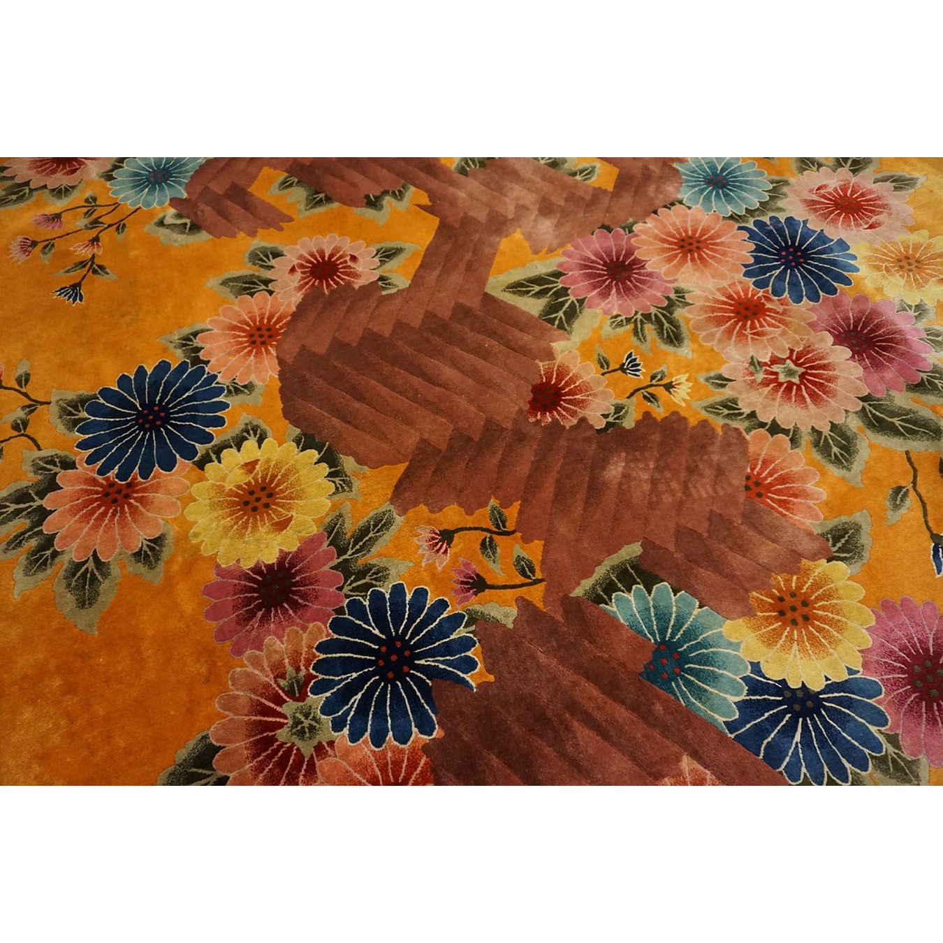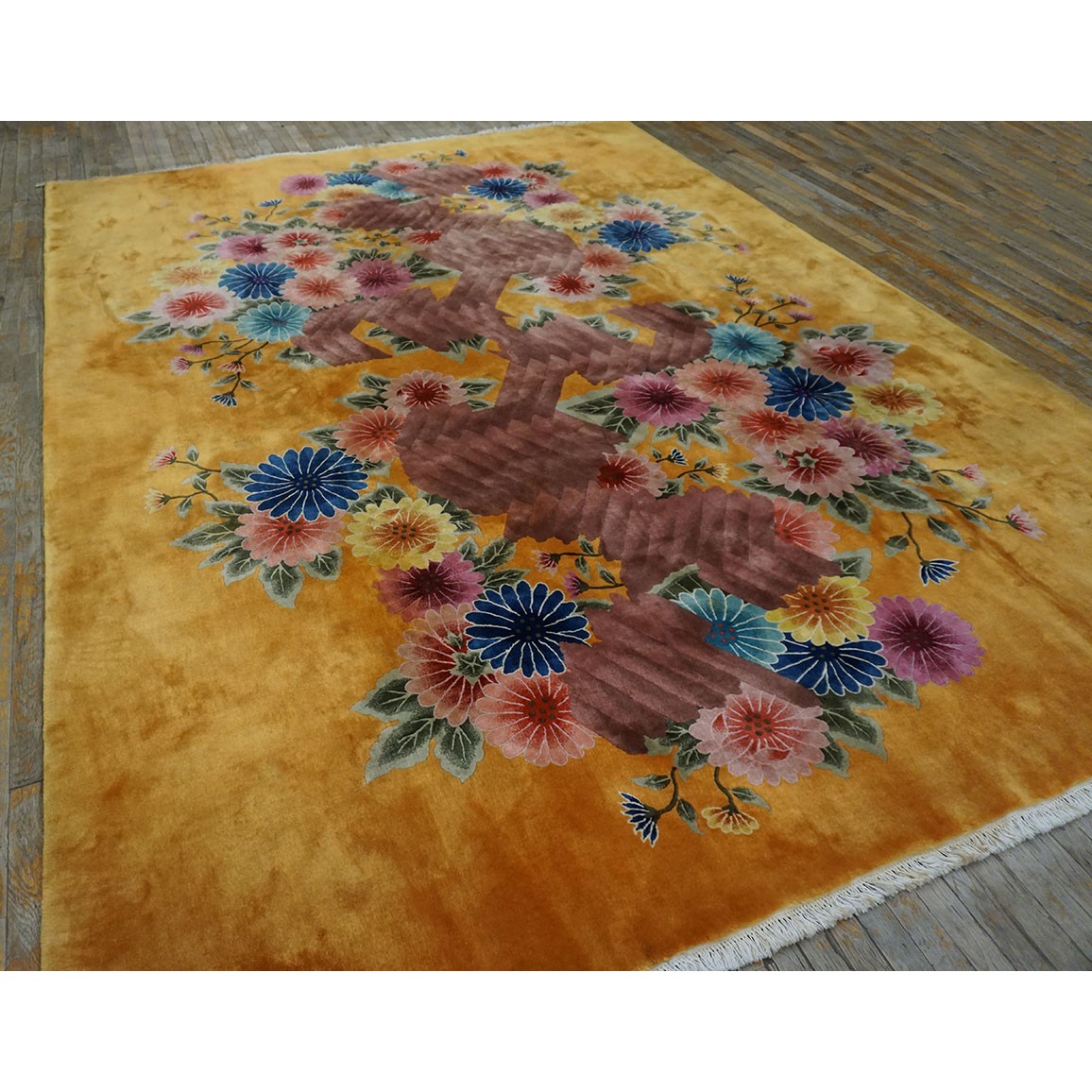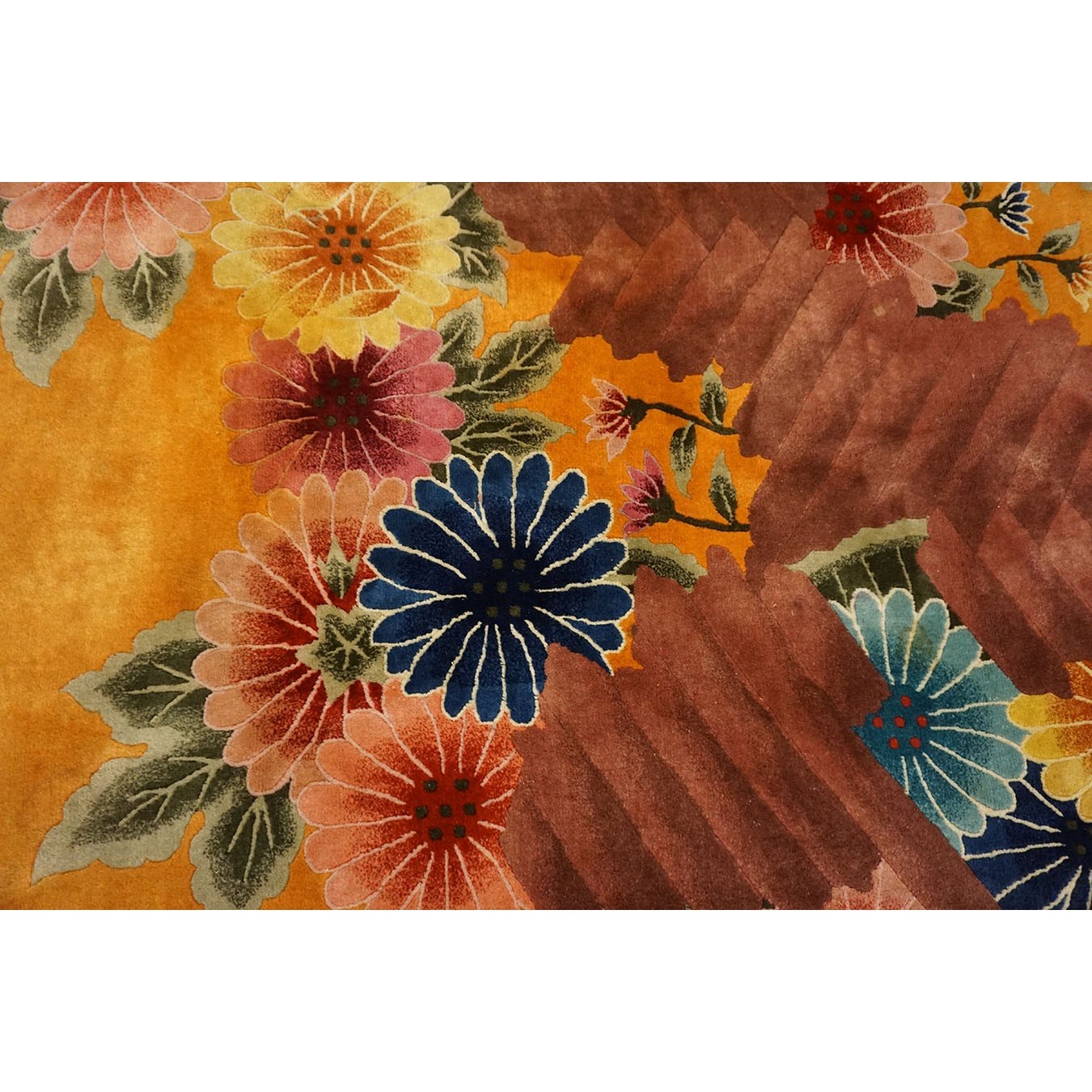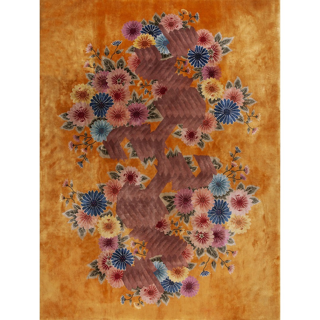DescriptionChineseCarpets made in China proper. See entries Ningshia, Peking, Art Deco. Chinese - Art DecoAs the name implies, pieces woven between the wars for the Western market by mostly American owned firms especially Nichols and Fette, in thick heavy weaves using strong colors, asymmetric patterns and downplaying the Chinese-ness of the carpet. Nichols rugs are more strong toned than the pastel Fette. Most were woven in the coastal port city of Tientsin. Other lesser known workshops were also active. Some pieces are ultra-geometric and haute-Deco moderne in character: these are very rare. More frequent are pieces with bits of Chinese ornament: vases or other precious objects, paeonies, vines, fences, etc. Most common is the 9 x 12 size, in colors never found in mainstream Chinese rugs: backgrounds in black, mauve, purple, hot pink, orange, olive, employing the best synthetic chrome dyes of the period. Prices are still reasonable and carpets in top condition are available. | |