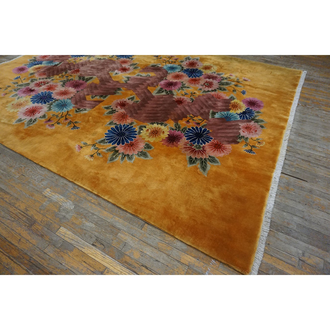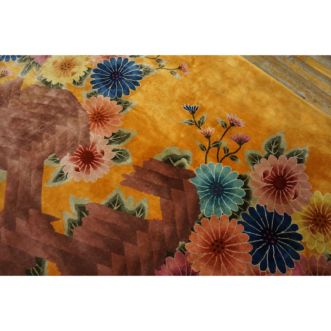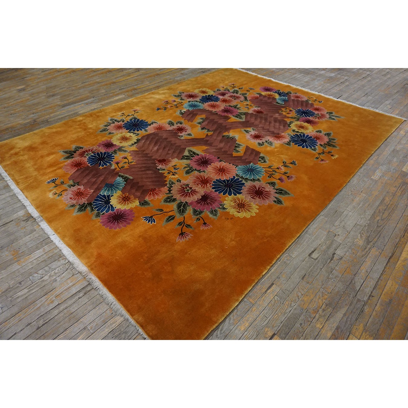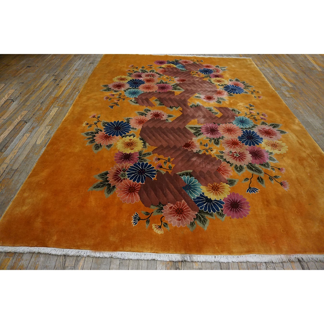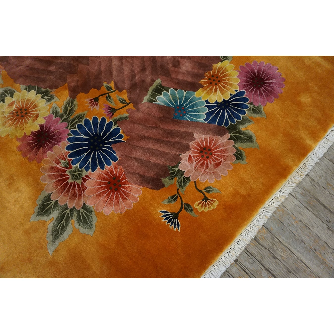 DescriptionChineseCarpets made in China proper. See entries Ningshia, Peking, Art Deco. Chinese - Art DecoAs the name implies, pieces woven between the wars for the Western market by mostly American owned firms especially Nichols and Fette, in thick heavy weaves using strong colors, asymmetric patterns and downplaying the Chinese-ness of the carpet. Nichols rugs are more strong toned than the pastel Fette. Most were woven in the coastal port city of Tientsin. Other lesser known workshops were also active. Some pieces are ultra-geometric and haute-Deco moderne in character: these are very rare. More frequent are pieces with bits of Chinese ornament: vases or other precious objects, paeonies, vines, fences, etc. Most common is the 9 x 12 size, in colors never found in mainstream Chinese rugs: backgrounds in black, mauve, purple, hot pink, orange, olive, employing the best synthetic chrome dyes of the period. Prices are still reasonable and carpets in top condition are available. | |
