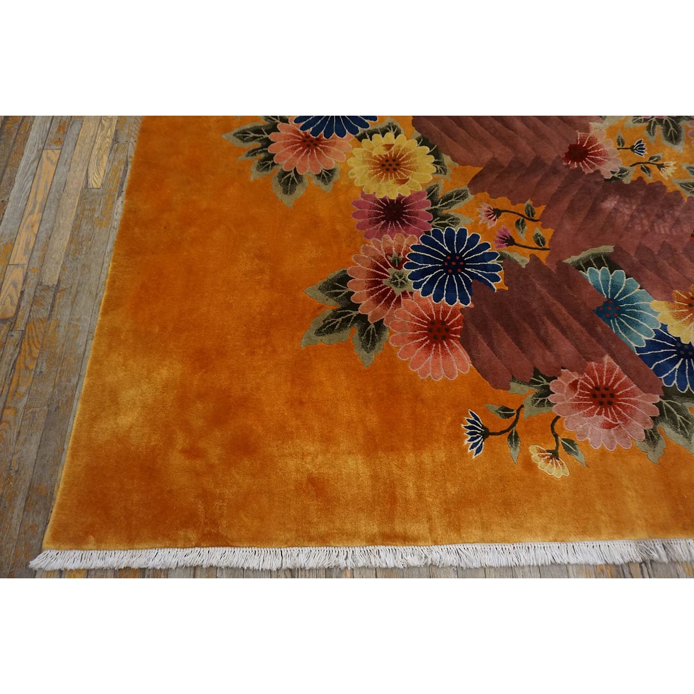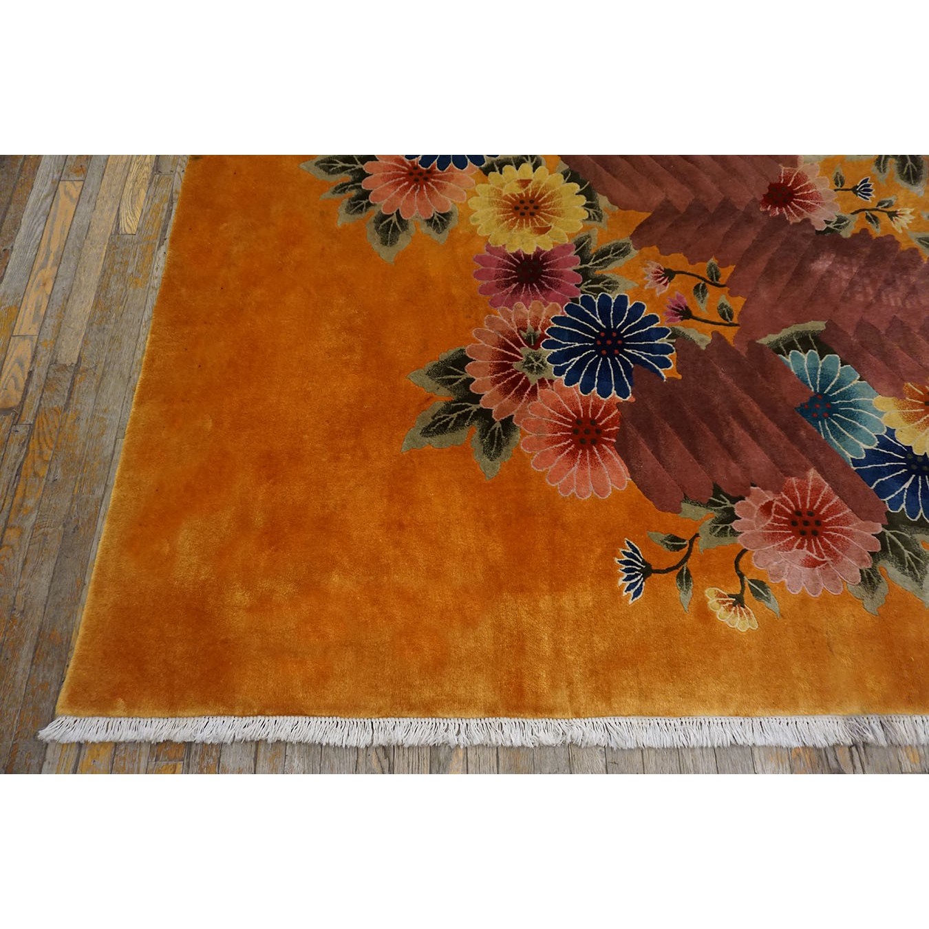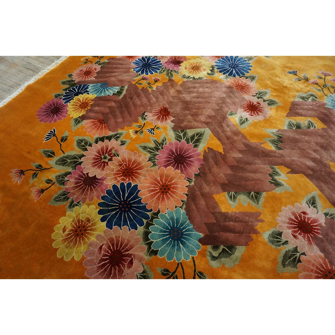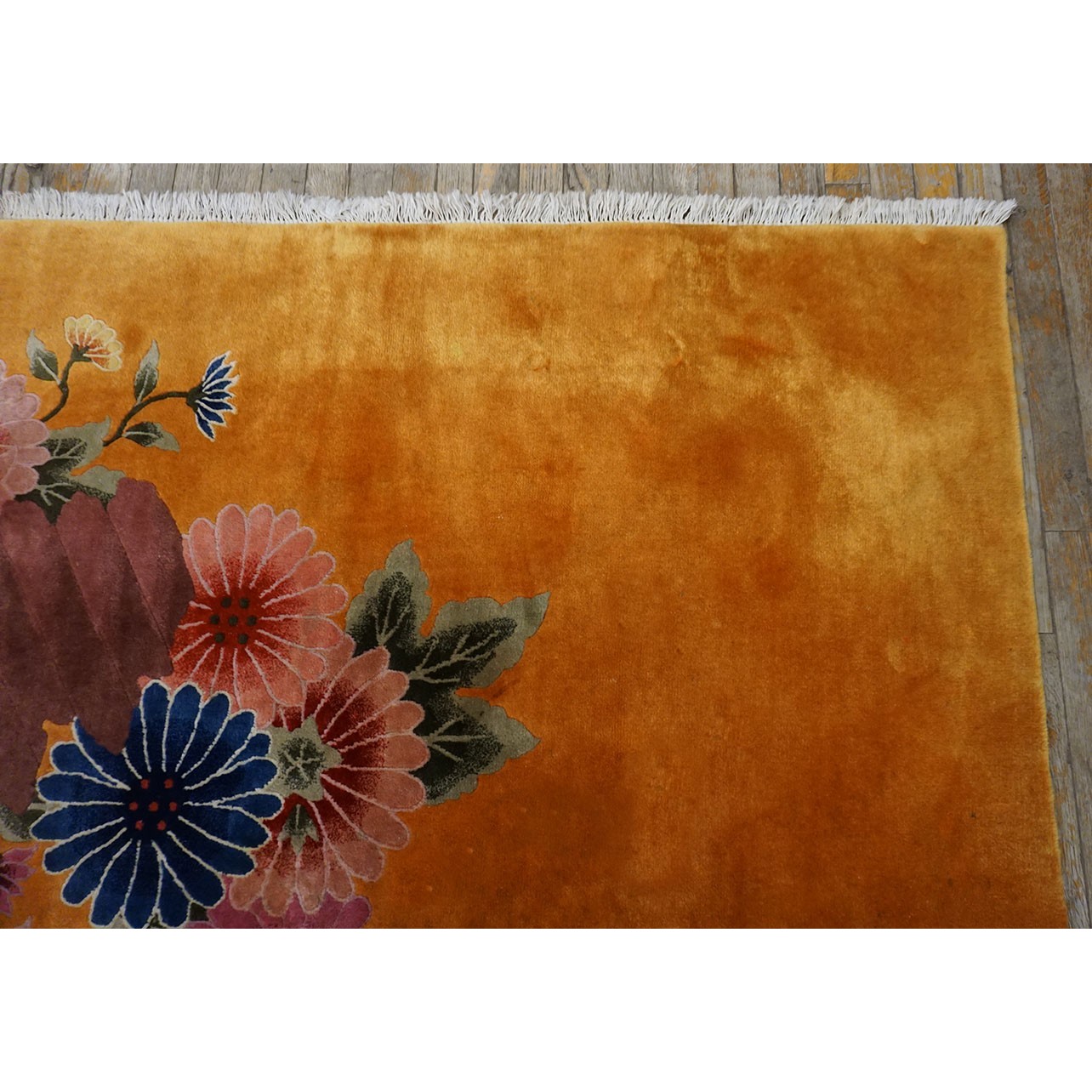 DescriptionChineseCarpets made in China proper. See entries Ningshia, Peking, Art Deco. Chinese - Art DecoAs the name implies, pieces woven between the wars for the Western market by mostly American owned firms especially Nichols and Fette, in thick heavy weaves using strong colors, asymmetric patterns and downplaying the Chinese-ness of the carpet. Nichols rugs are more strong toned than the pastel Fette. Most were woven in the coastal port city of Tientsin. Other lesser known workshops were also active. Some pieces are ultra-geometric and haute-Deco moderne in character: these are very rare. More frequent are pieces with bits of Chinese ornament: vases or other precious objects, paeonies, vines, fences, etc. Most common is the 9 x 12 size, in colors never found in mainstream Chinese rugs: backgrounds in black, mauve, purple, hot pink, orange, olive, employing the best synthetic chrome dyes of the period. Prices are still reasonable and carpets in top condition are available. | |
