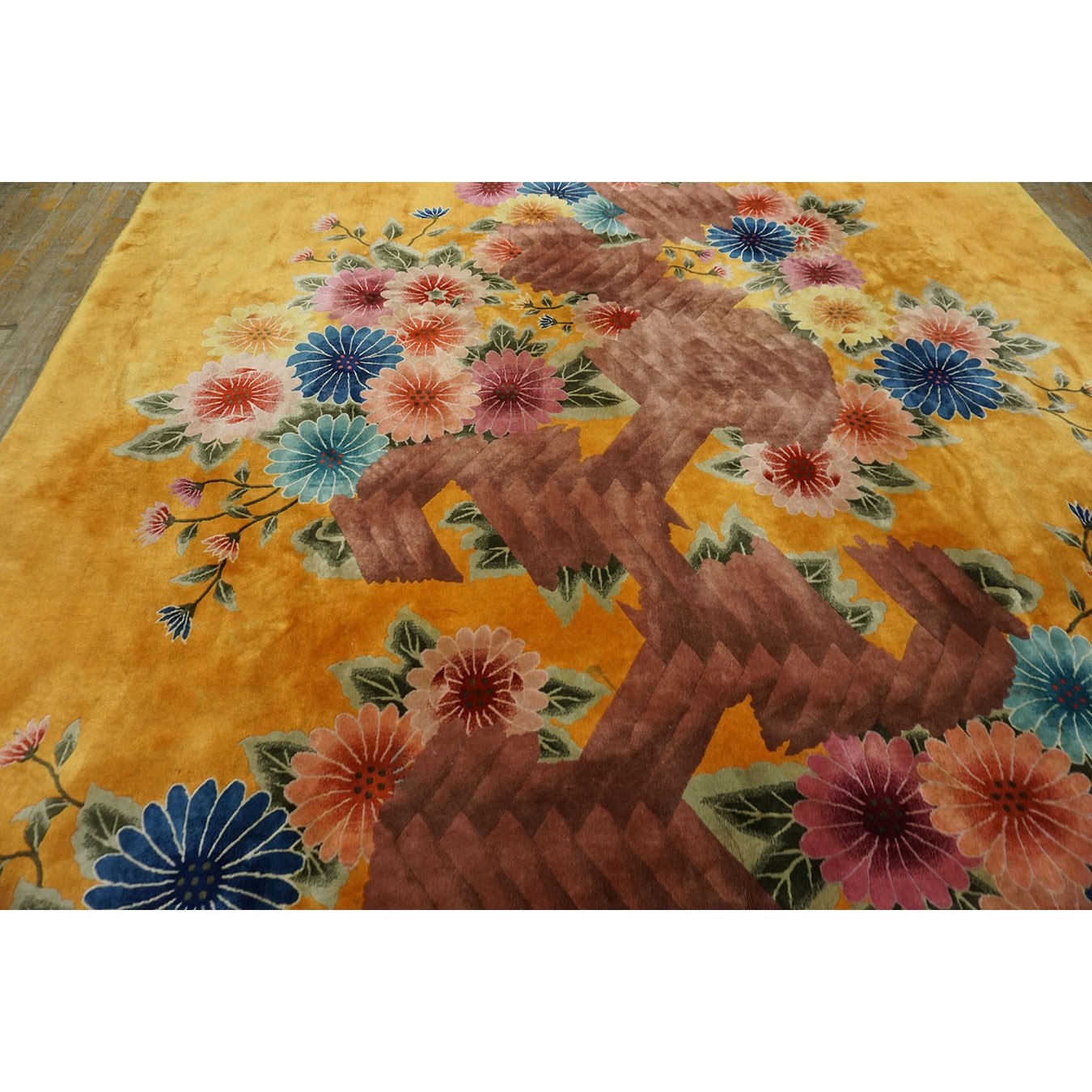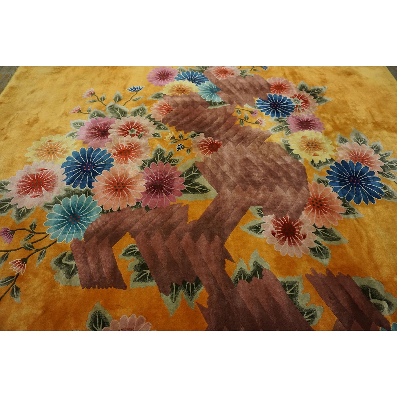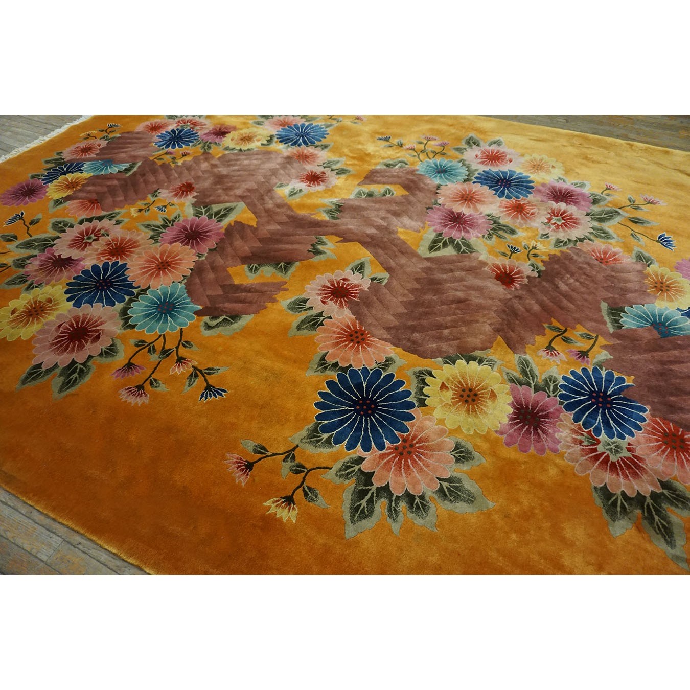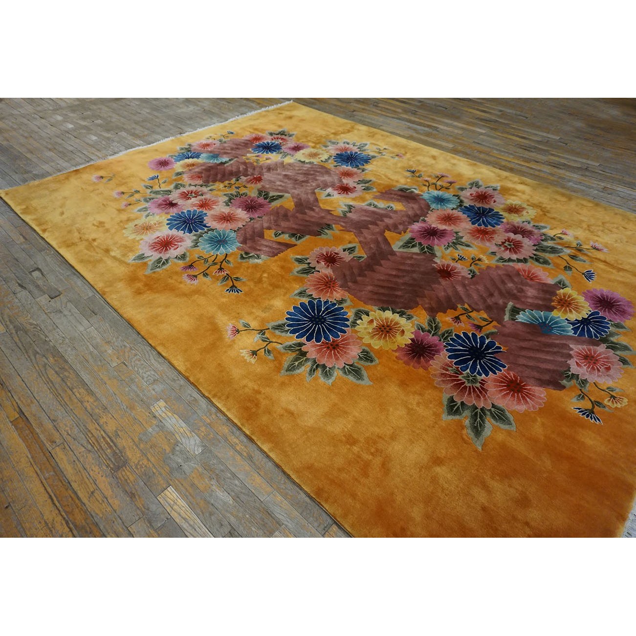 DescriptionChineseCarpets made in China proper. See entries Ningshia, Peking, Art Deco. Chinese - Art DecoAs the name implies, pieces woven between the wars for the Western market by mostly American owned firms especially Nichols and Fette, in thick heavy weaves using strong colors, asymmetric patterns and downplaying the Chinese-ness of the carpet. Nichols rugs are more strong toned than the pastel Fette. Most were woven in the coastal port city of Tientsin. Other lesser known workshops were also active. Some pieces are ultra-geometric and haute-Deco moderne in character: these are very rare. More frequent are pieces with bits of Chinese ornament: vases or other precious objects, paeonies, vines, fences, etc. Most common is the 9 x 12 size, in colors never found in mainstream Chinese rugs: backgrounds in black, mauve, purple, hot pink, orange, olive, employing the best synthetic chrome dyes of the period. Prices are still reasonable and carpets in top condition are available. | |