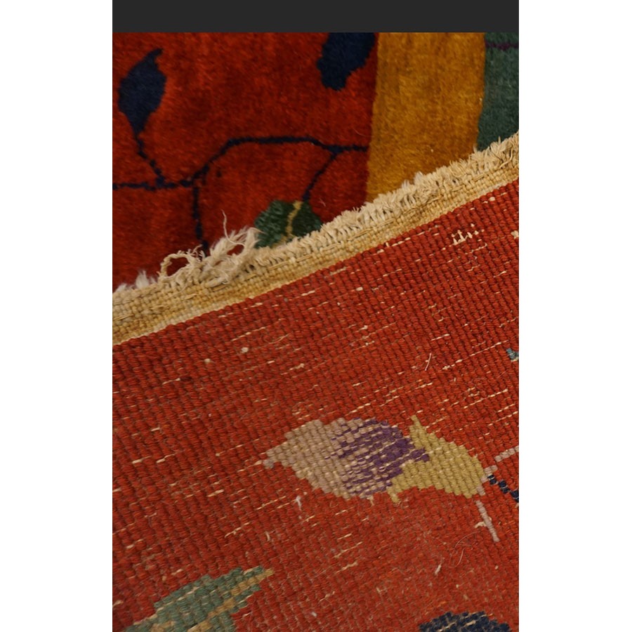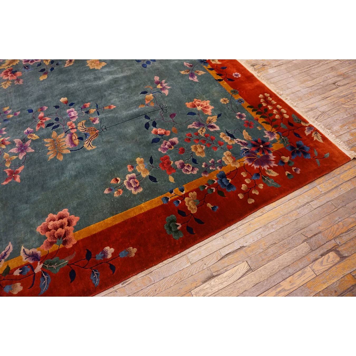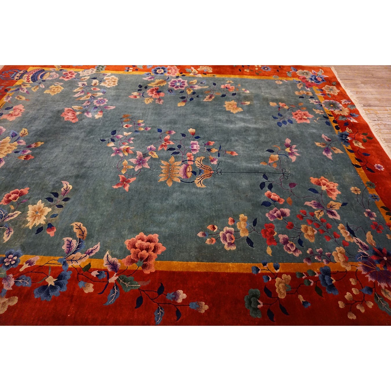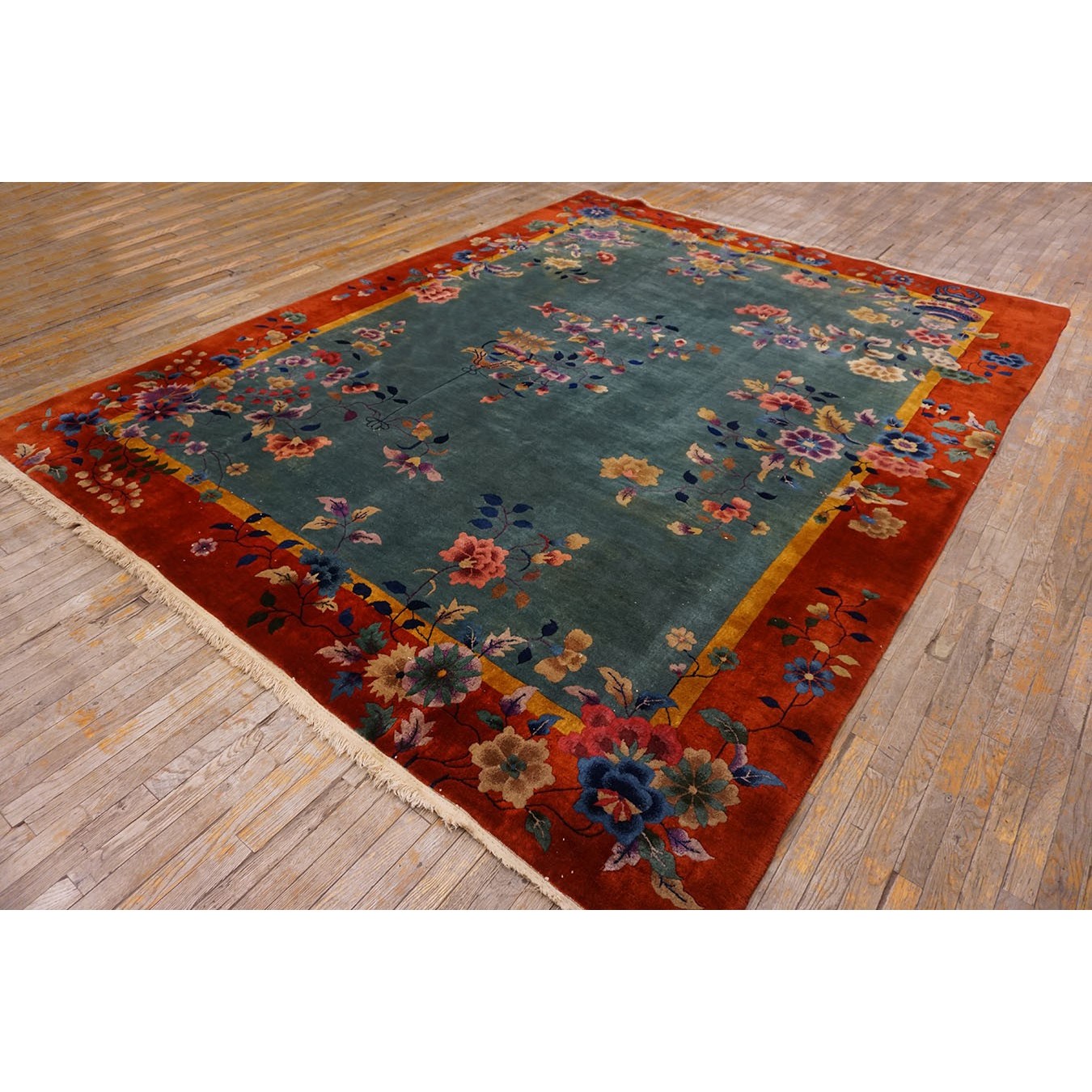 DescriptionChineseCarpets made in China proper. See entries Ningshia, Peking, Art Deco. Chinese - Art DecoAs the name implies, pieces woven between the wars for the Western market by mostly American owned firms especially Nichols and Fette, in thick heavy weaves using strong colors, asymmetric patterns and downplaying the Chinese-ness of the carpet. Nichols rugs are more strong toned than the pastel Fette. Most were woven in the coastal port city of Tientsin. Other lesser known workshops were also active. Some pieces are ultra-geometric and haute-Deco moderne in character: these are very rare. More frequent are pieces with bits of Chinese ornament: vases or other precious objects, paeonies, vines, fences, etc. Most common is the 9 x 12 size, in colors never found in mainstream Chinese rugs: backgrounds in black, mauve, purple, hot pink, orange, olive, employing the best synthetic chrome dyes of the period. Prices are still reasonable and carpets in top condition are available. | |