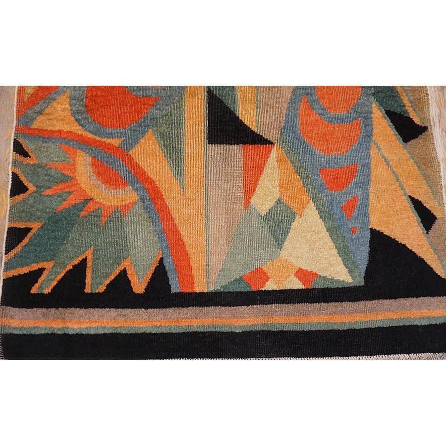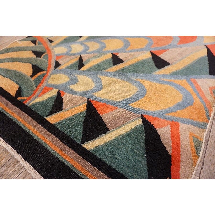 DescriptionChineseCarpets made in China proper. See entries Ningshia, Peking, Art Deco. Chinese - Art DecoAs the name implies, pieces woven between the wars for the Western market by mostly American owned firms especially Nichols and Fette, in thick heavy weaves using strong colors, asymmetric patterns and downplaying the Chinese-ness of the carpet. Nichols rugs are more strong toned than the pastel Fette. Most were woven in the coastal port city of Tientsin. Other lesser known workshops were also active. Some pieces are ultra-geometric and haute-Deco moderne in character: these are very rare. More frequent are pieces with bits of Chinese ornament: vases or other precious objects, paeonies, vines, fences, etc. Most common is the 9 x 12 size, in colors never found in mainstream Chinese rugs: backgrounds in black, mauve, purple, hot pink, orange, olive, employing the best synthetic chrome dyes of the period. Prices are still reasonable and carpets in top condition are available. | |